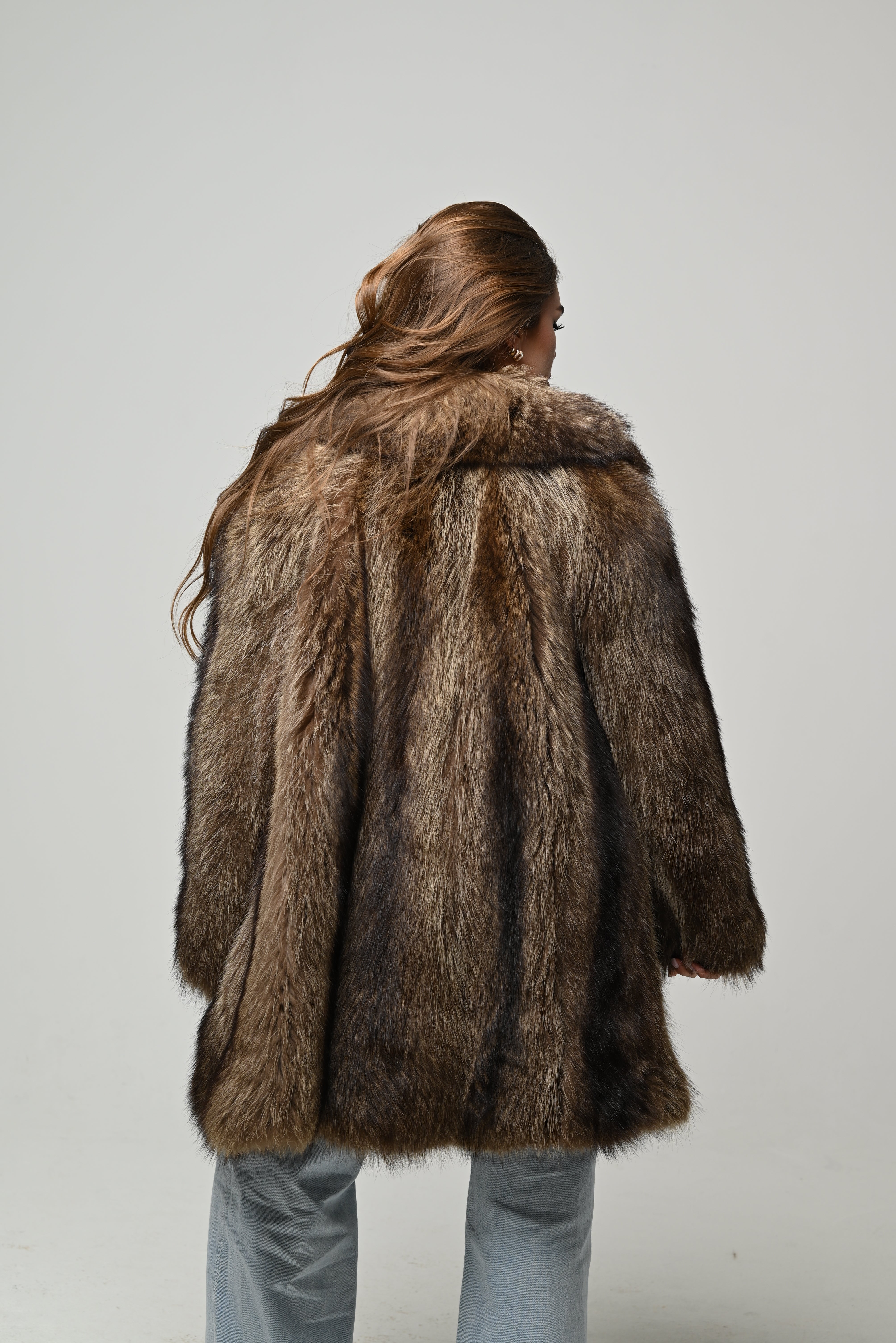 Pelliccia vintage in vera marmotta naturale, dal taglio morbido e avvolgente. Colore marrone intenso con sfumature più scure, pelo folto e corposo che dona subito carattere al look. Capo caldo e strutturato, ideale sia per outfit casual che più ricercati. Vestibilità comoda.