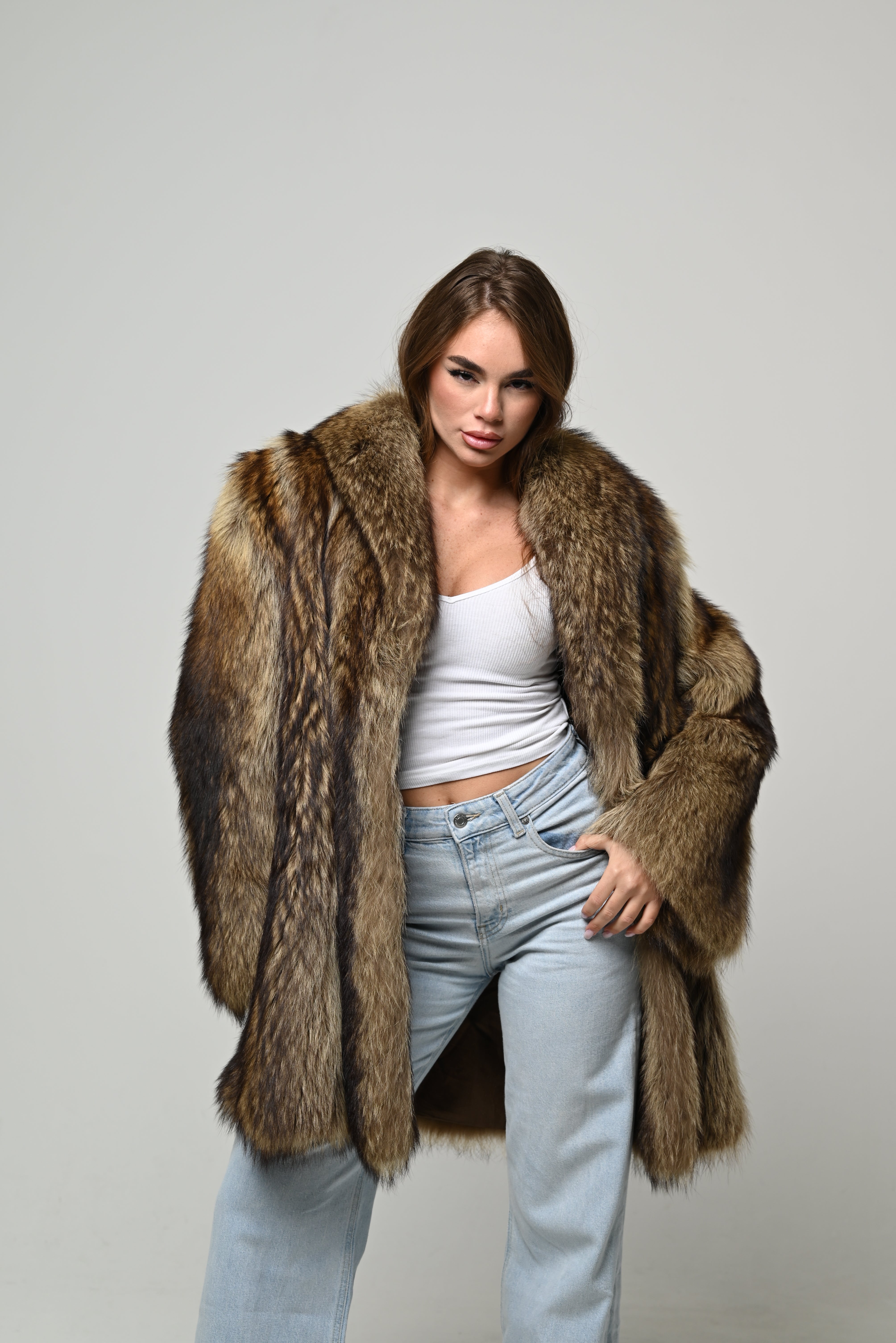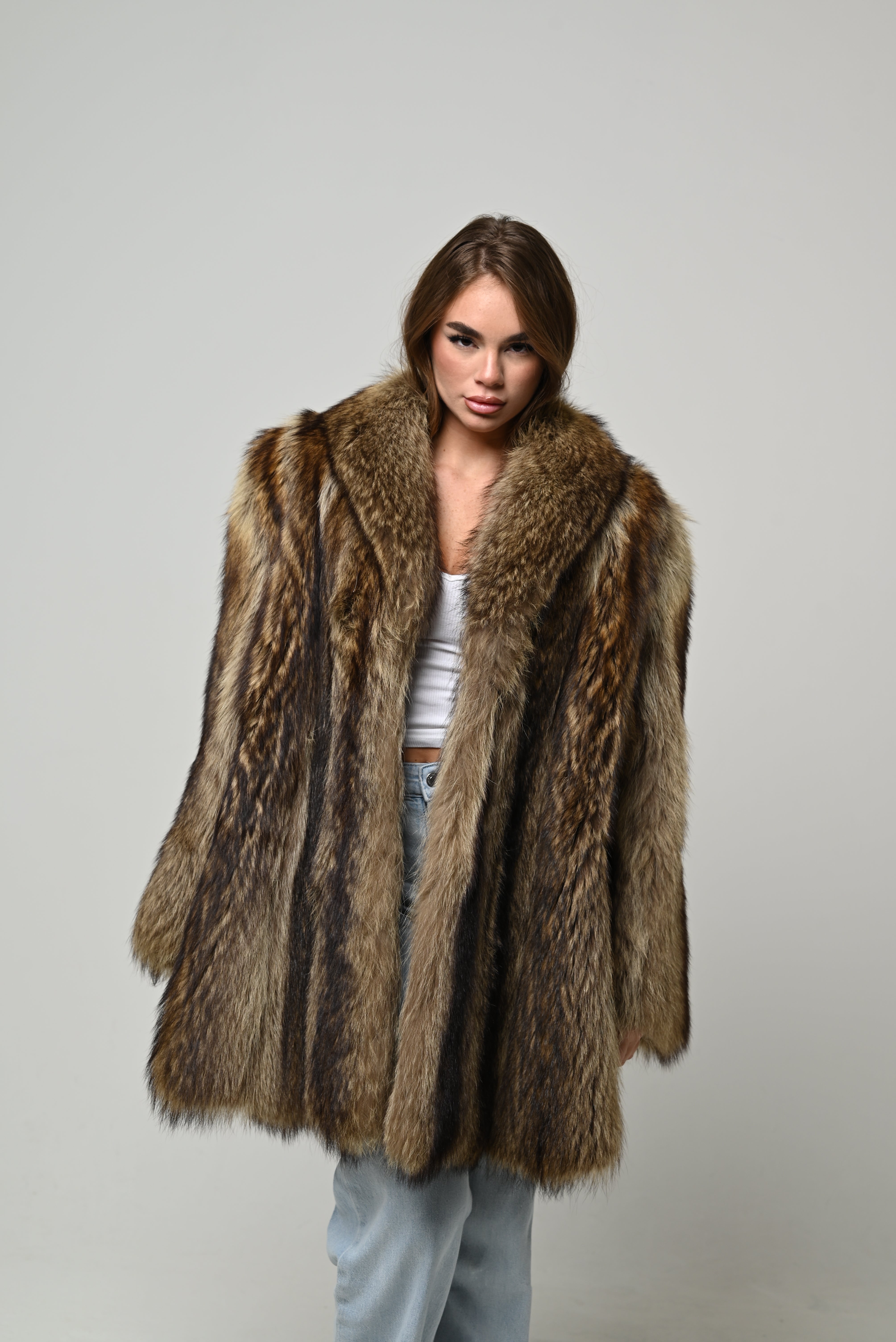 Pelliccia vintage in vera pelliccia naturale di marmotta , modello medio con linea pulita e vestibilità morbida. Pelo lungo, pieno e ultra soffice, con sfumature naturali sui toni del marrone, caramello e nocciola che rendono il capo luminoso e super versatile. Lavorazione a fasce verticali che slancia la figura, con ampio collo sciallato e maniche morbide. Chiusura frontale invisibile e interno foderato per maggiore comfort.