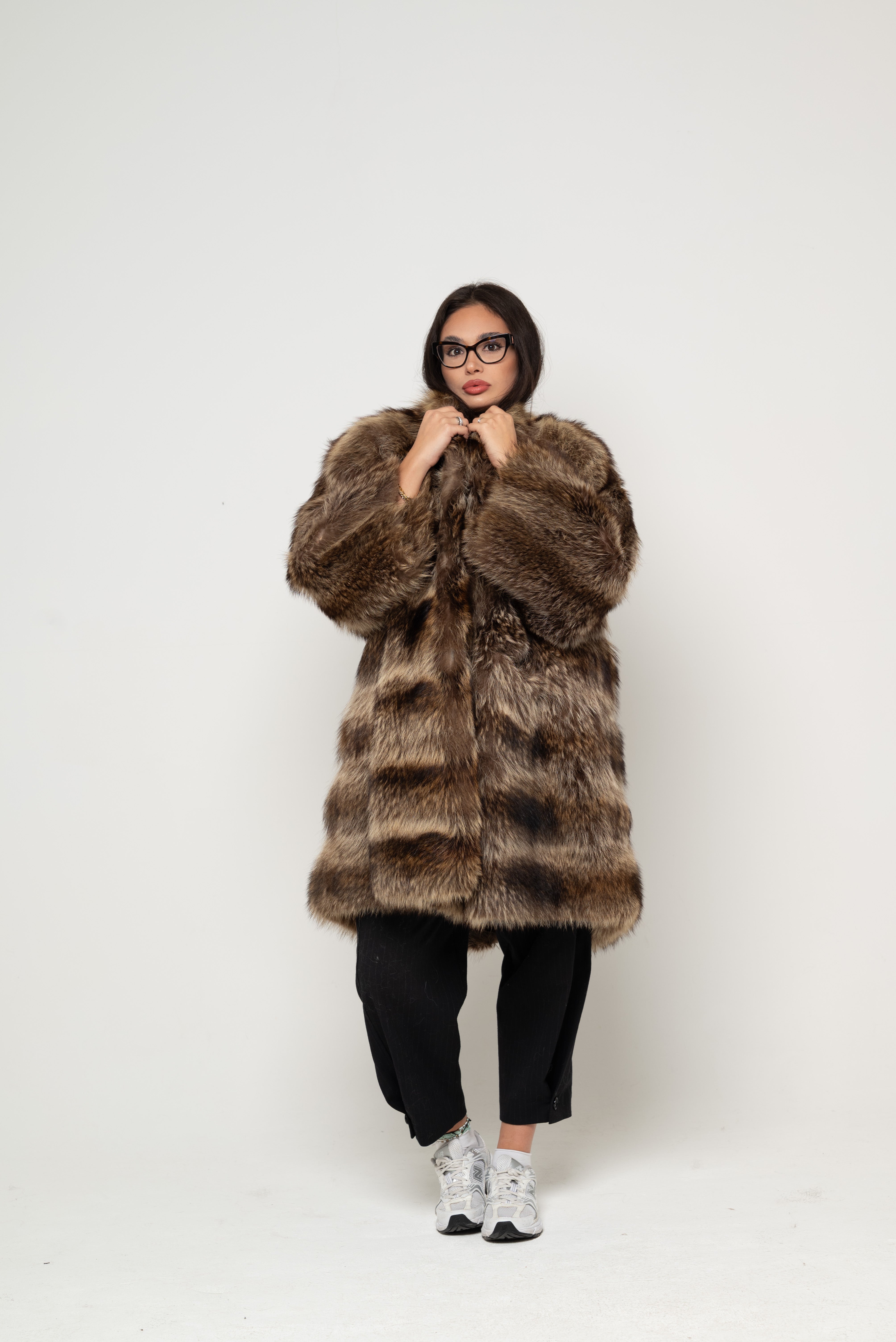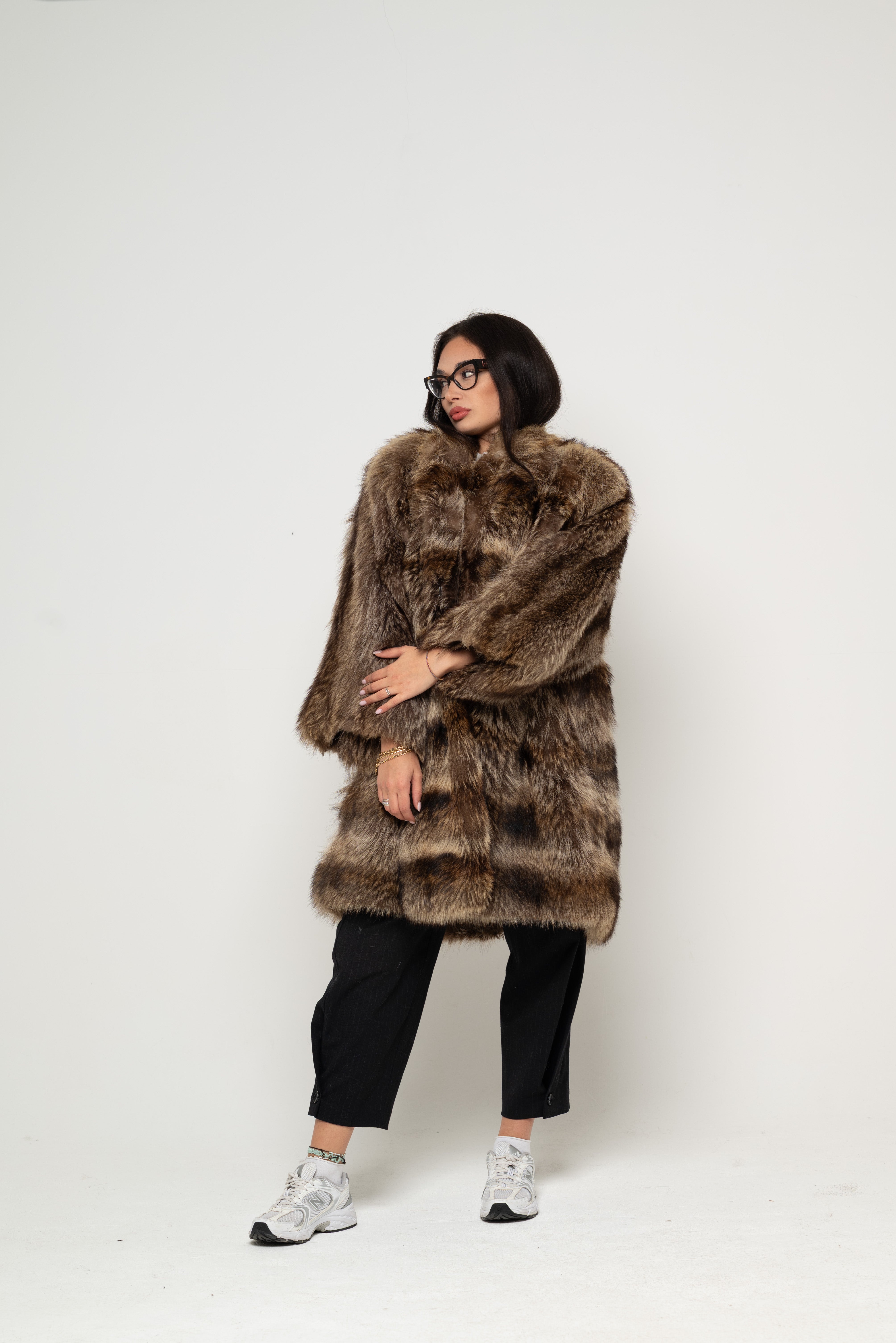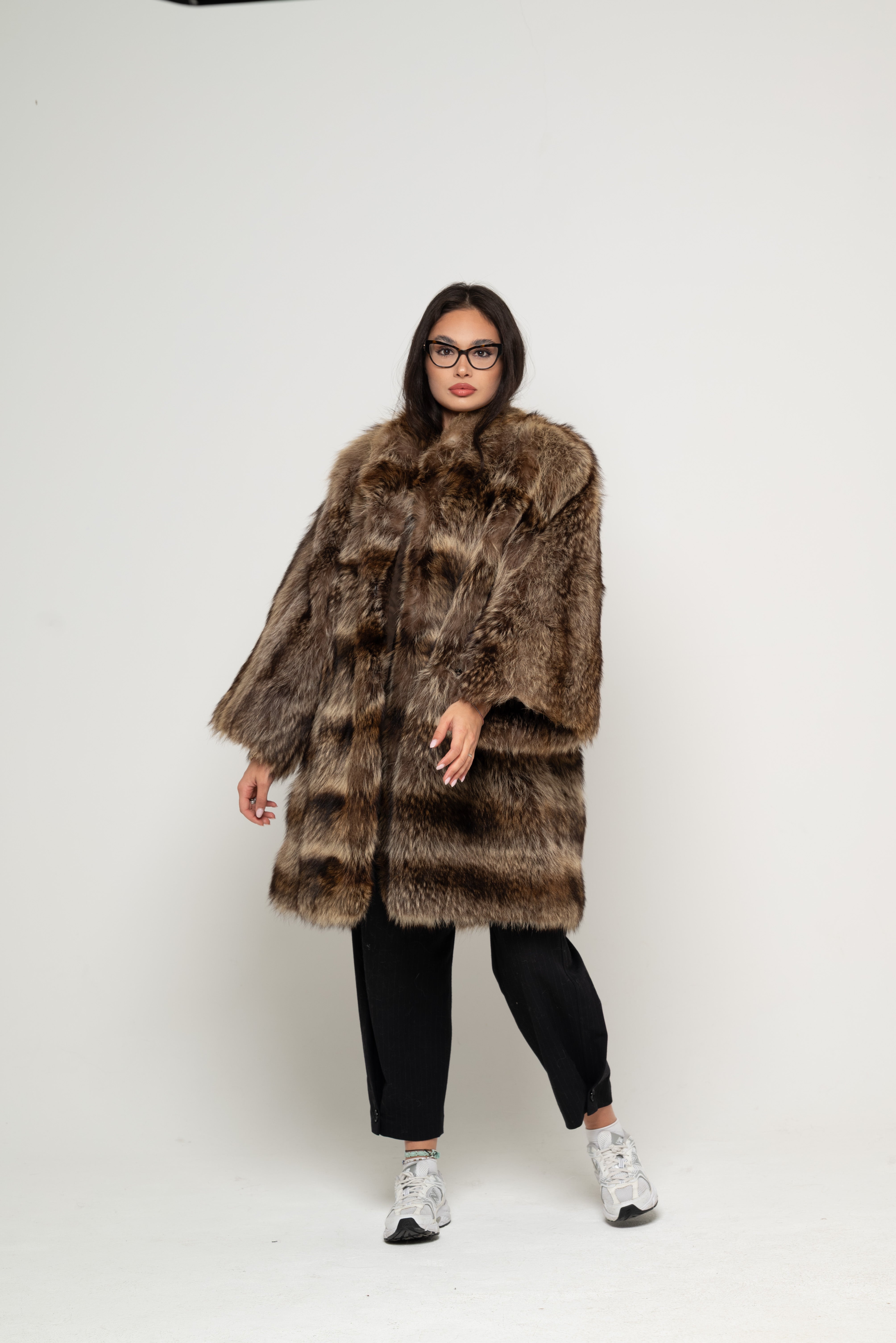 La pelliccia in marmotta naturale presenta un taglio lungo e ampio, con colletto voluminoso e maniche morbide. Il manto, caratterizzato da sfumature naturali bruno–dorate con venature più scure, dona un effetto ricco, caldo e avvolgente, perfetto per uno stile elegante e deciso.