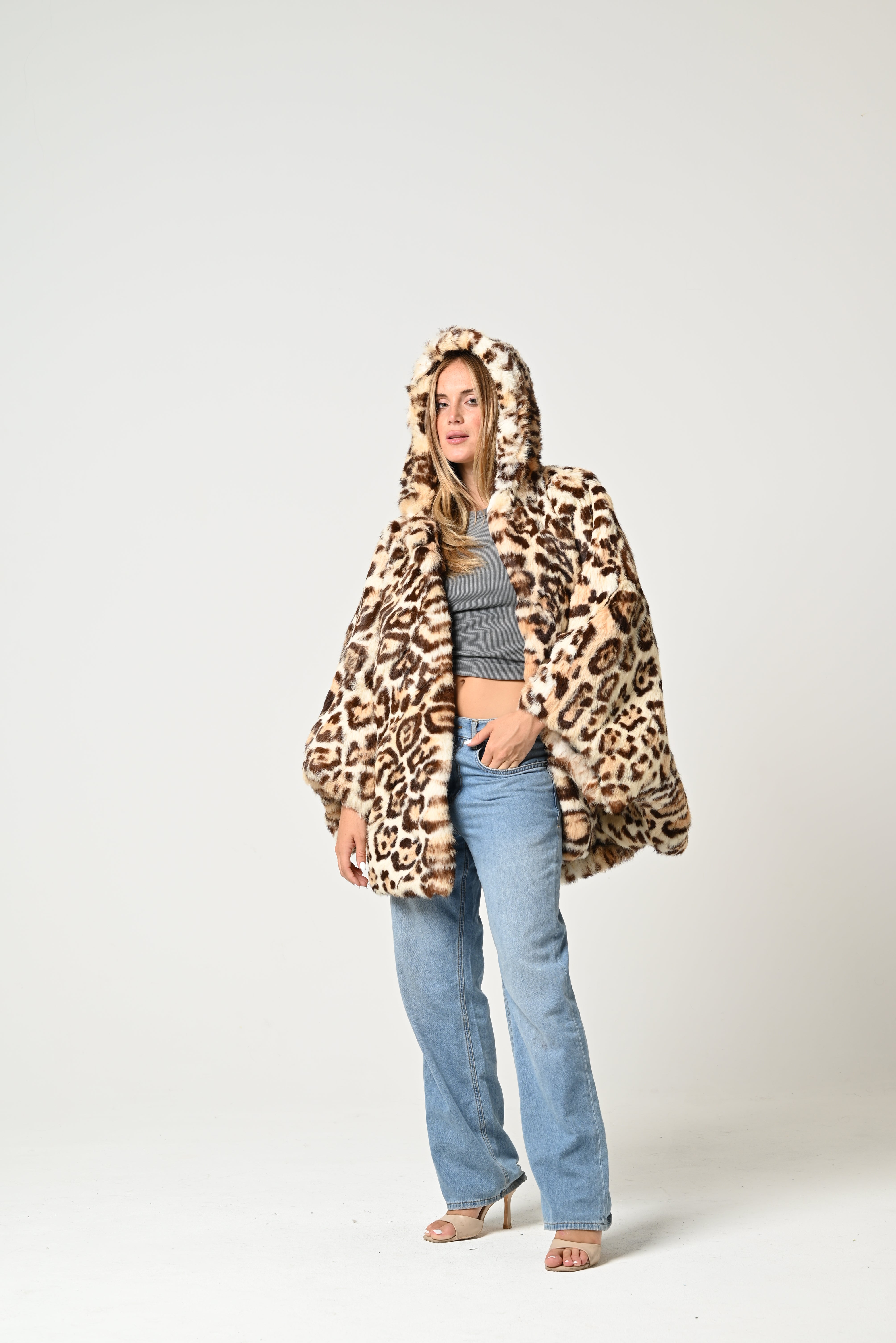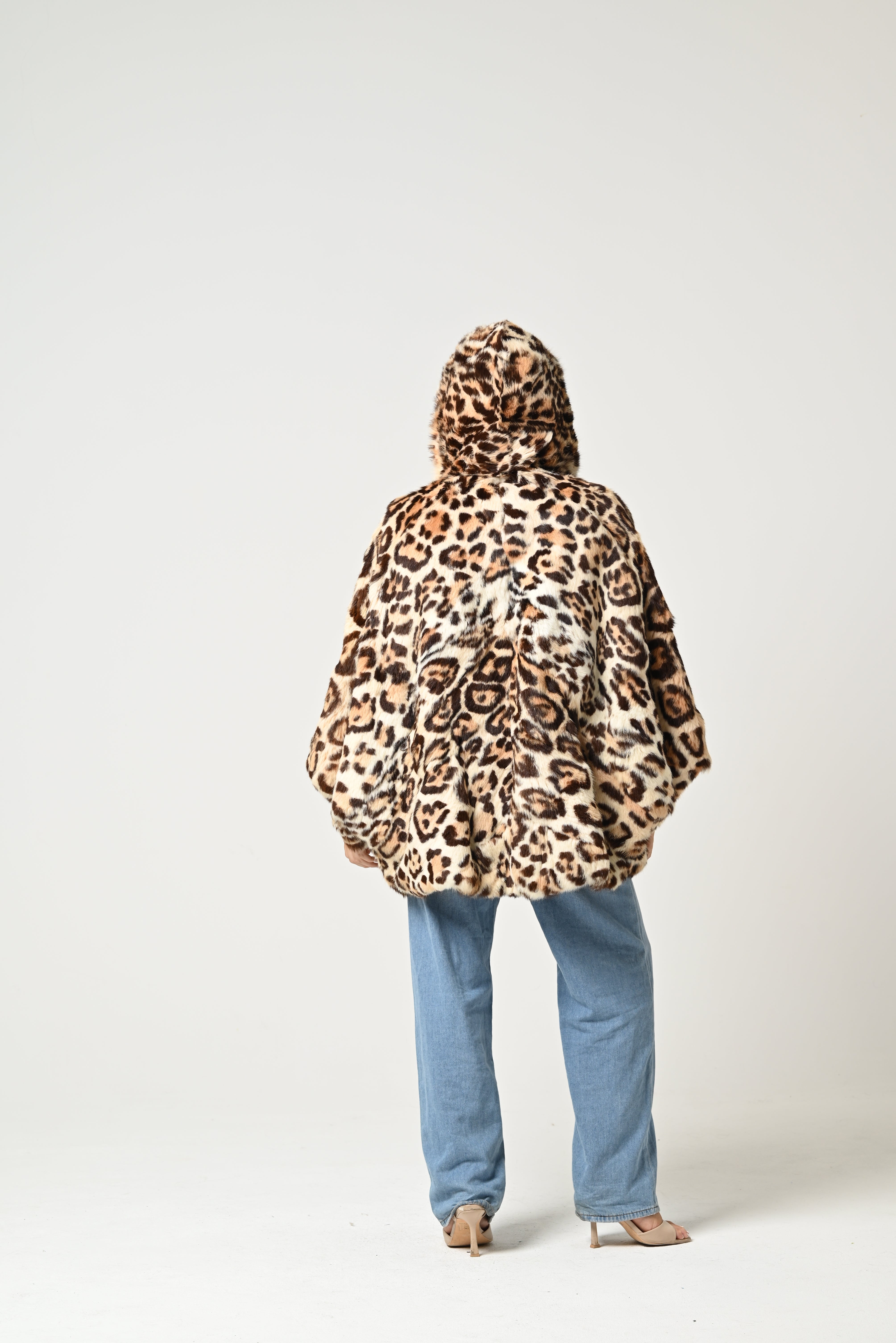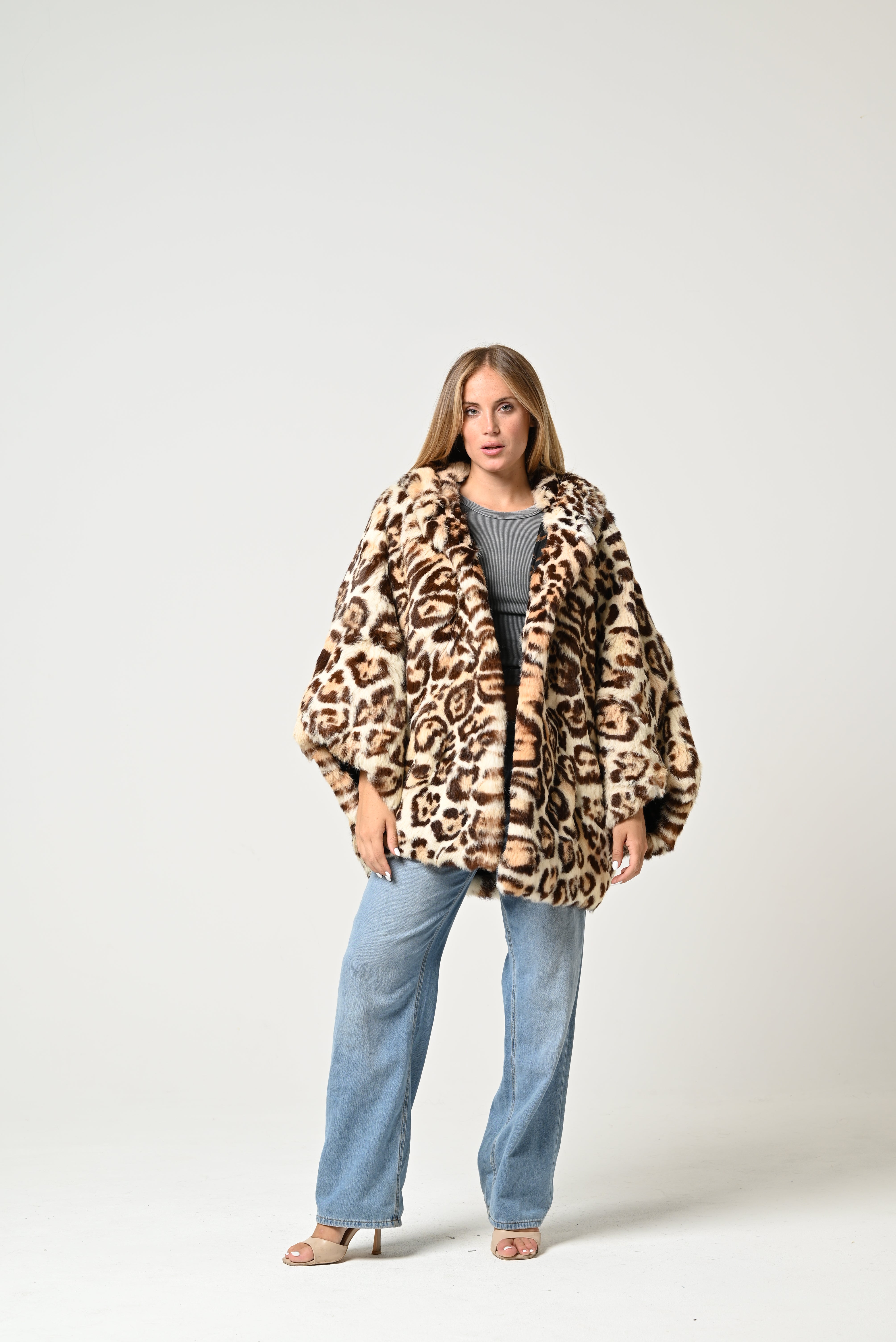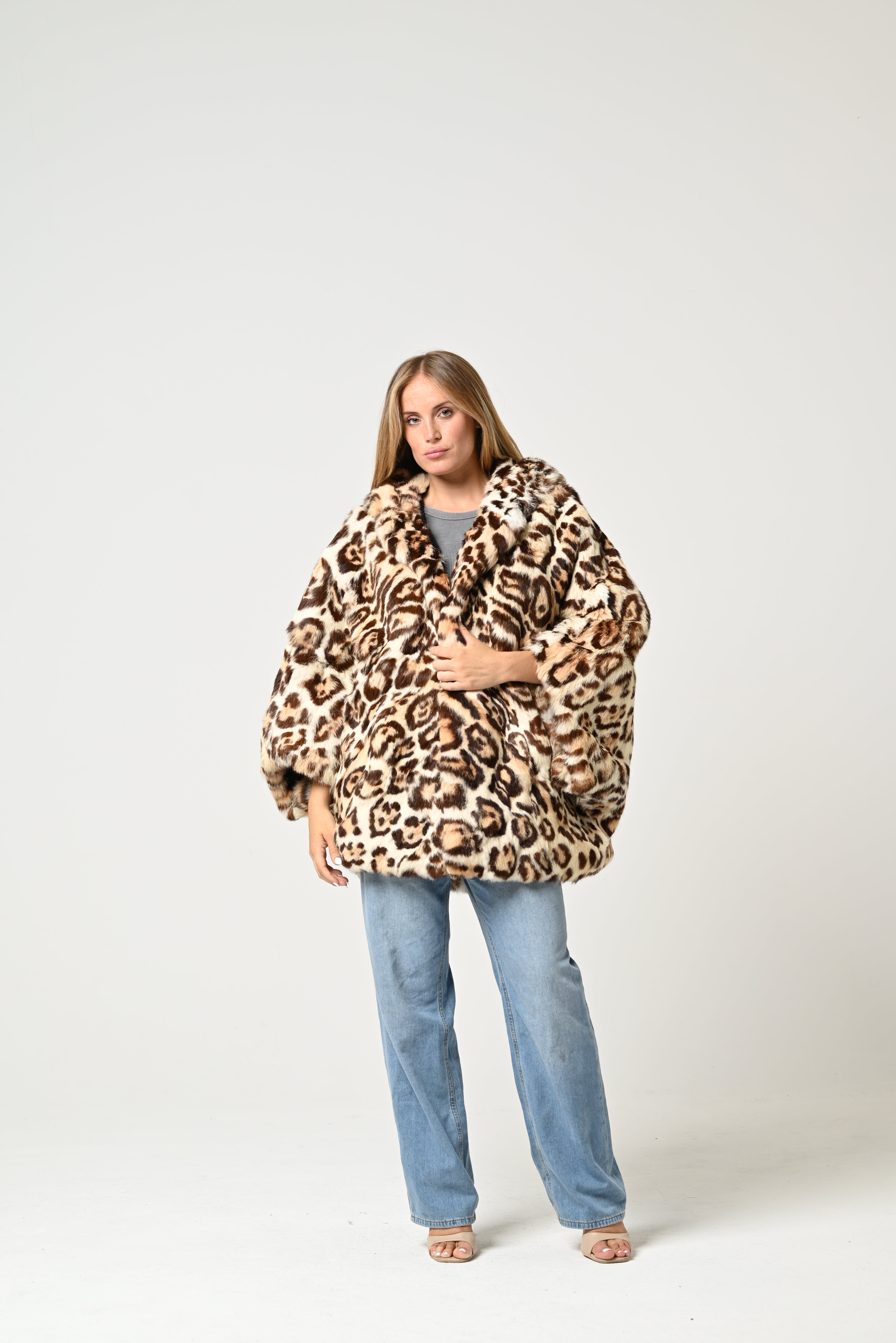 La pelliccia è corta e molto voluminosa, con fantasia maculata leopardata nei toni del beige, marrone e nero. Ha un ampio collo e un aspetto soffice e scenografico, che le dona un carattere deciso e vistoso.
