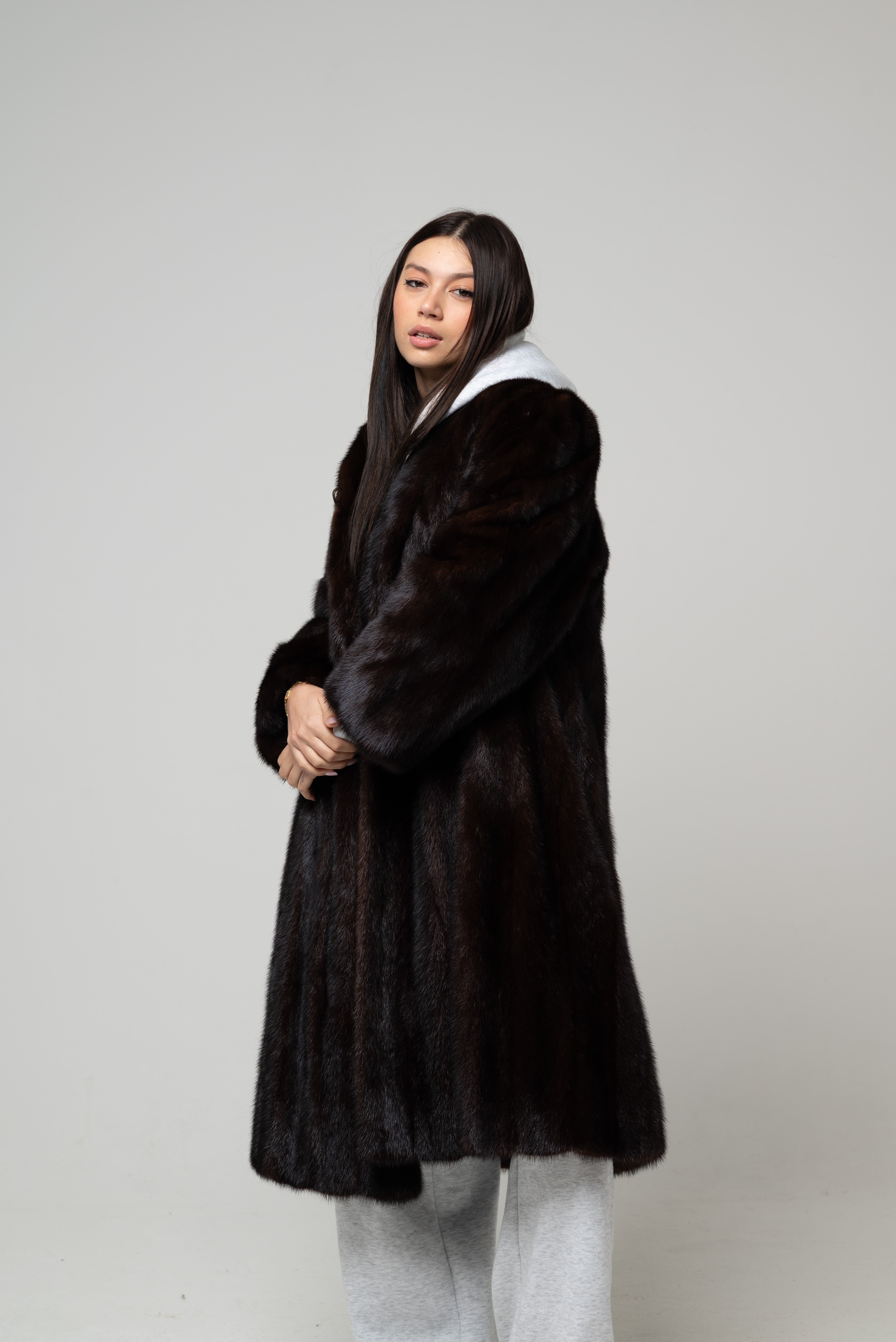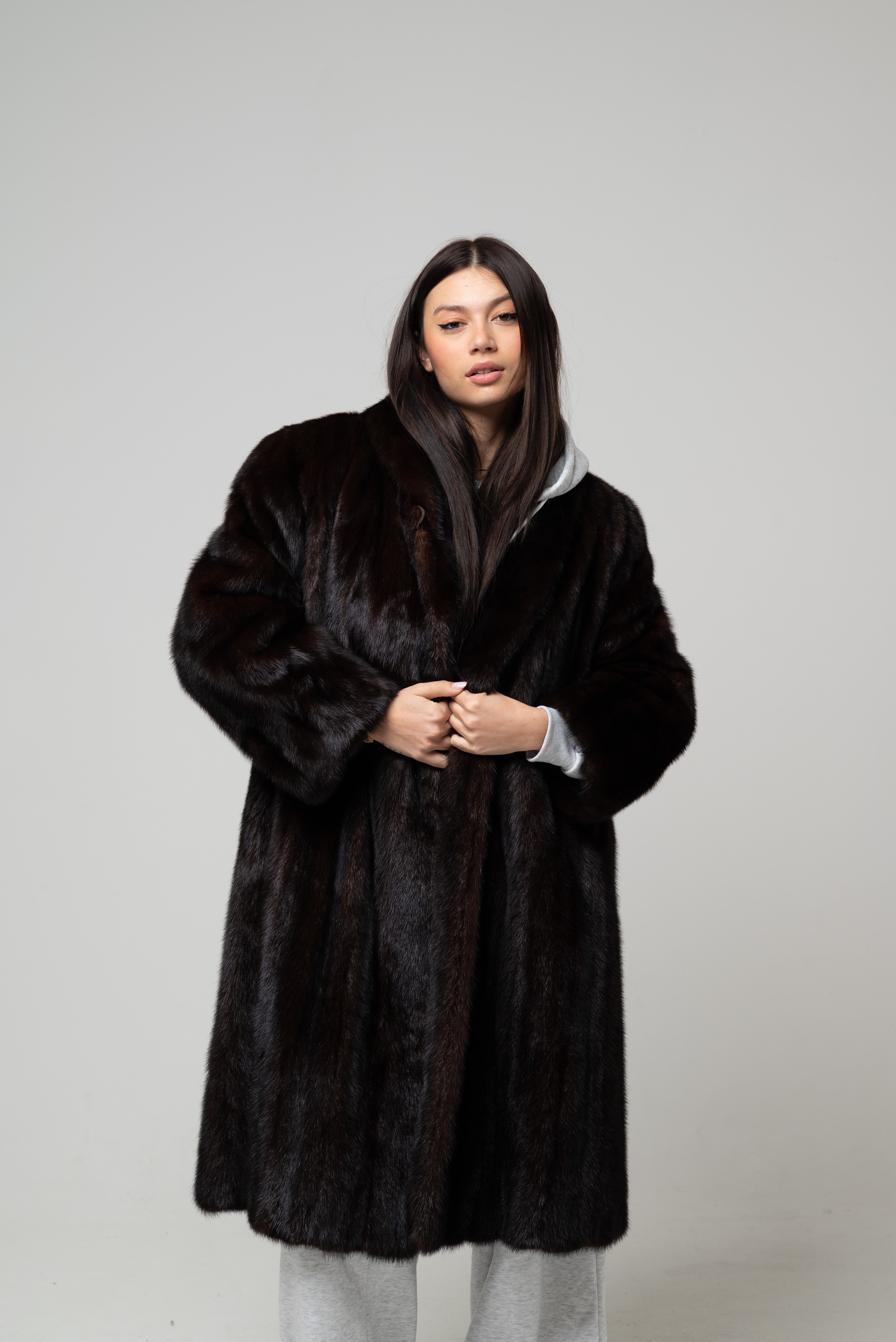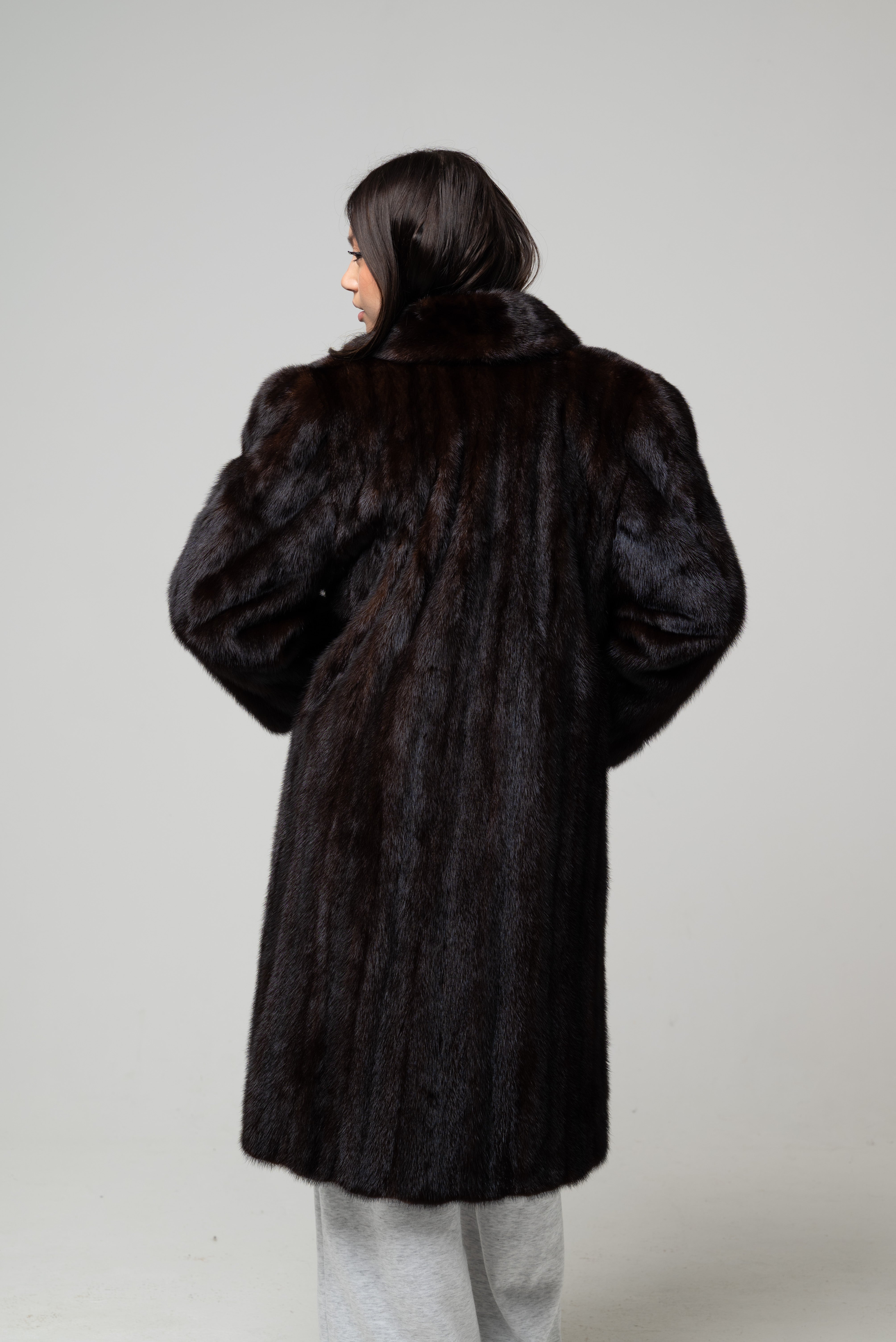 Pelliccia nuova in vera pelliccia naturale, modello lungo dalla linea morbida e fluida con vestibilità regolare. Il pelo è fitto, compatto e setoso, caratterizzato da una profonda tonalità marrone scuro intenso con leggere sfumature calde che donano eleganza e luminosità al capo.