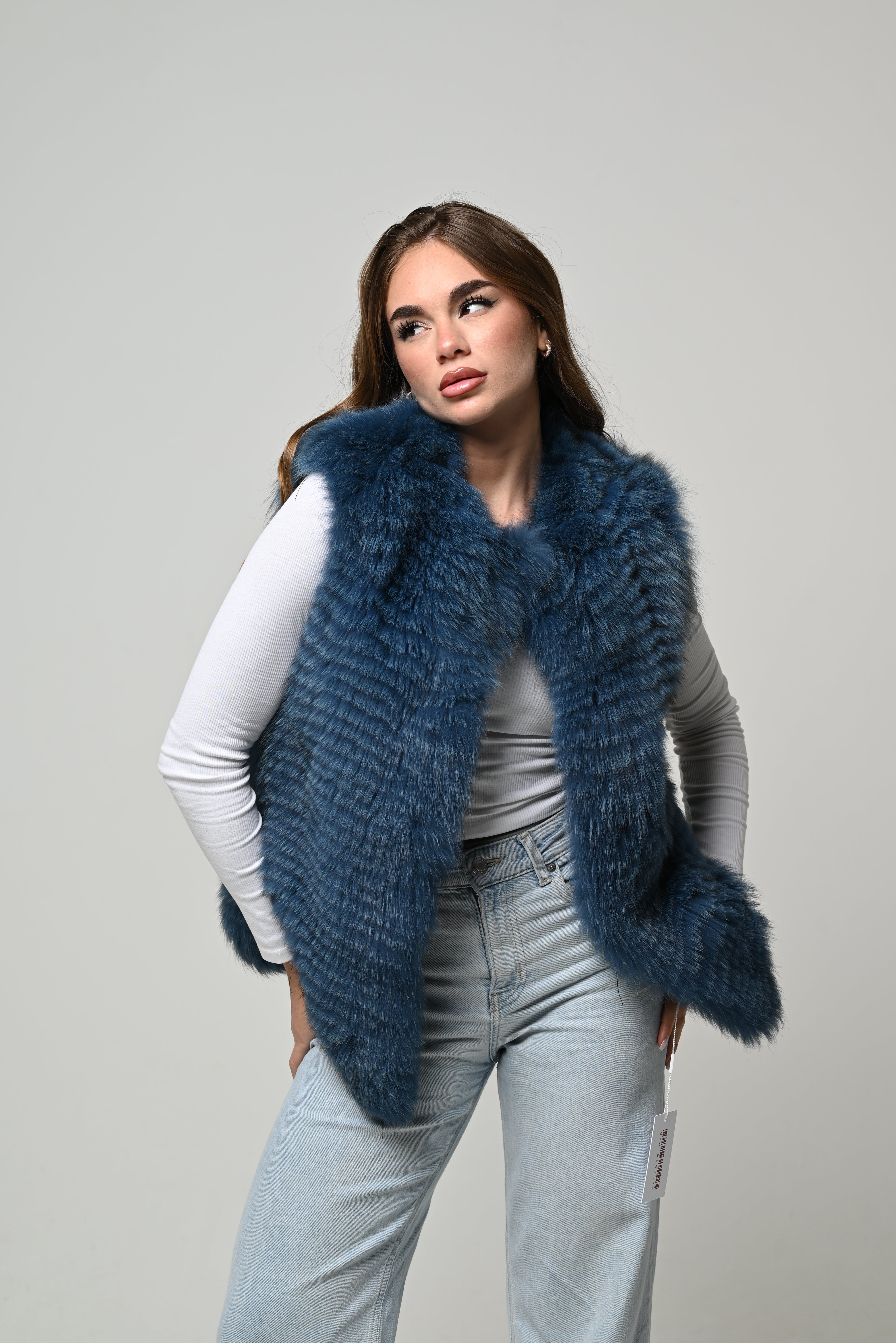 Gilet nuovo in vera pelliccia naturale di volpe, modello lungo con linea dritta e vestibilità regolare. Pelo lungo, pieno e ultra soffice, in una intensa tonalità blu petrolio con leggere sfumature più scure che donano profondità e carattere al colore. Lavorazione a fasce orizzontali che crea movimento, scollo aperto senza maniche per una silhouette slanciata e moderna. Chiusura frontale invisibile e interno foderato per un comfort ottimale.
