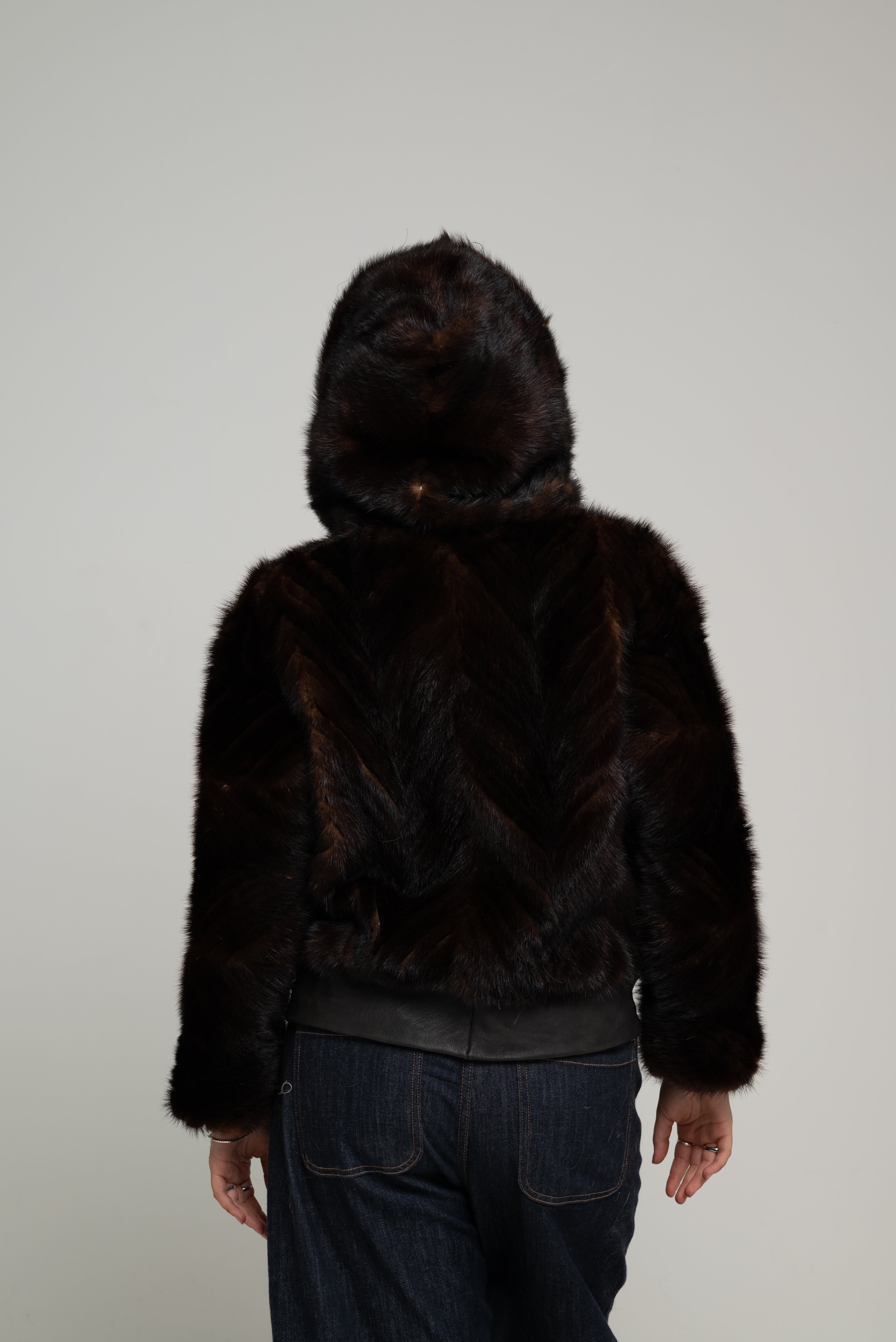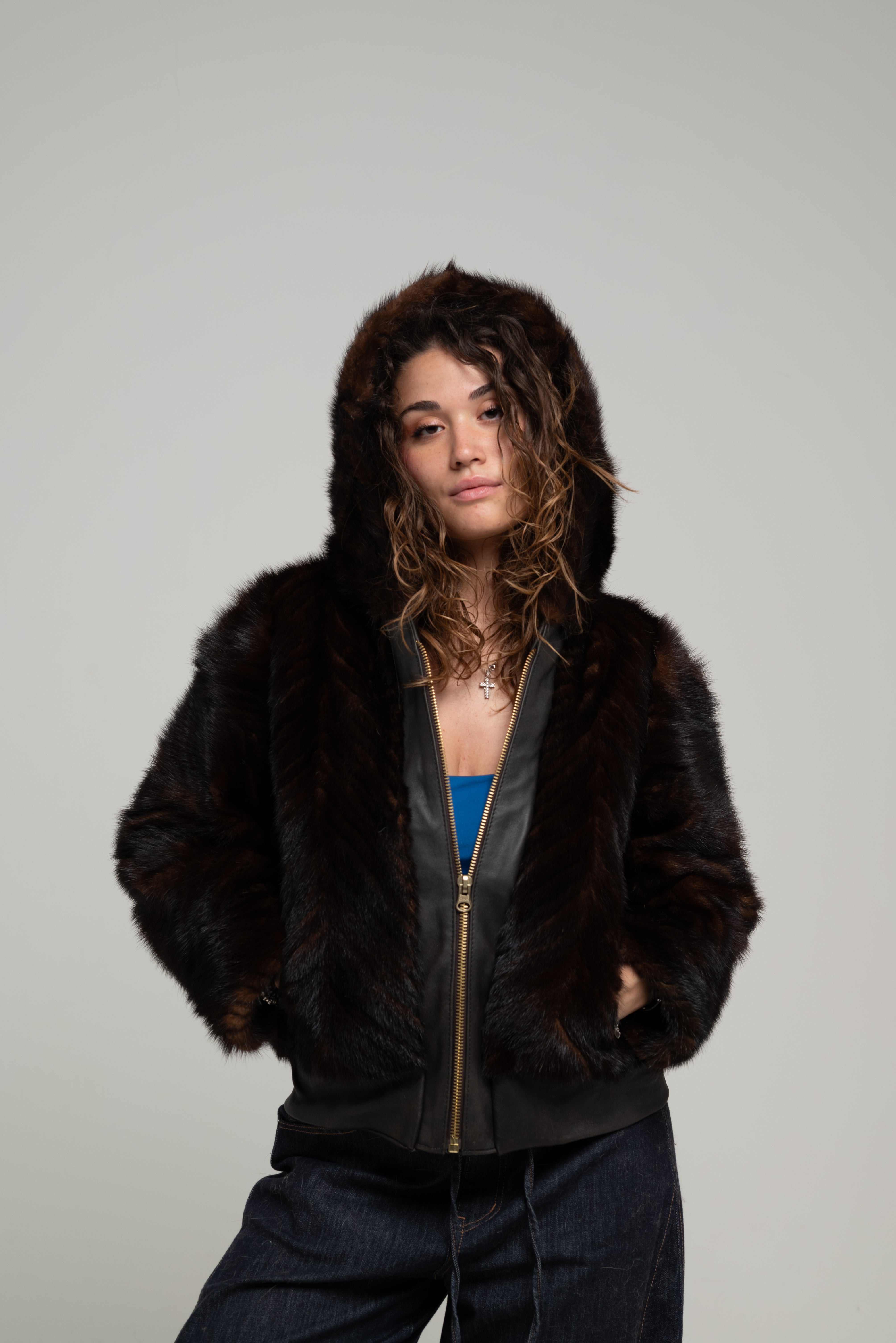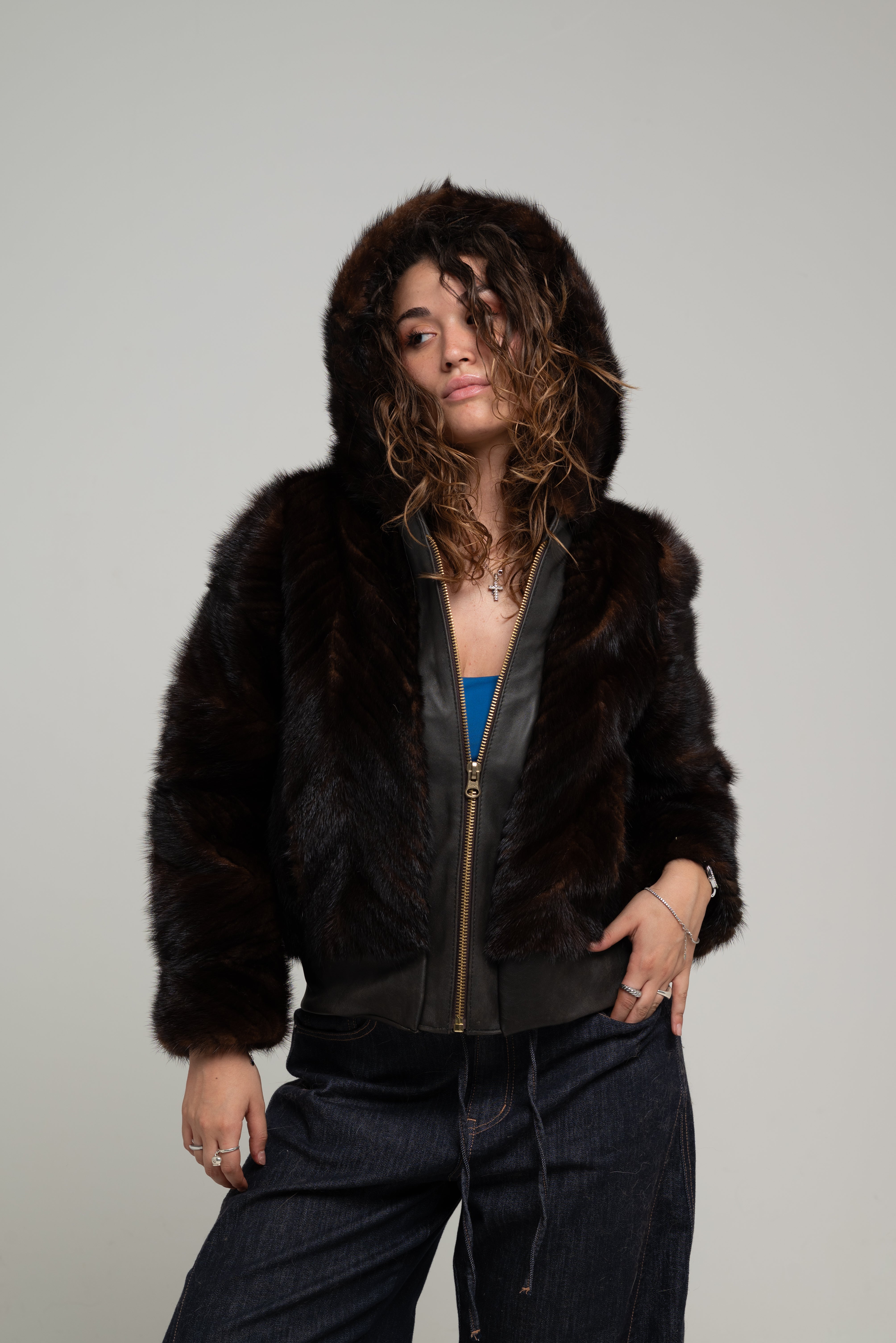 La pelliccia è corta con cappuccio, dal colore marrone molto scuro con riflessi caldi. Ha una zip centrale e finiture in pelle liscia lungo la chiusura e l’orlo, che le conferiscono un tocco moderno. Lo stile è elegante ma pratico, adatto a un look urbano e sofisticato.