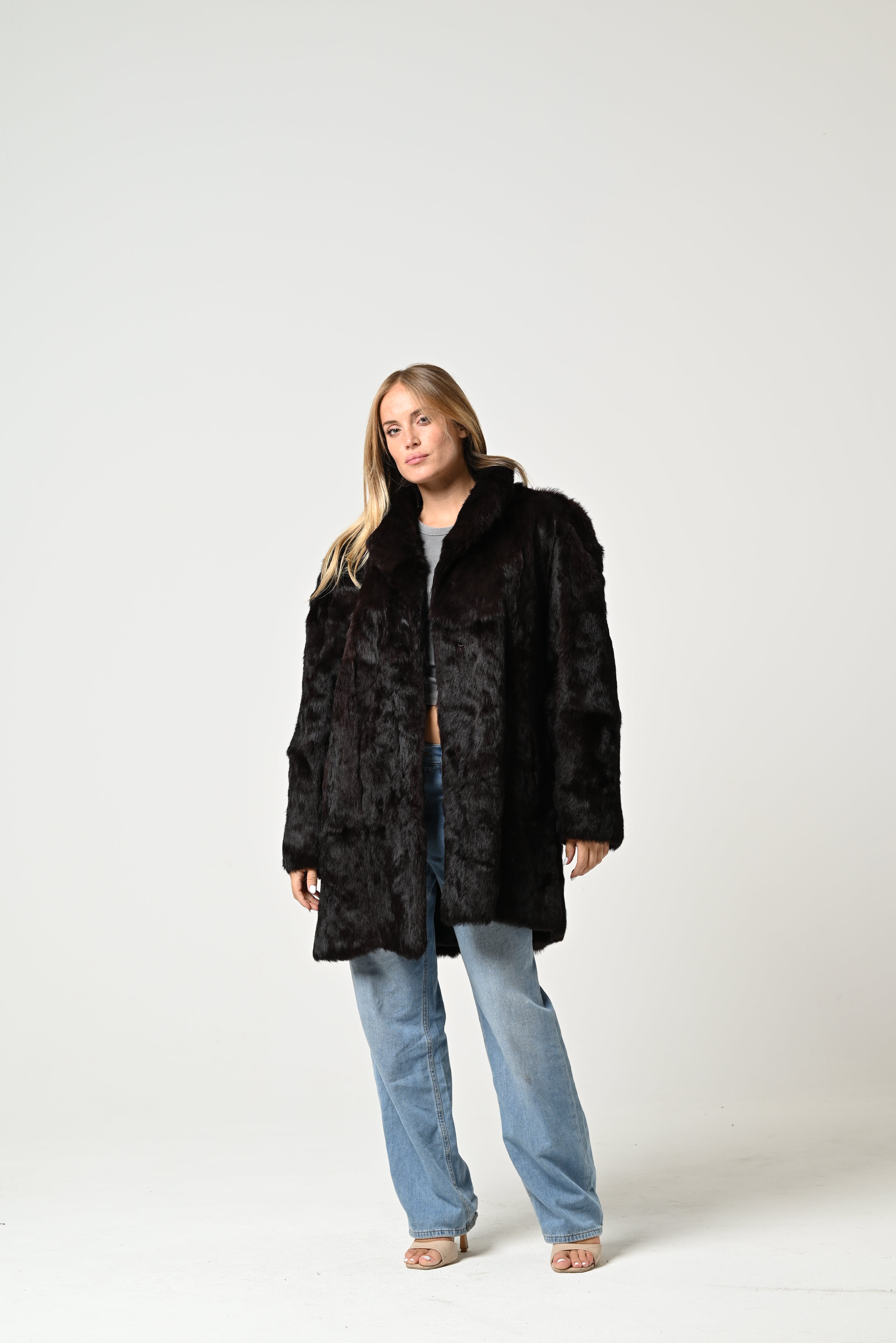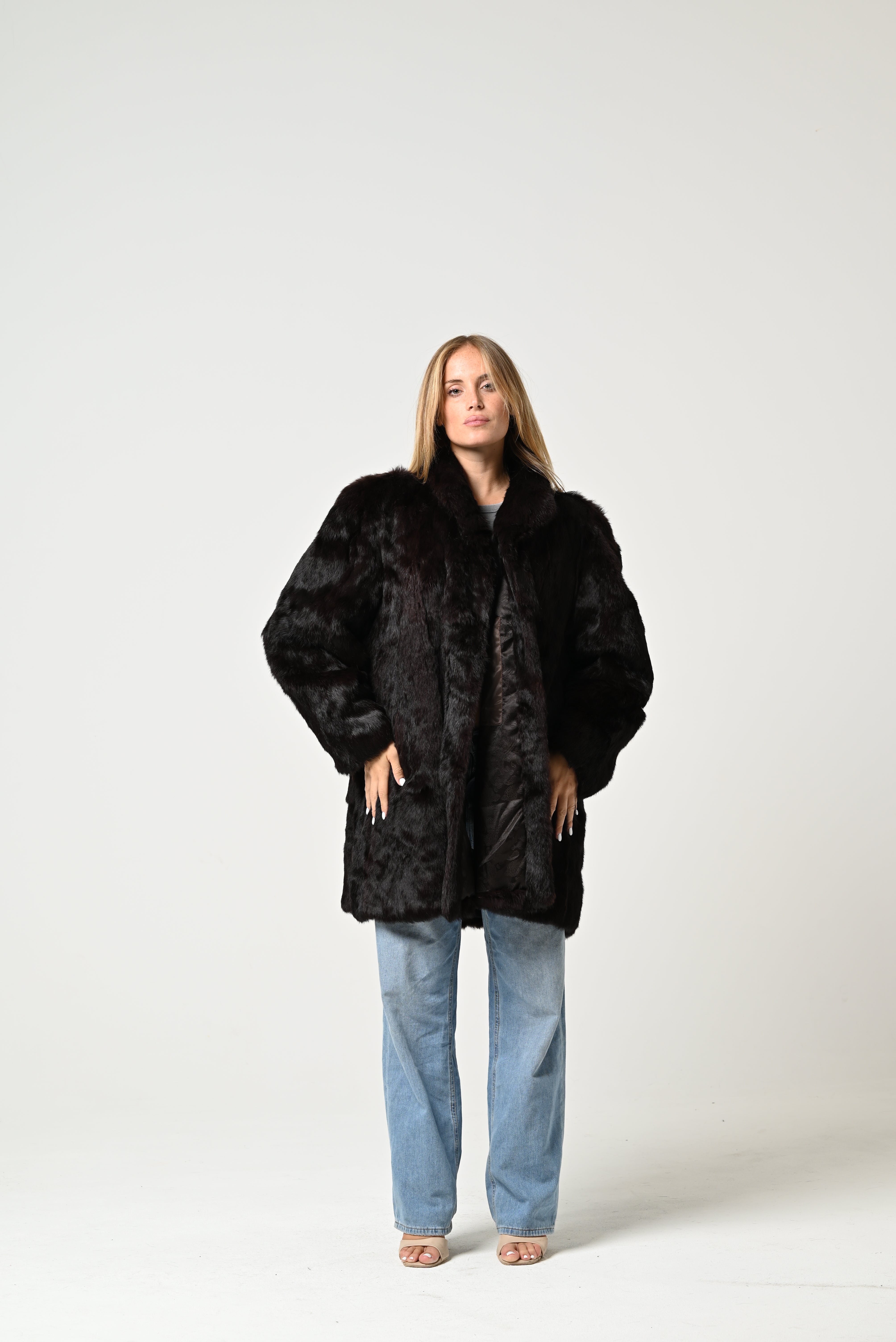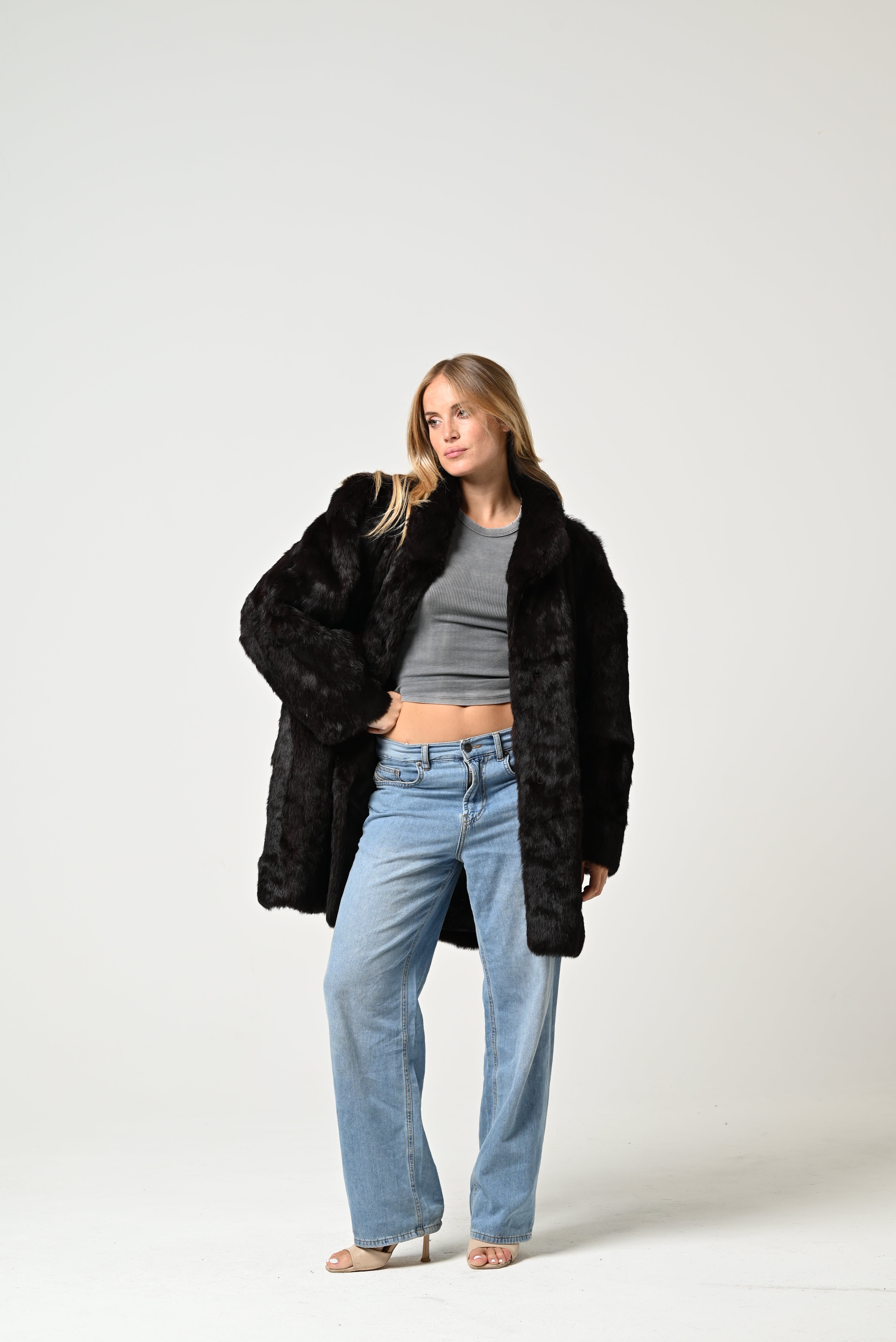 È una pelliccia nera dal taglio lungo e lineare, con collo morbido e maniche ampie, dall’effetto elegante e avvolgente.