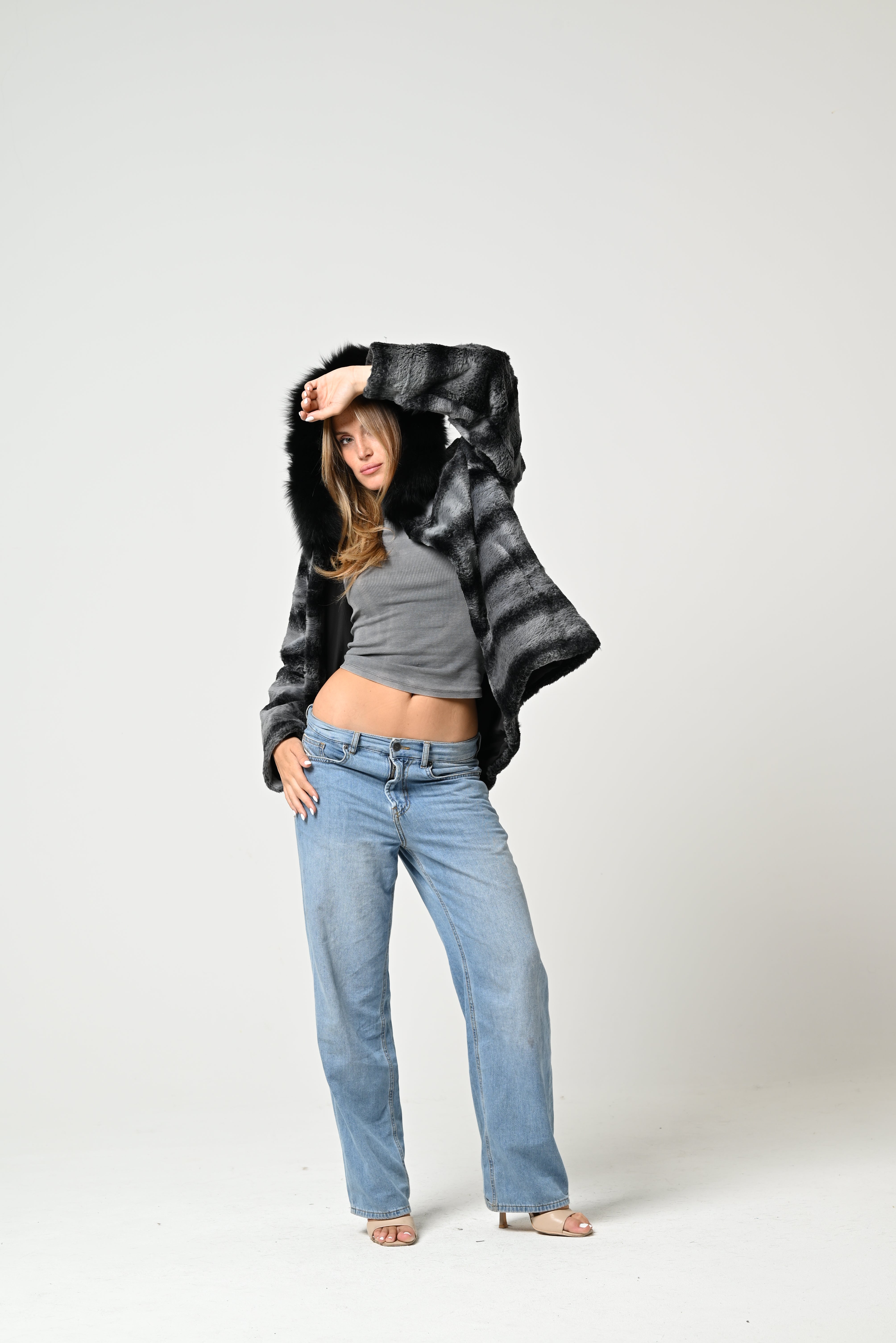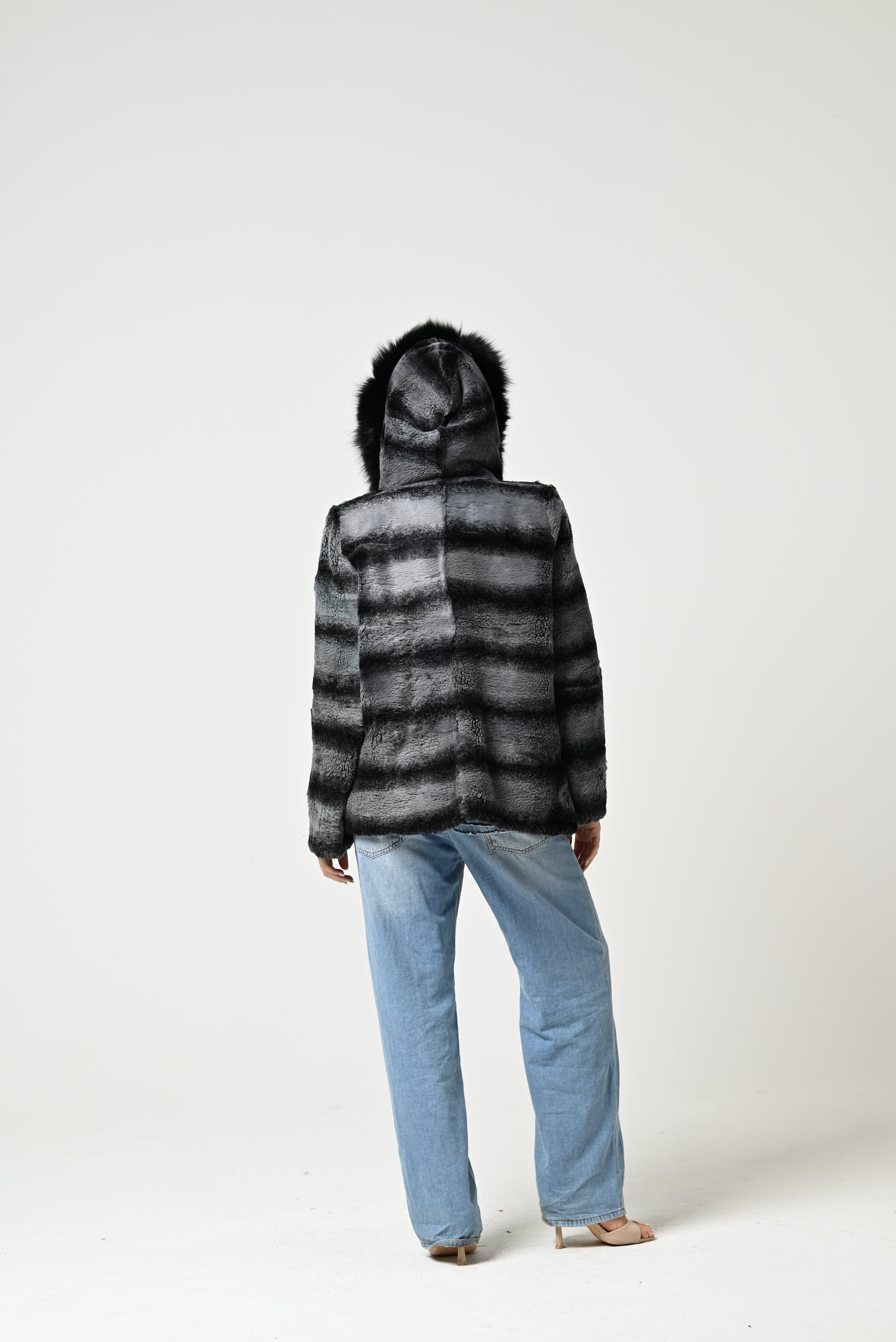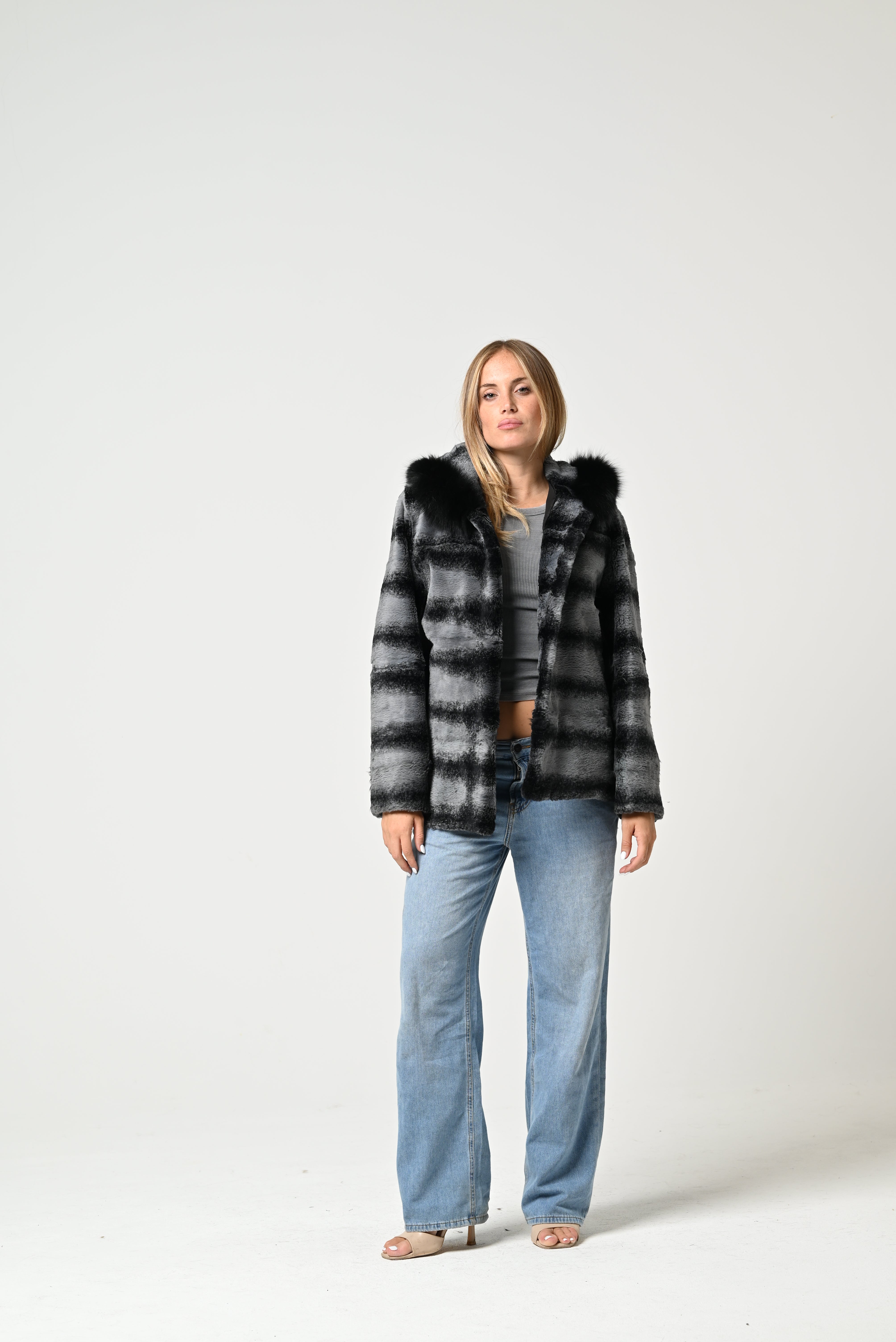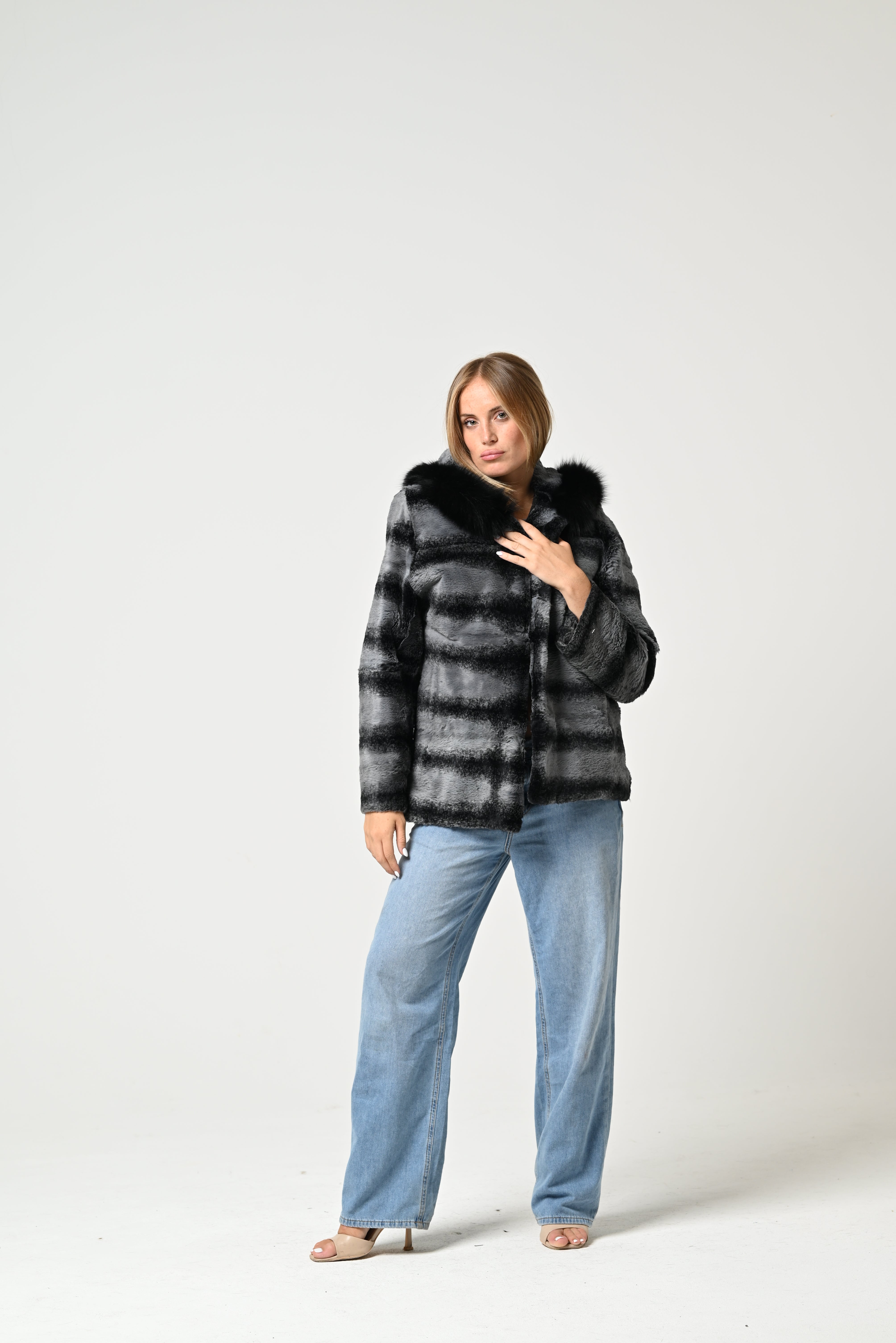 La pelliccia è corta, con taglio dritto, in pelo grigio con righe orizzontali più scure e colletto ampio in pelliccia nera.