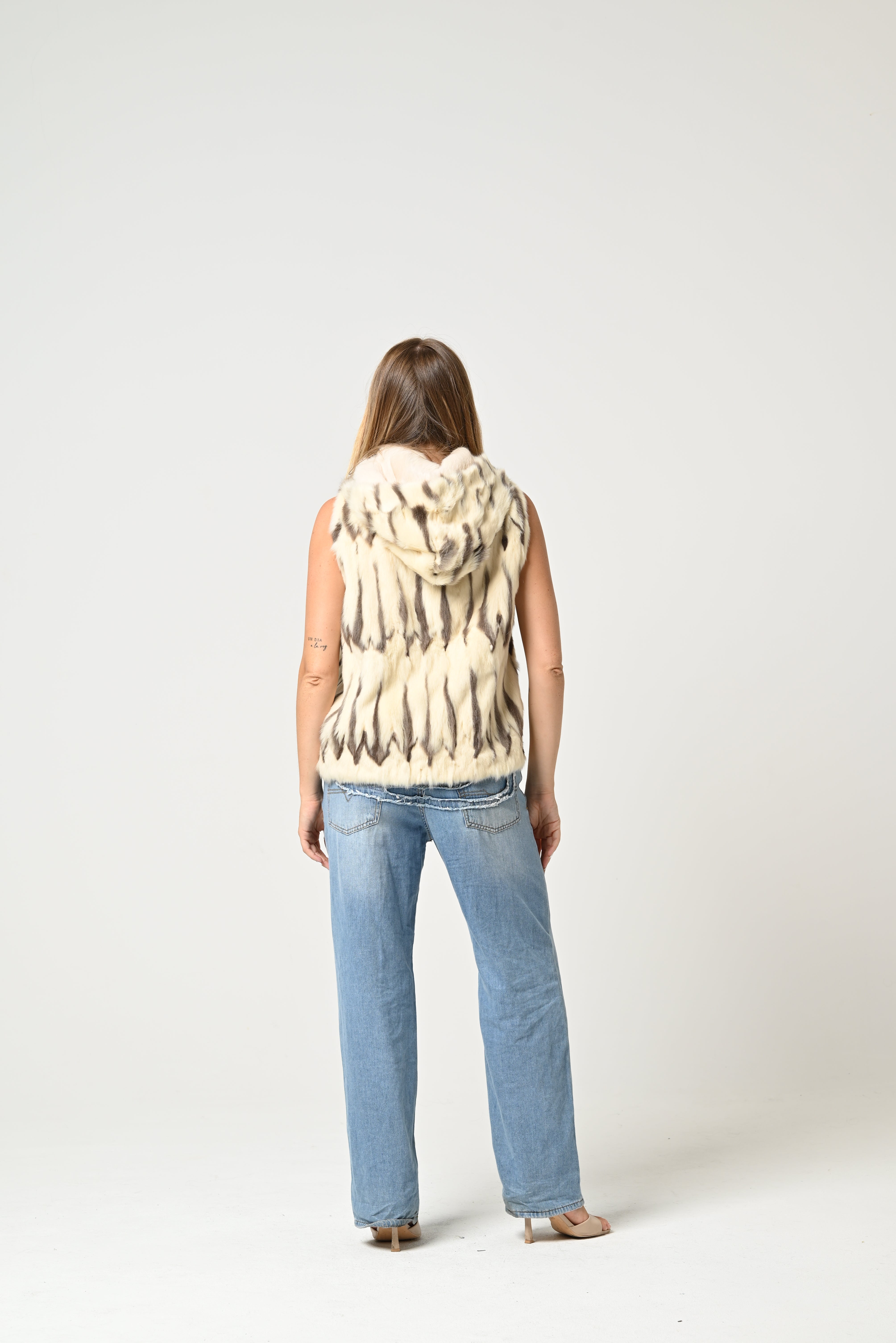 Qui la modella indossa un gilet in pelliccia chiara con motivo a righe verticali scure, chiuso con zip centrale e dotato di cappuccio. Il capo è abbinato a jeans chiari a gamba larga e sandali beige con tacco. Lo stile è più casual e leggero rispetto al cappotto precedente.