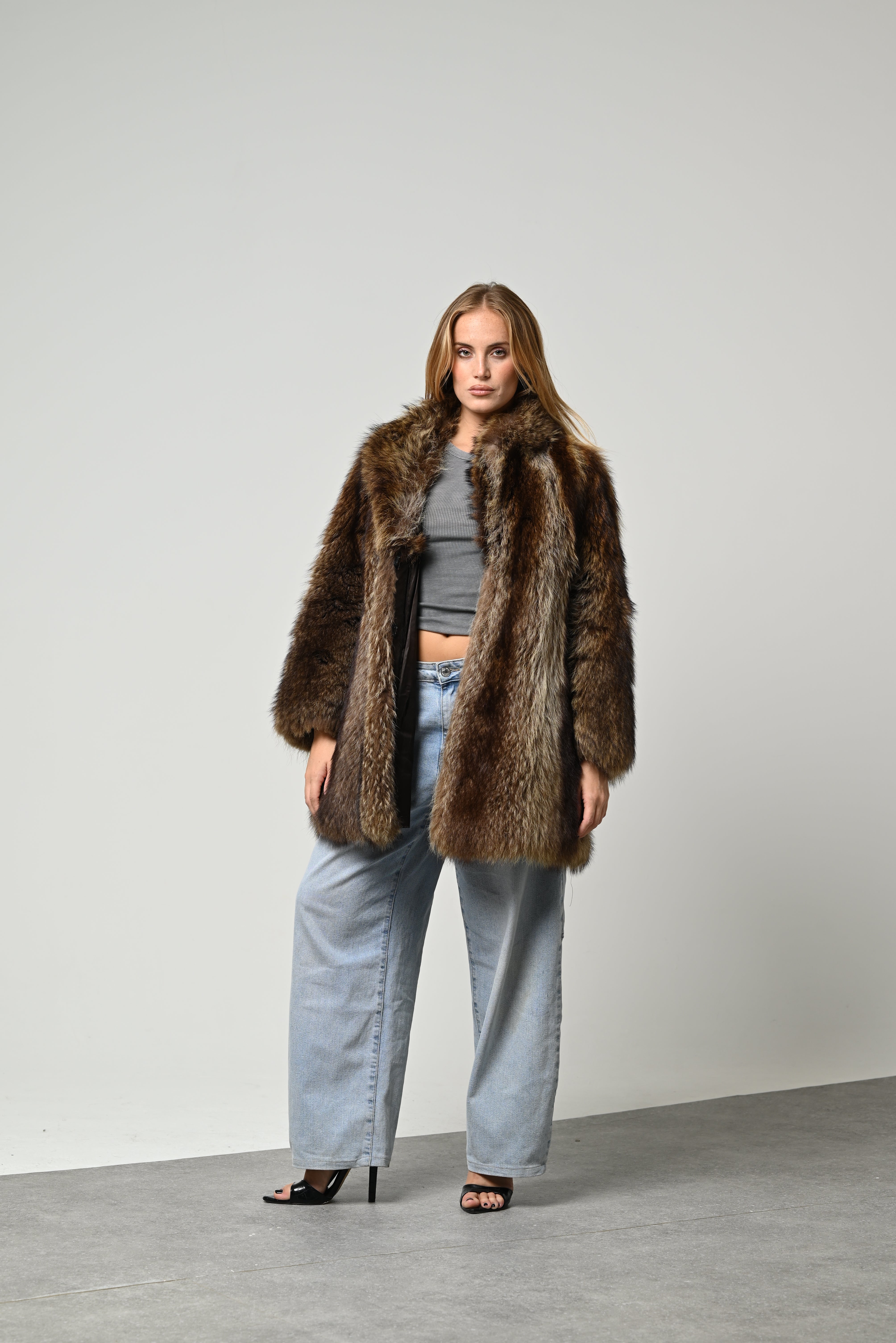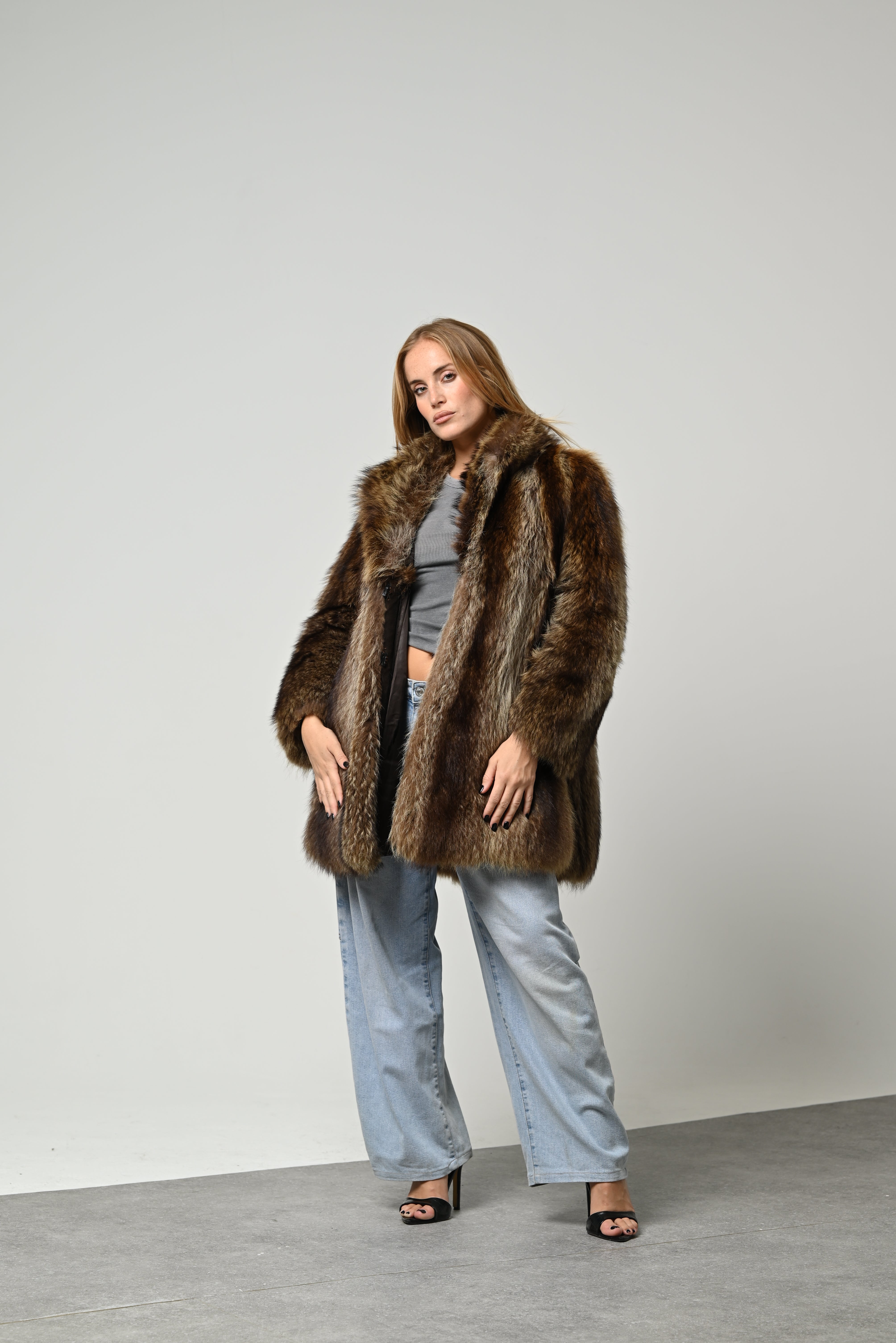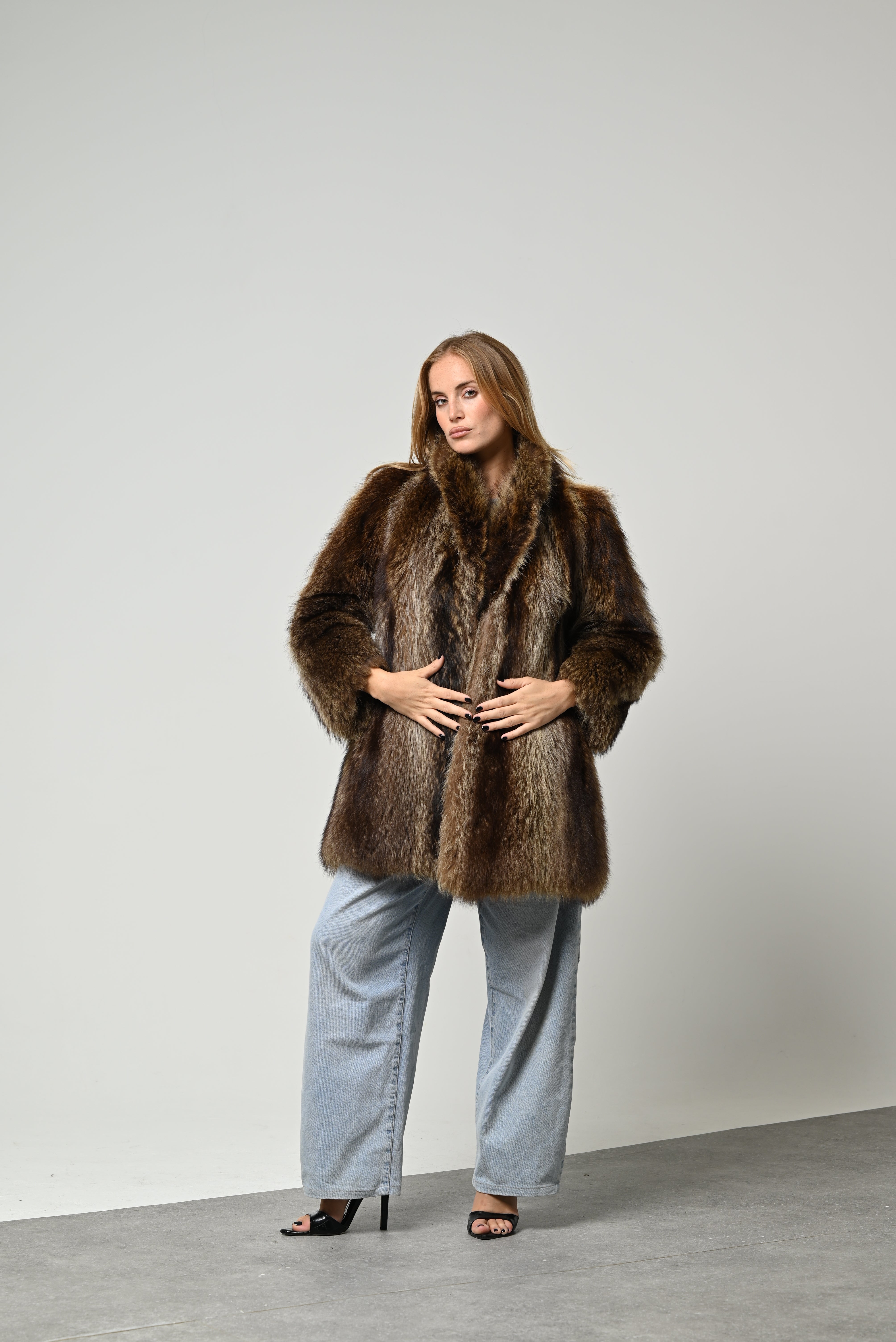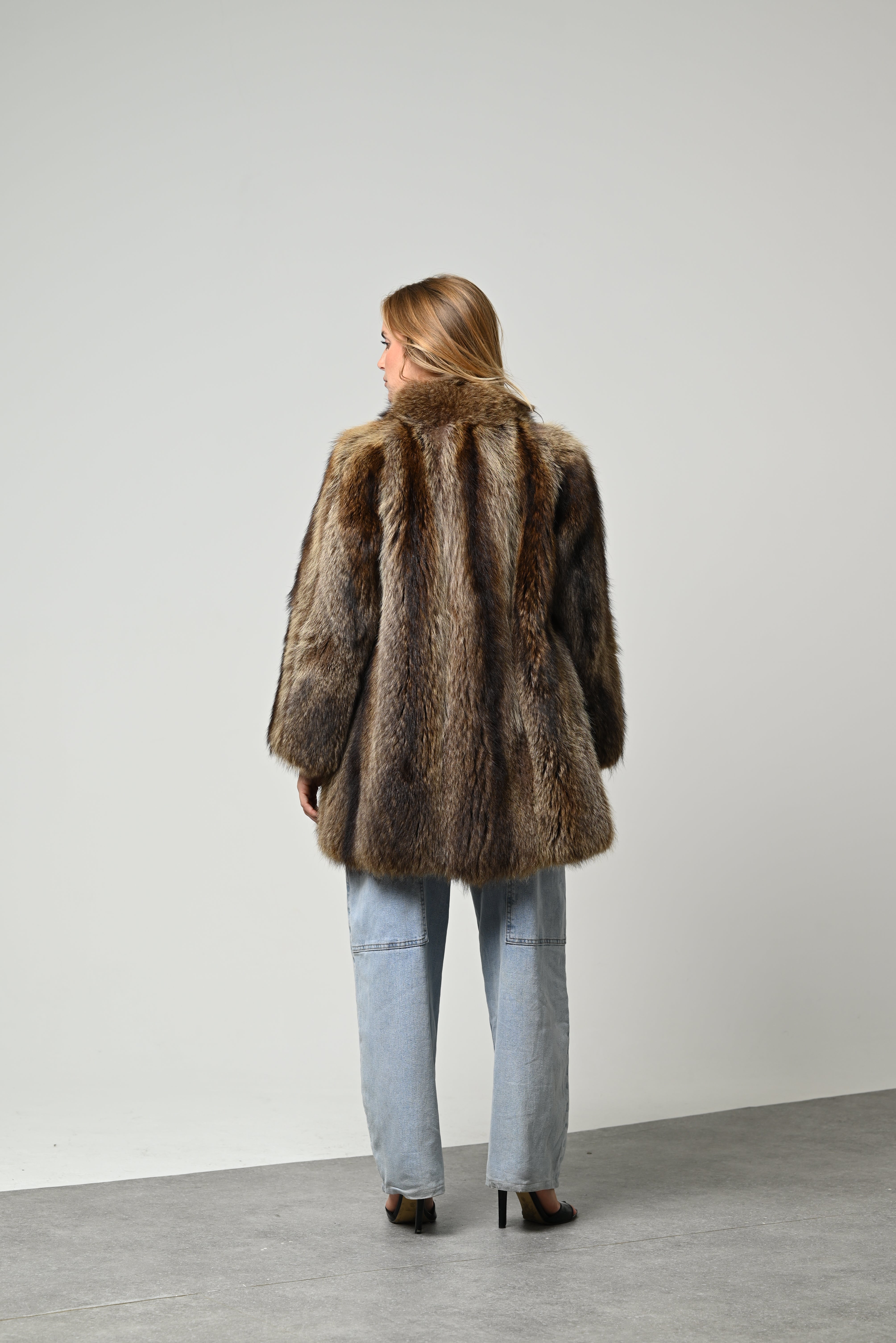 Pelliccia lunga in vera marmotta color marrone con sfumature naturali e disegno a righe verticali che slancia la figura. Il modello presenta un taglio dritto e avvolgente, con collo alto e maniche morbide. La modella è alta 167 cm