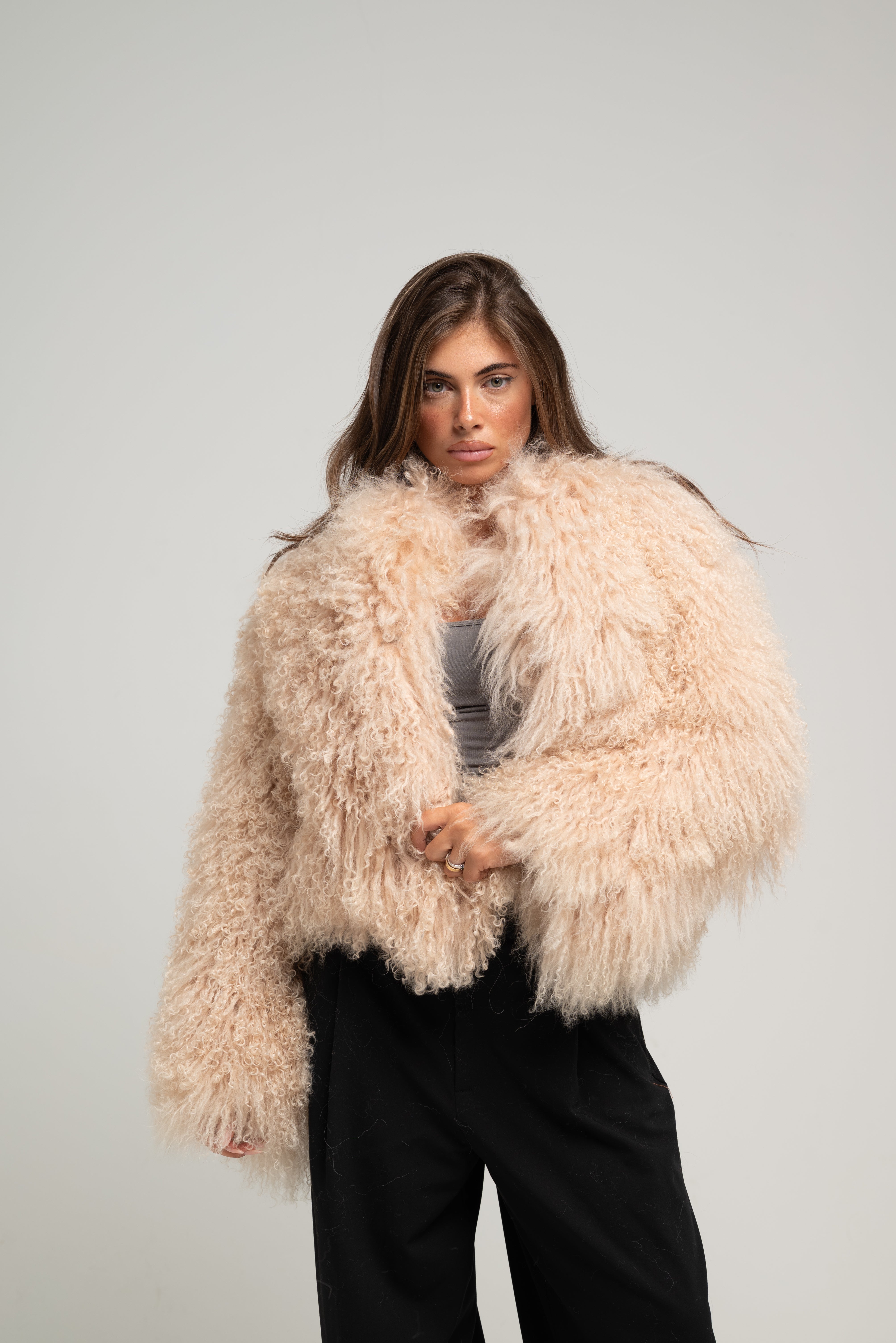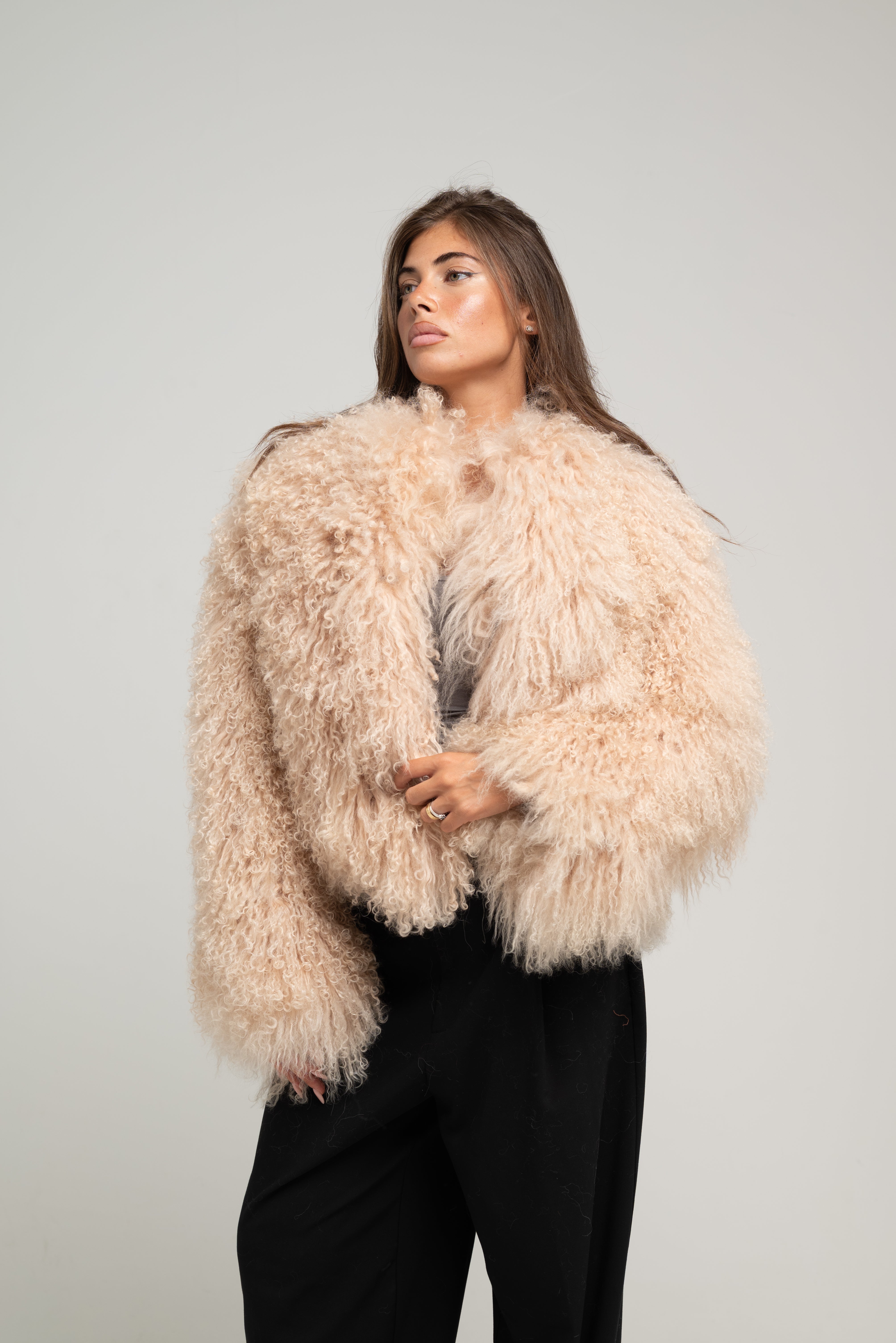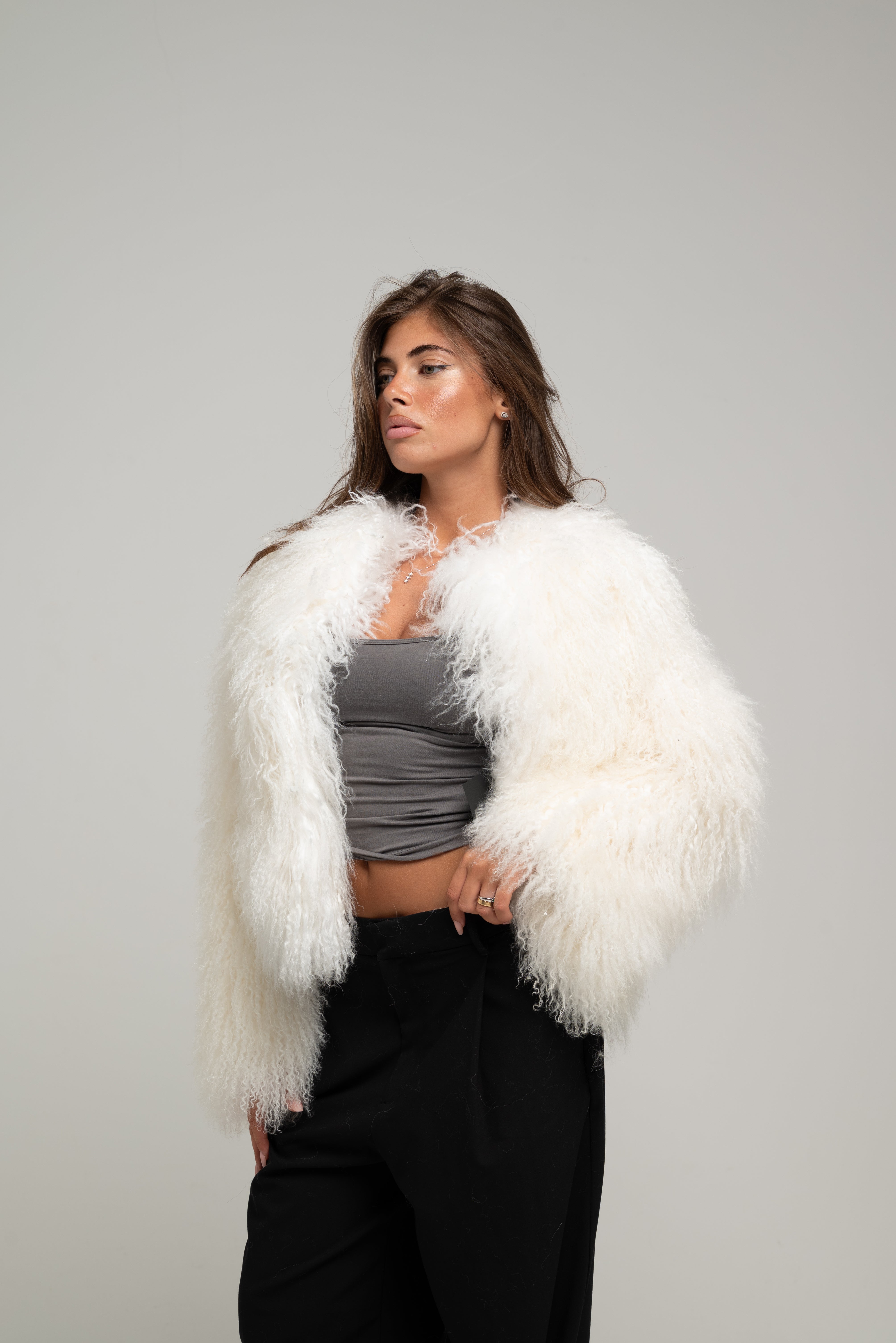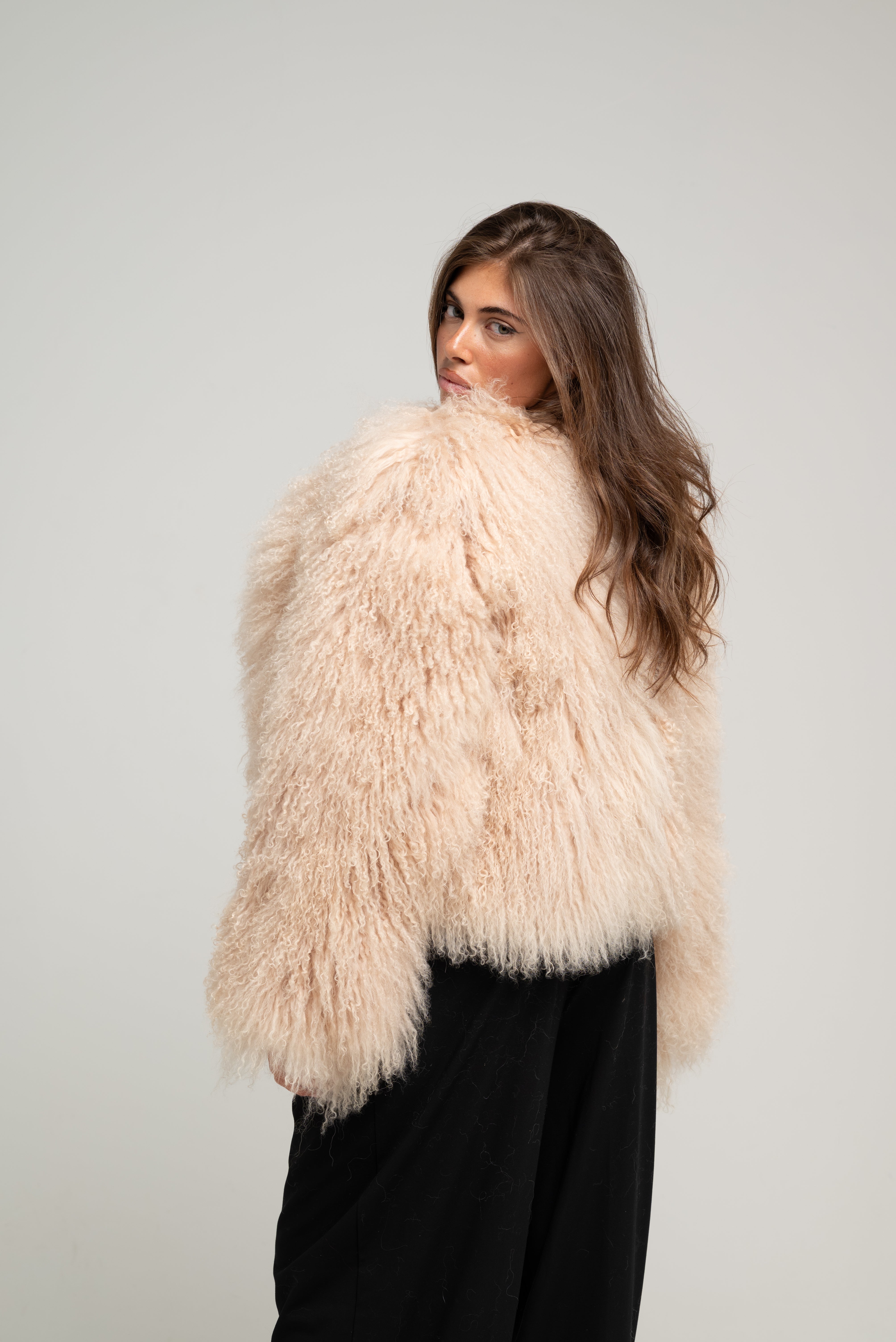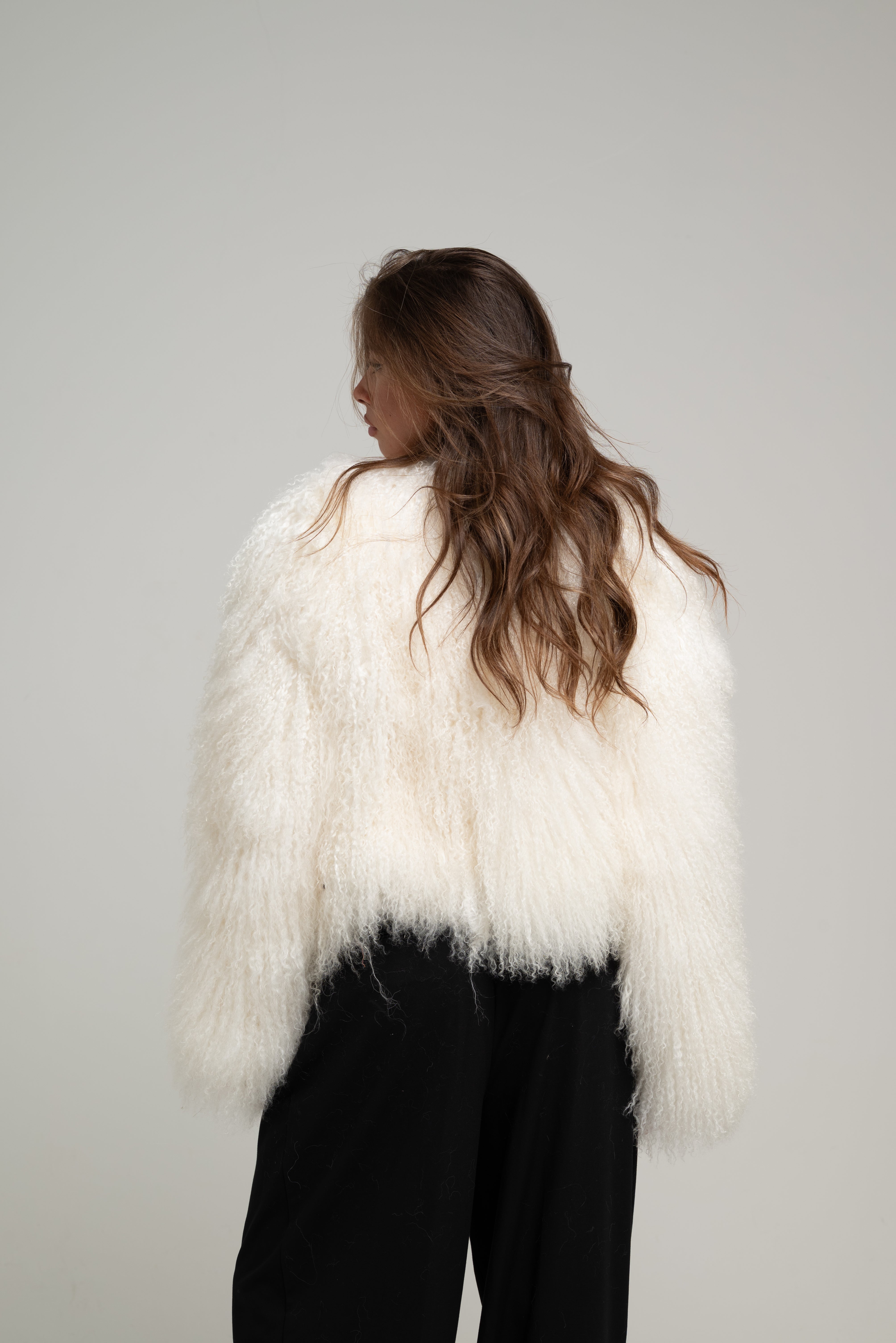 Genuine Mongolian fur with a soft, enveloping fit. The long, fluffy fur creates a soft, lightweight effect, while the Chanel collar adds a refined, timeless touch. A dramatic yet elegant piece, perfect for standing out in style.