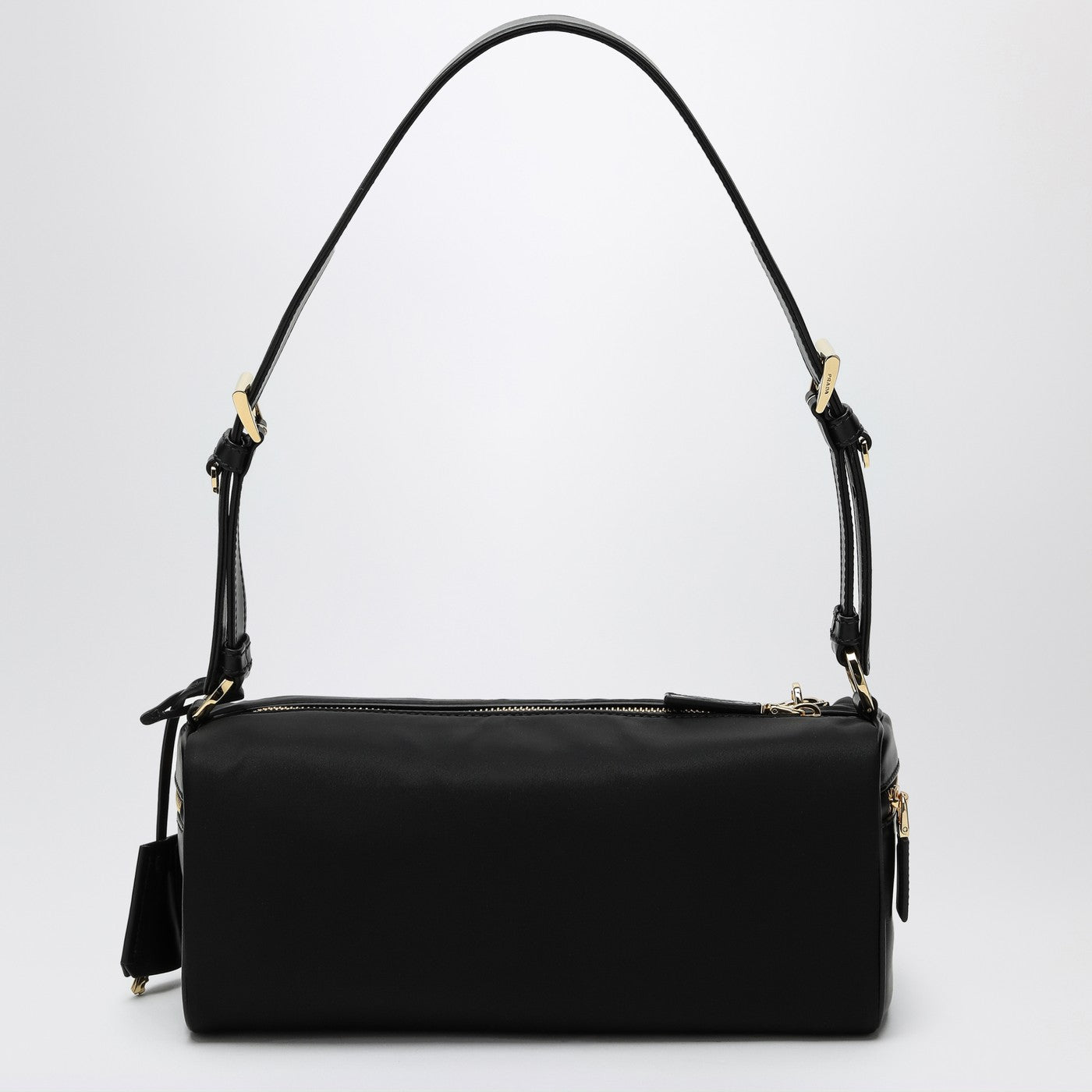 Prada medium shoulder bag in black Re-Nylon, featuring leather details, a top handle, a removable key ring, side zip pockets, a front enameled metal triangle logo, a zip closure, a logo padlock, a branded Re-Nylon interior, an internal zip pocket and gold-tone metal hardware.
