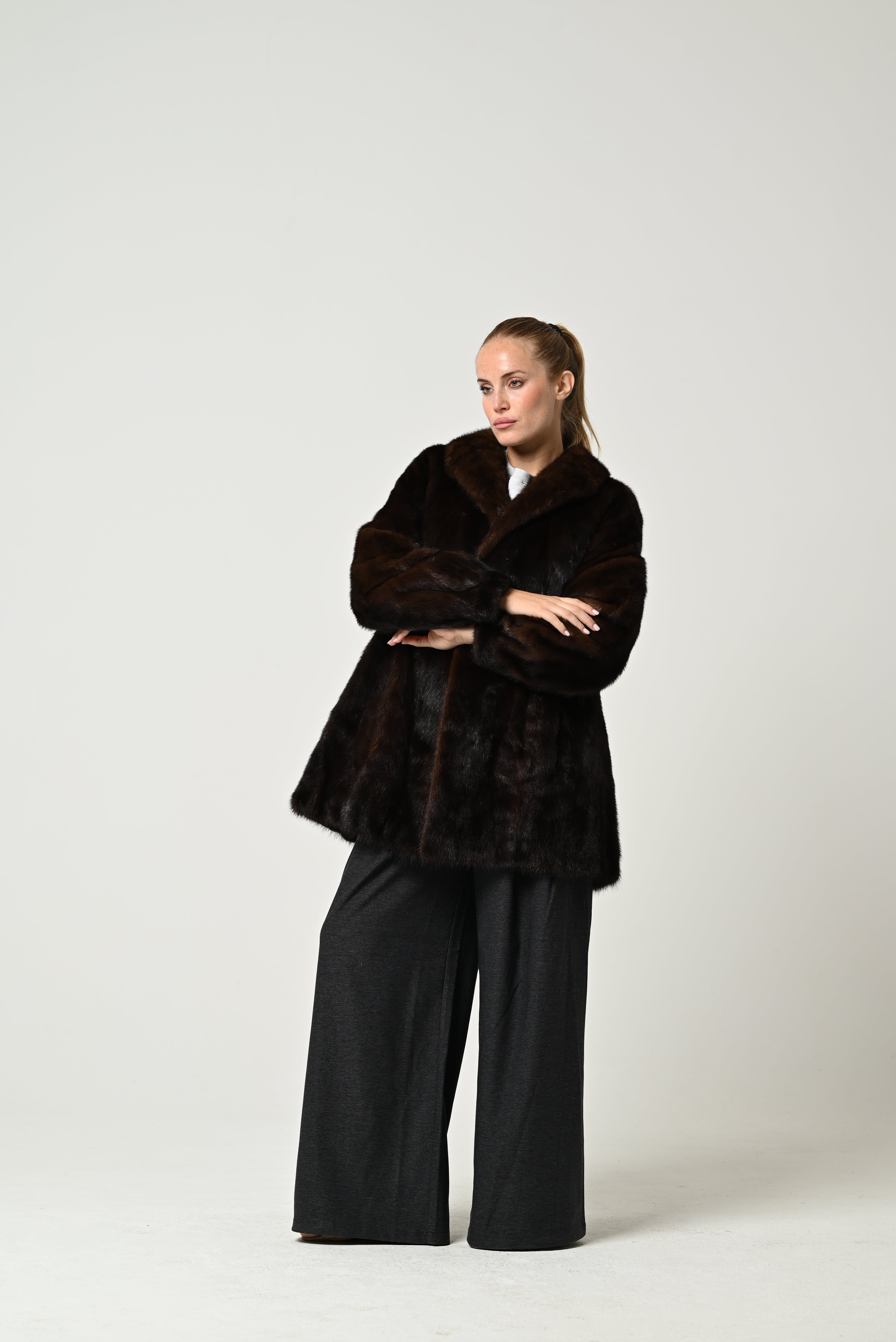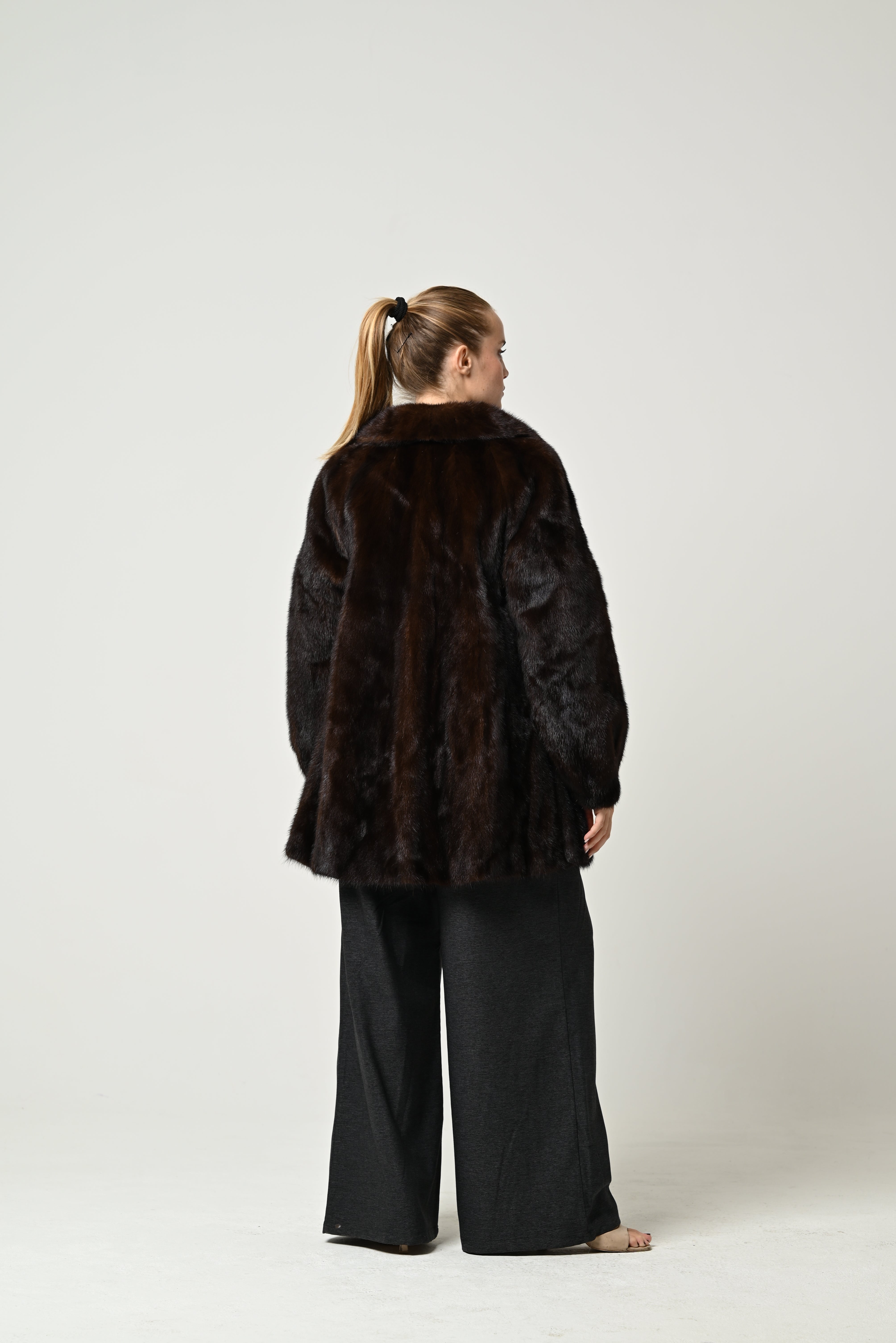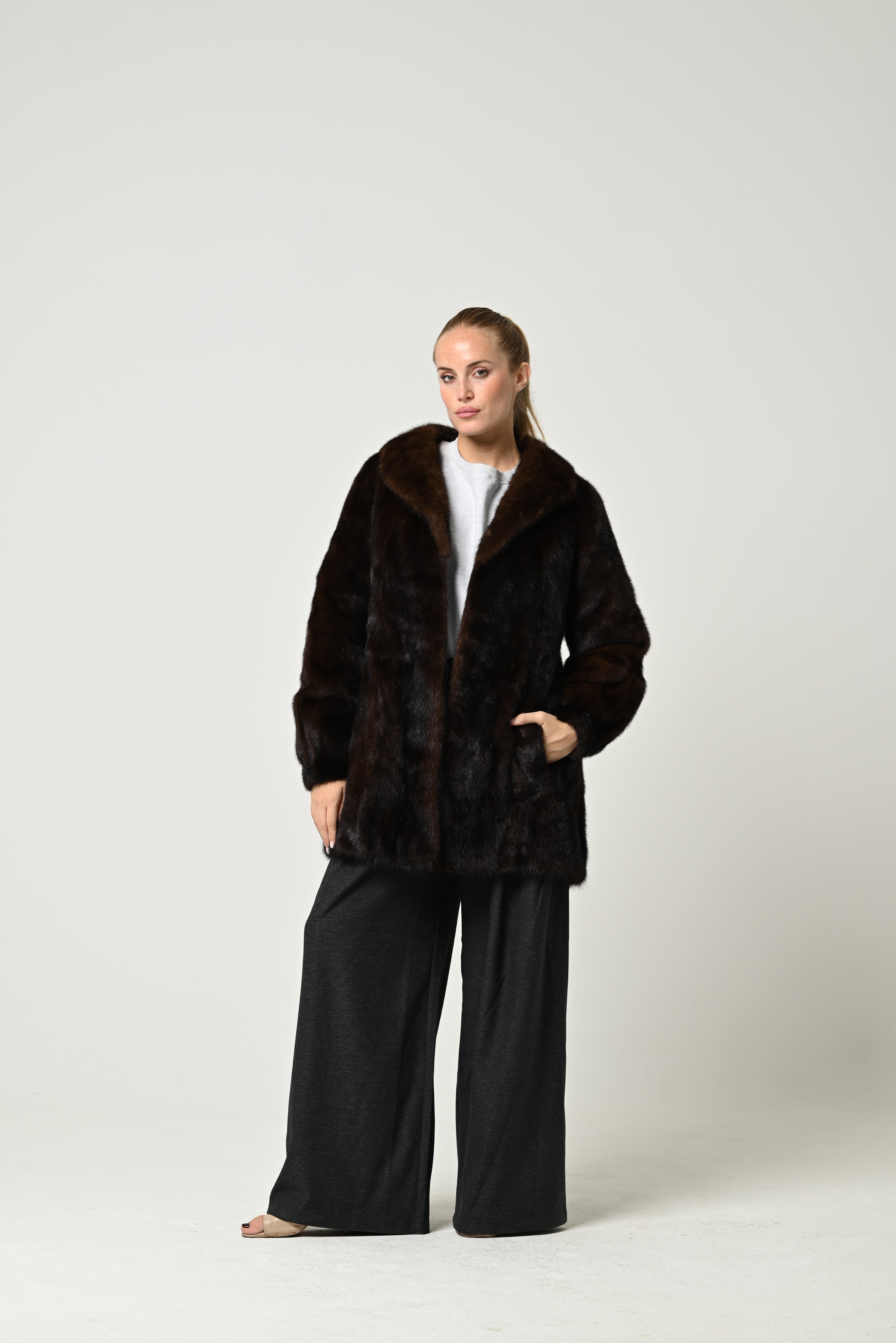 Short, genuine mink fur coat in a deep chocolate brown color, featuring a clean, modern cut. The fur's texture is silky and lustrous, with a compact density that lends elegance and refinement. It features a classic, slightly wrap-around collar and straight sleeves for a clean, harmonious silhouette. Soft fabric lining for superior comfort.