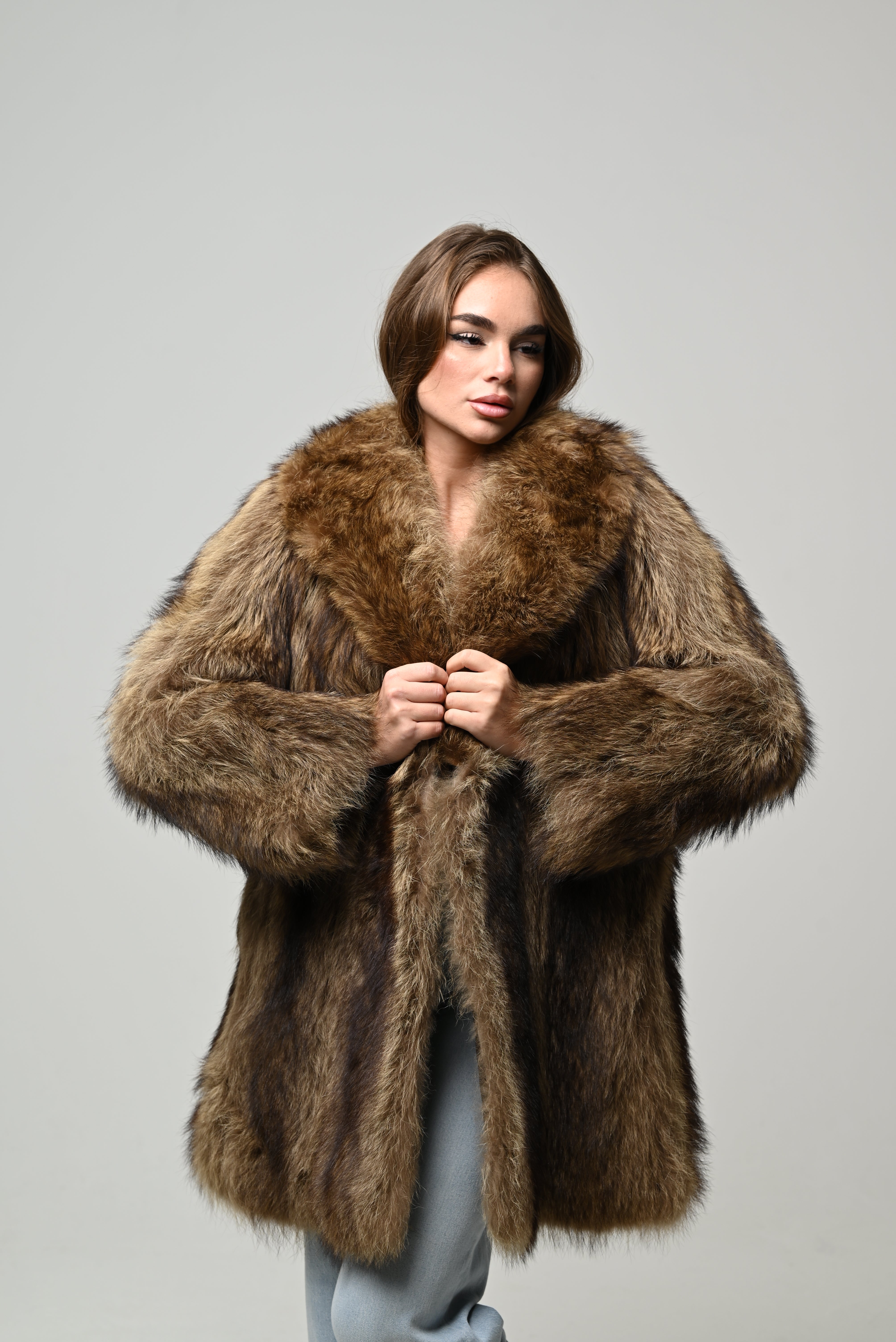 Pelliccia lunga dal taglio elegante e avvolgente, caratterizzata da pelo folto e ultra morbido in intense sfumature naturali marrone caldo. Il collo ampio e strutturato incornicia il décolleté, mentre le maniche morbide e la linea dritta leggermente over donano volume, comfort e movimento. Un capo iconico e senza tempo, perfetto per look sofisticati ma ideale anche per valorizzare outfit più casual con un tocco deciso.