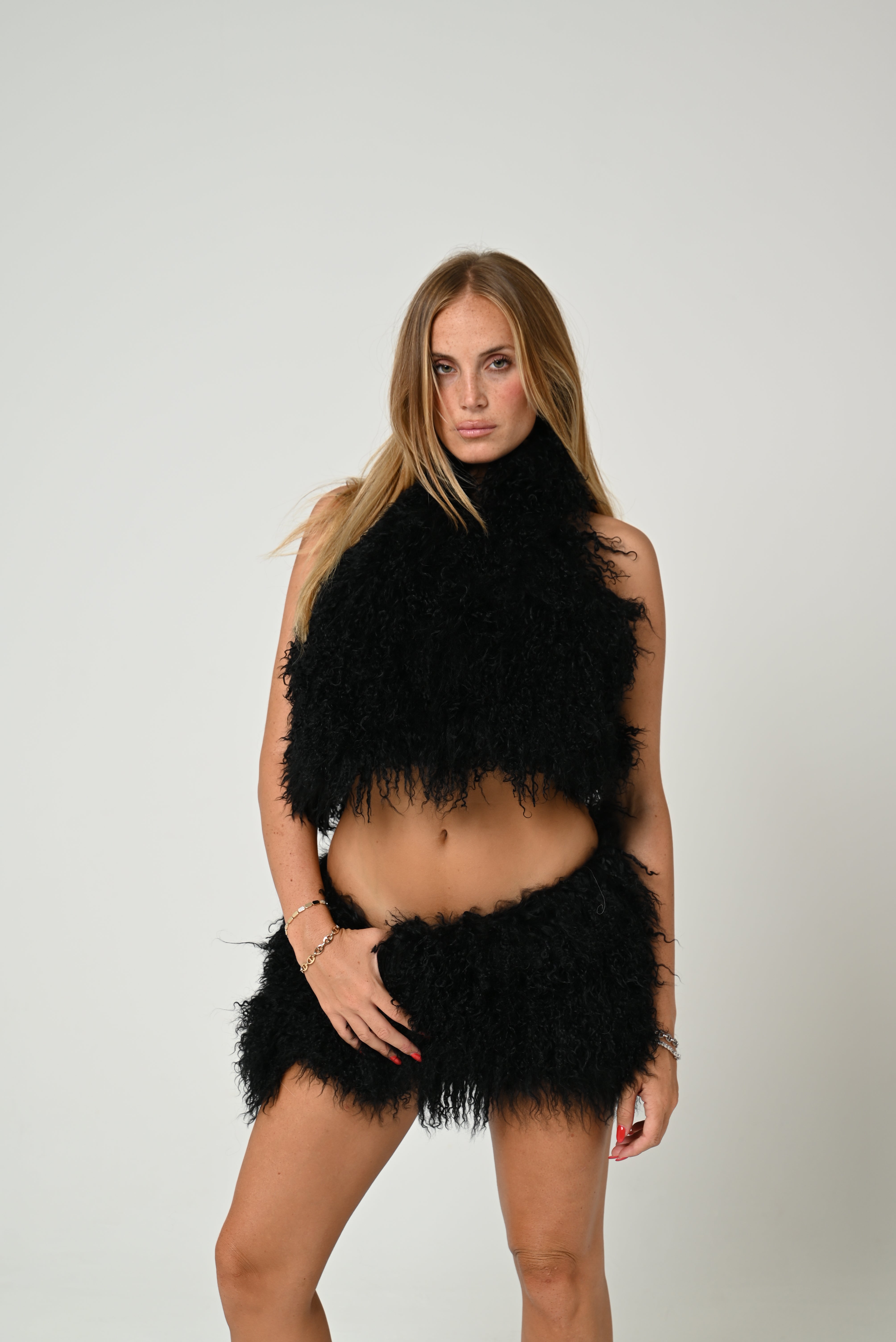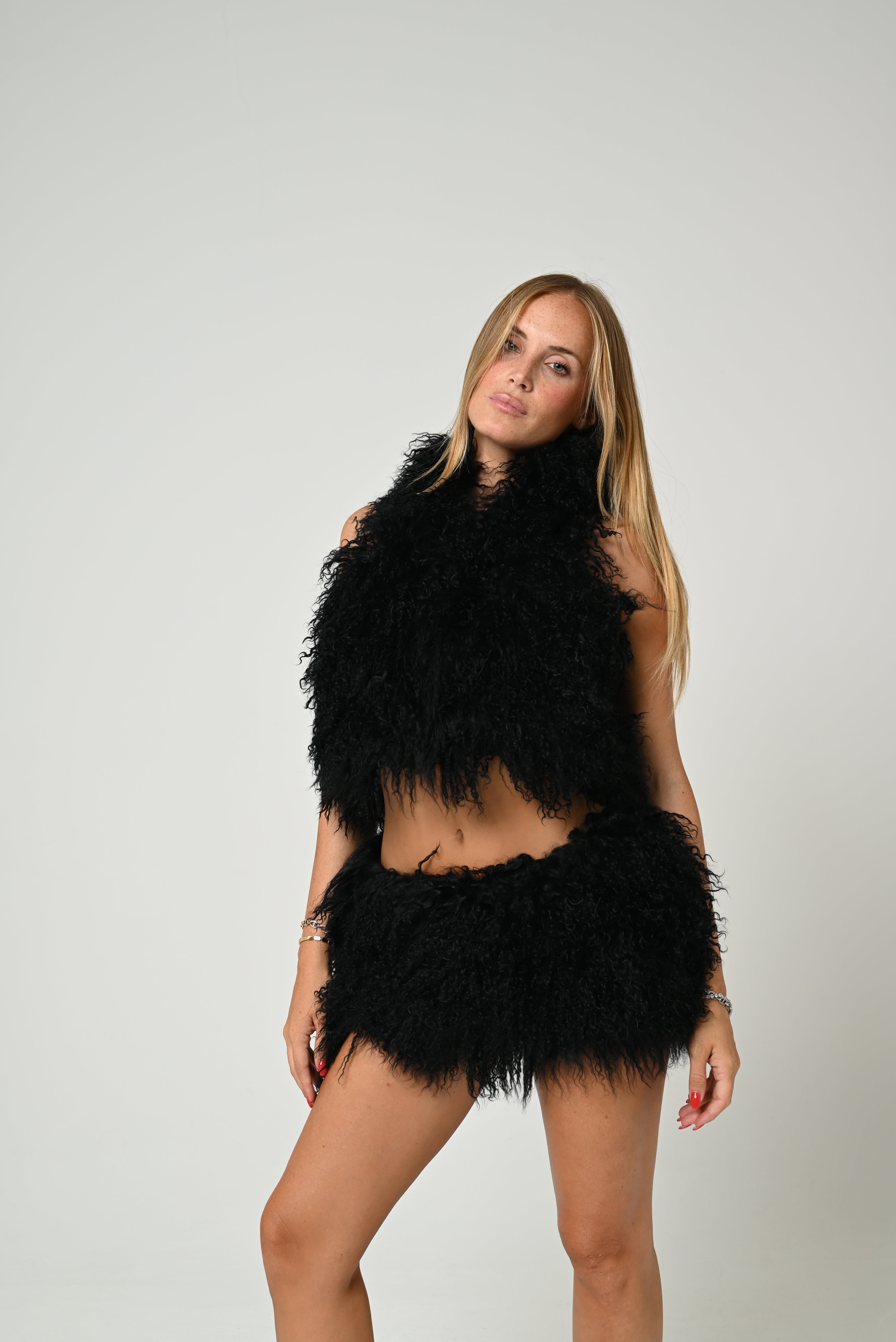 Cet ensemble en fourrure de Mongolie noire se compose d'un haut court sans manches et d'une mini-jupe. La fourrure volumineuse et bouclée crée un effet spectaculaire et original, ajoutant volume et mouvement à l'ensemble. Une tenue audacieuse et glamour, parfaite pour les grandes occasions, les soirées ou pour celles qui souhaitent se démarquer avec un style audacieux et sophistiqué.