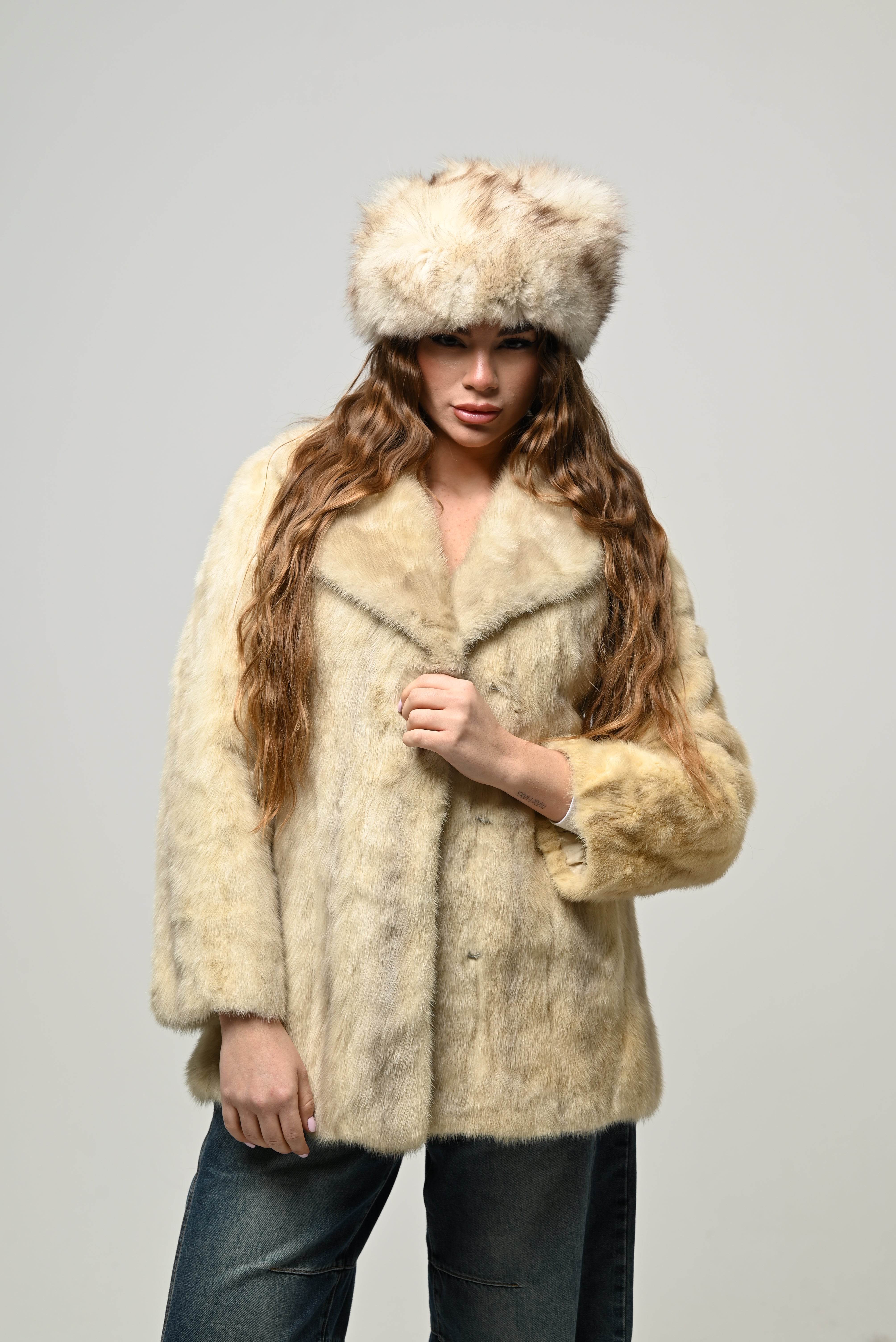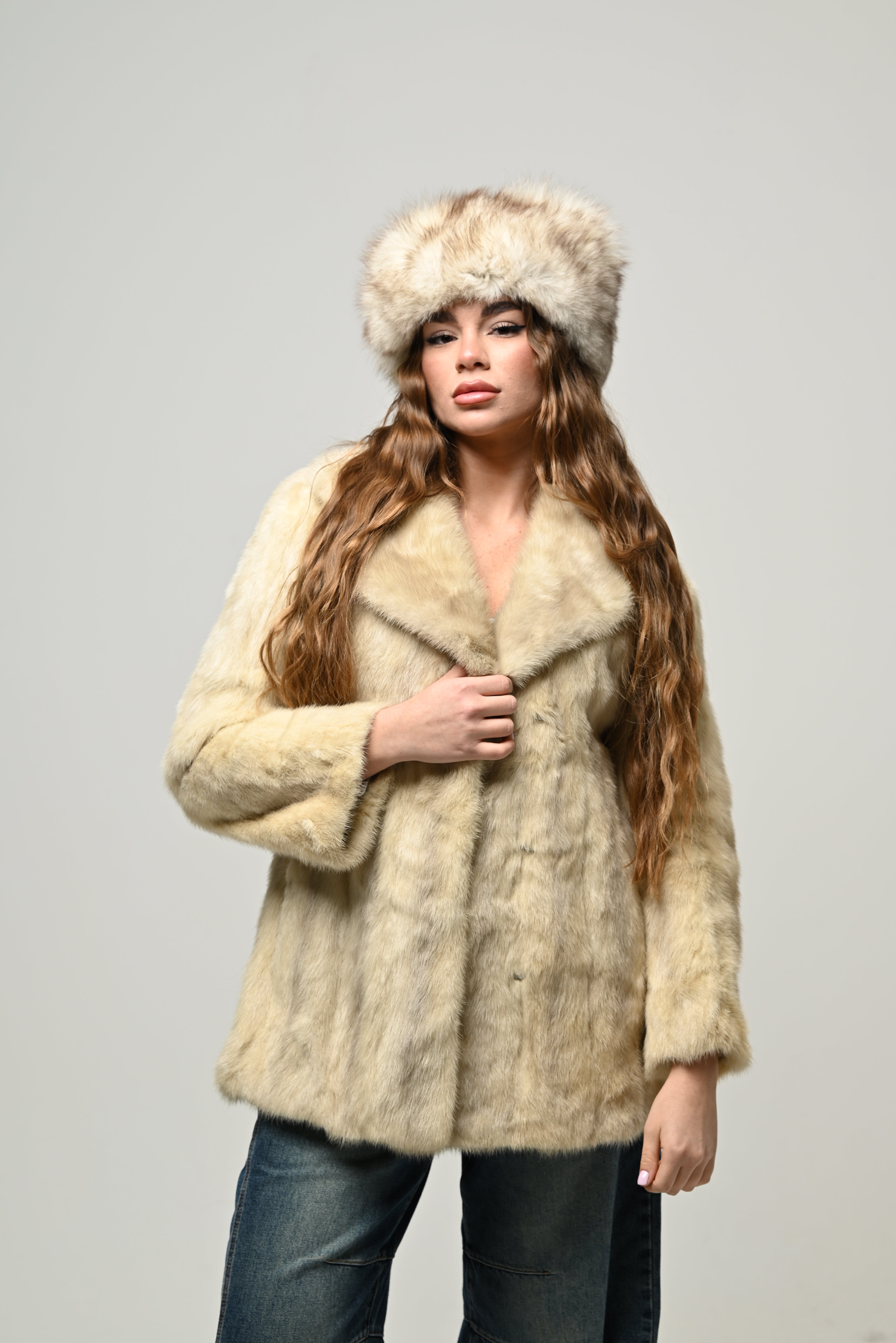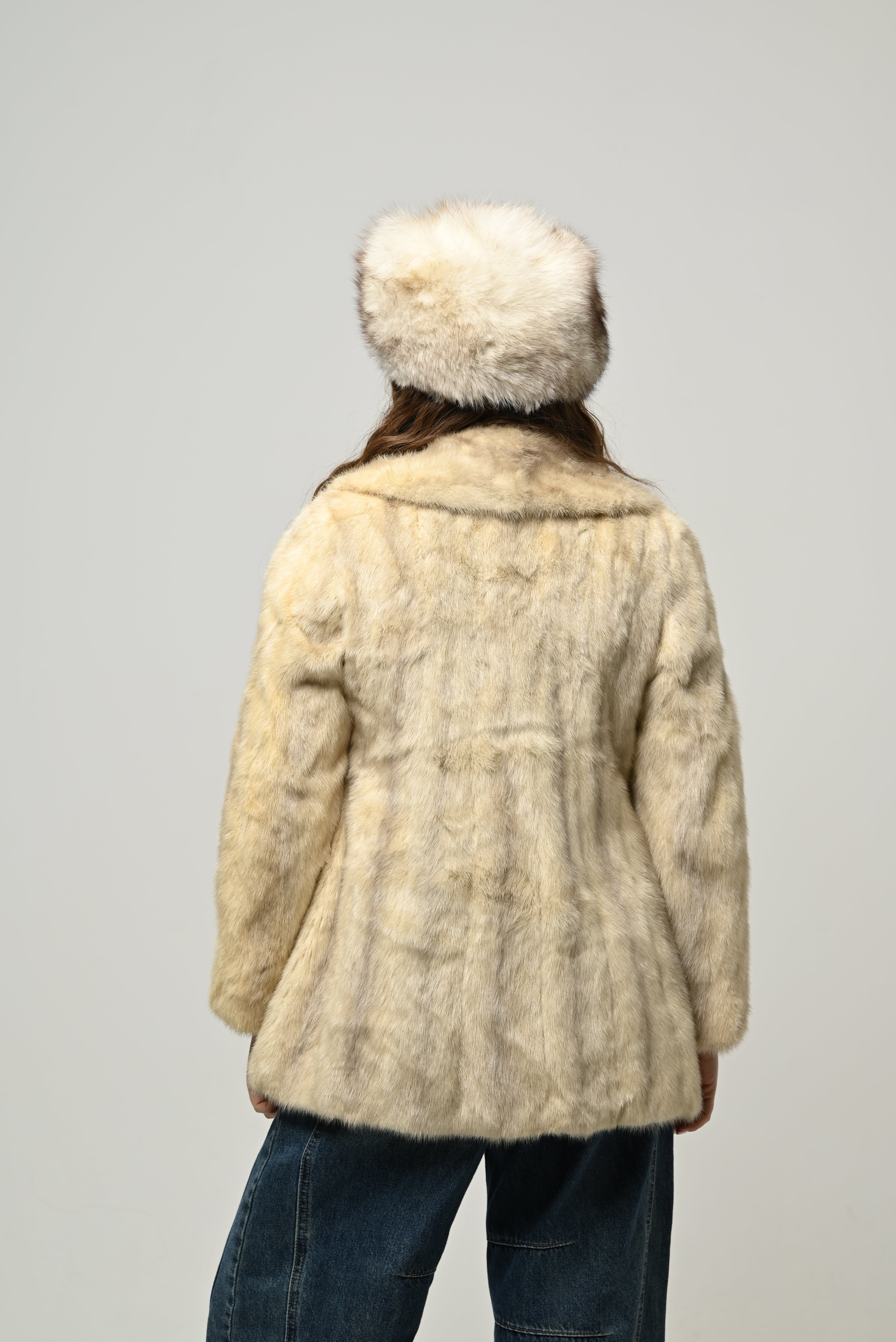 Il visone 845 è una pelliccia dal taglio medio, caratterizzata da un colore champagne molto chiaro e luminoso, che le conferisce un look elegante e delicato. Il pelo è morbido, uniforme e con una leggera lucentezza naturale tipica del visone di qualità.