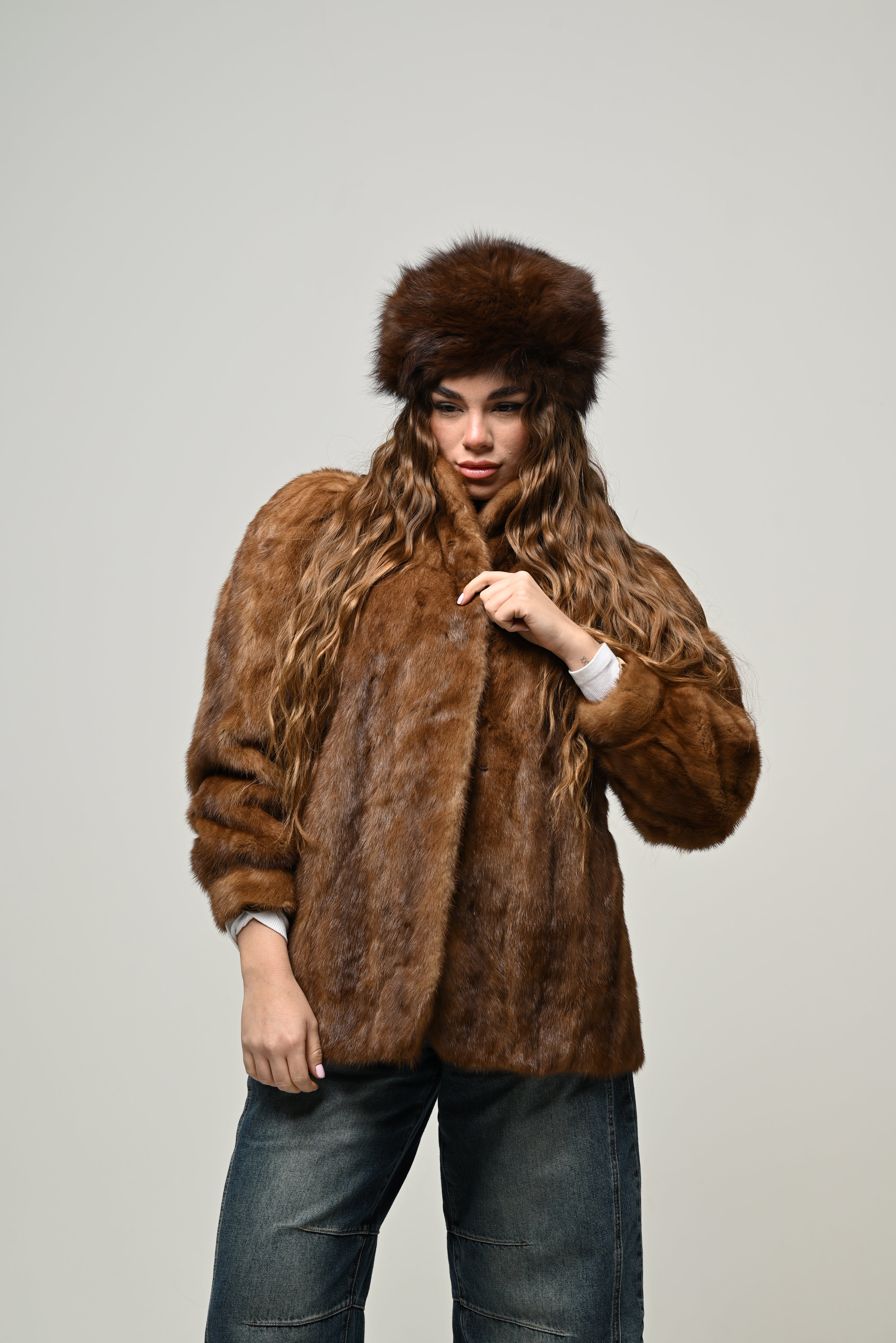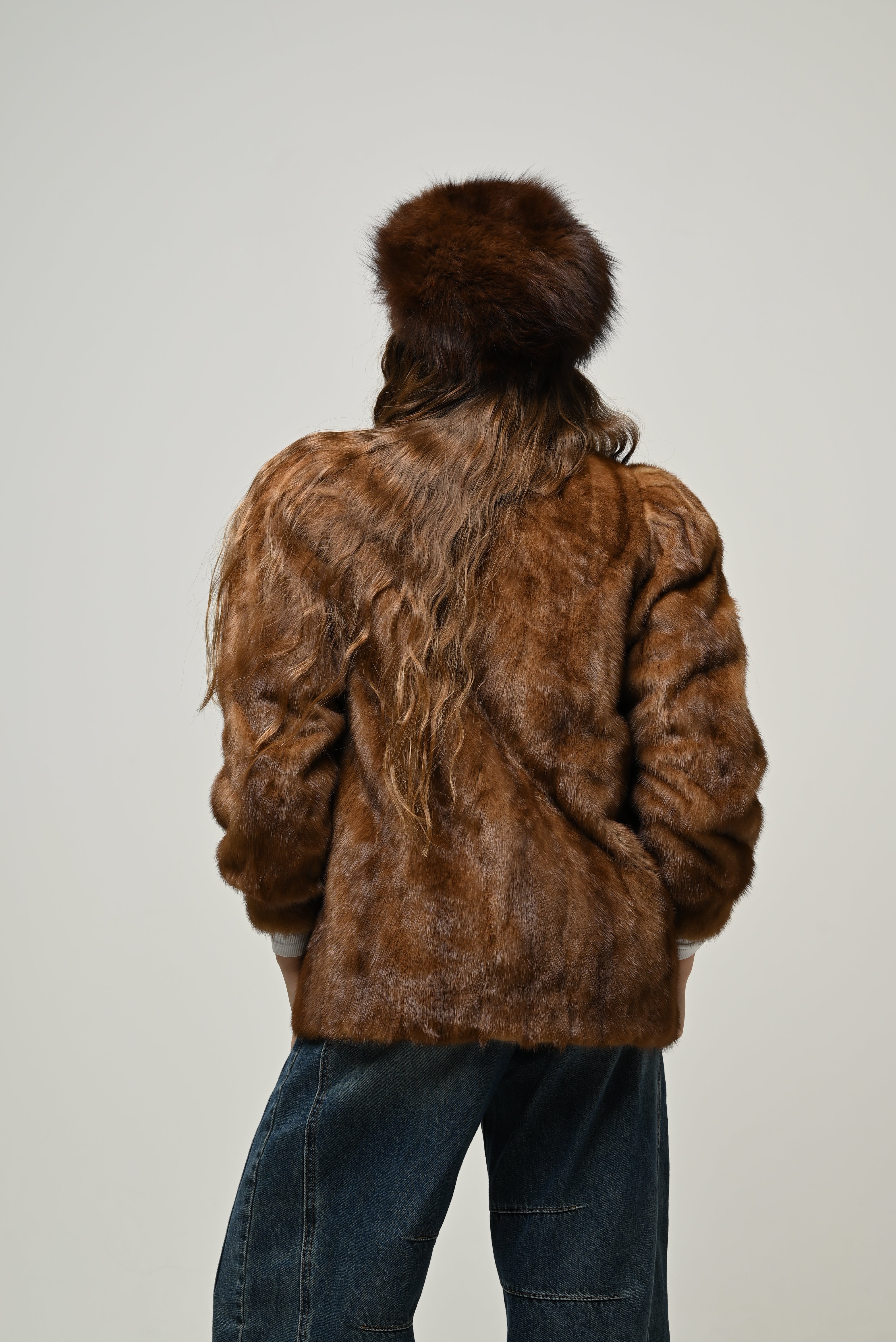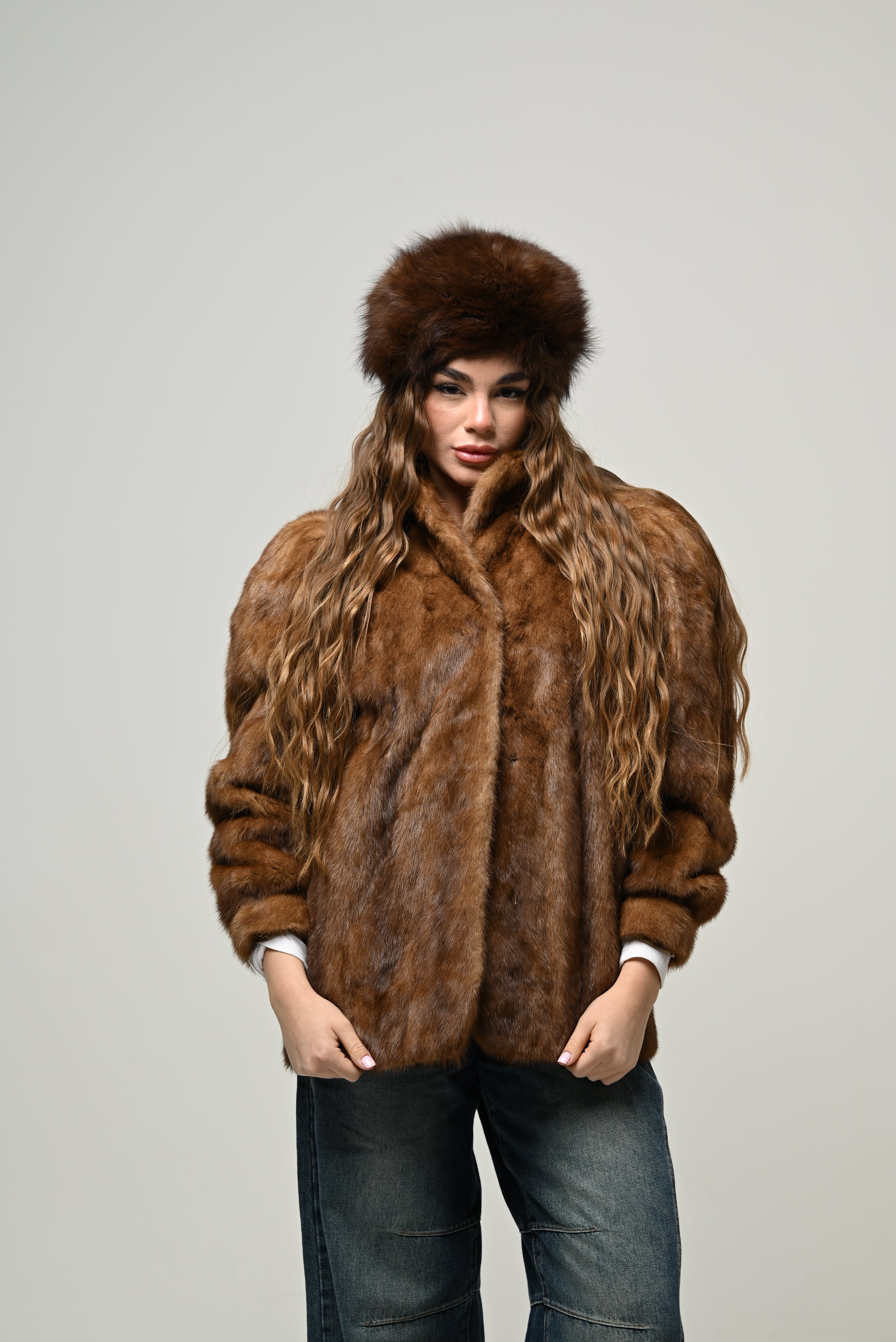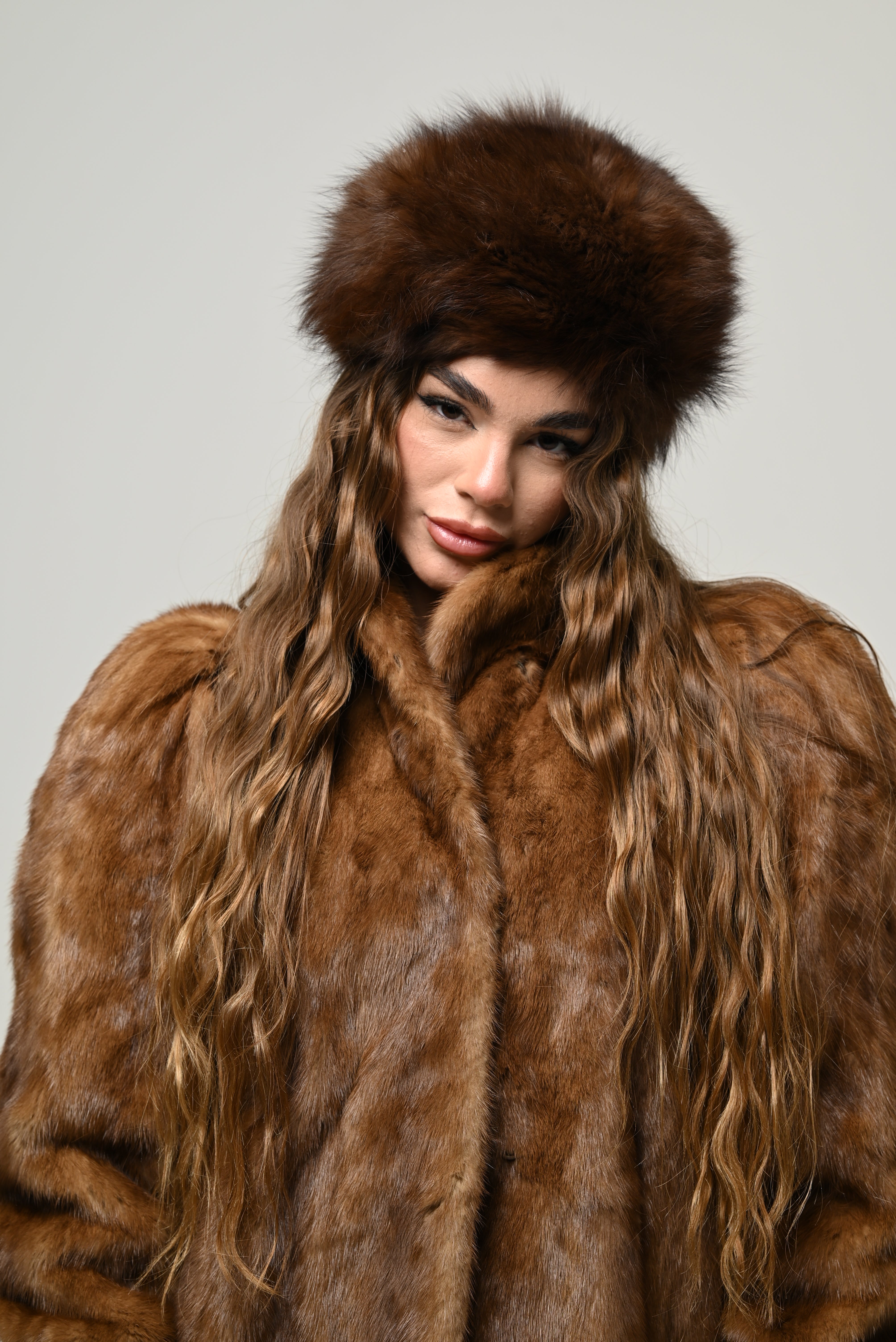 una pelliccia dal colore caldo e luminoso, un marrone dorato intenso che mette in risalto la naturale lucentezza del visone. Il pelo è compatto, morbido e molto raffinato, con leggere sfumature che donano profondità e movimento al capo.