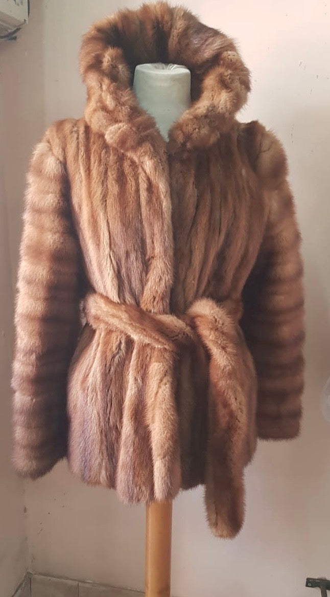 Ce long manteau en fourrure à capuche est confectionné en vison brun doux et brillant. Sa coupe élégante et enveloppante est soulignée par une ceinture qui souligne la silhouette. Ce modèle allie raffinement et confort, idéal pour un look sophistiqué et luxueux.