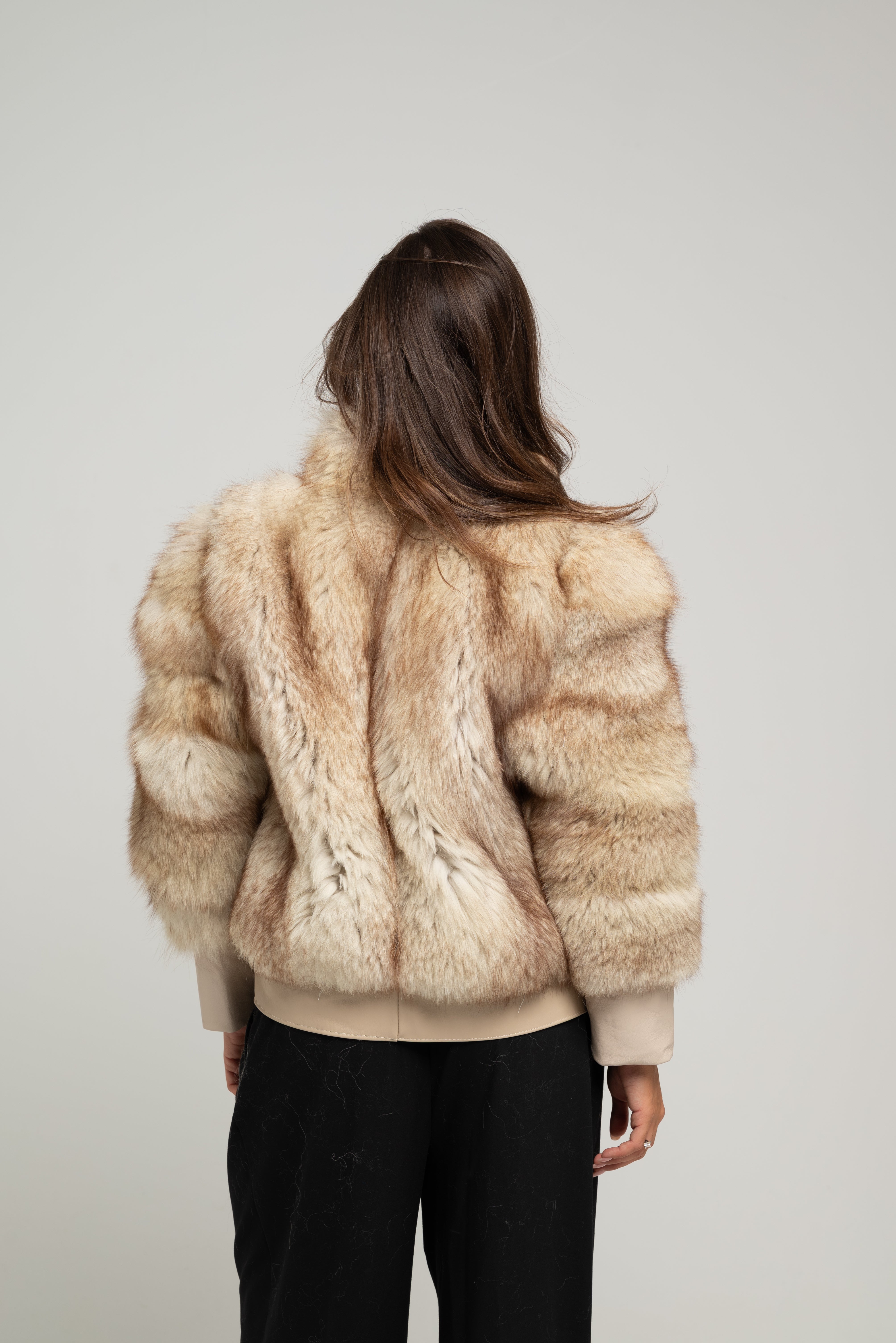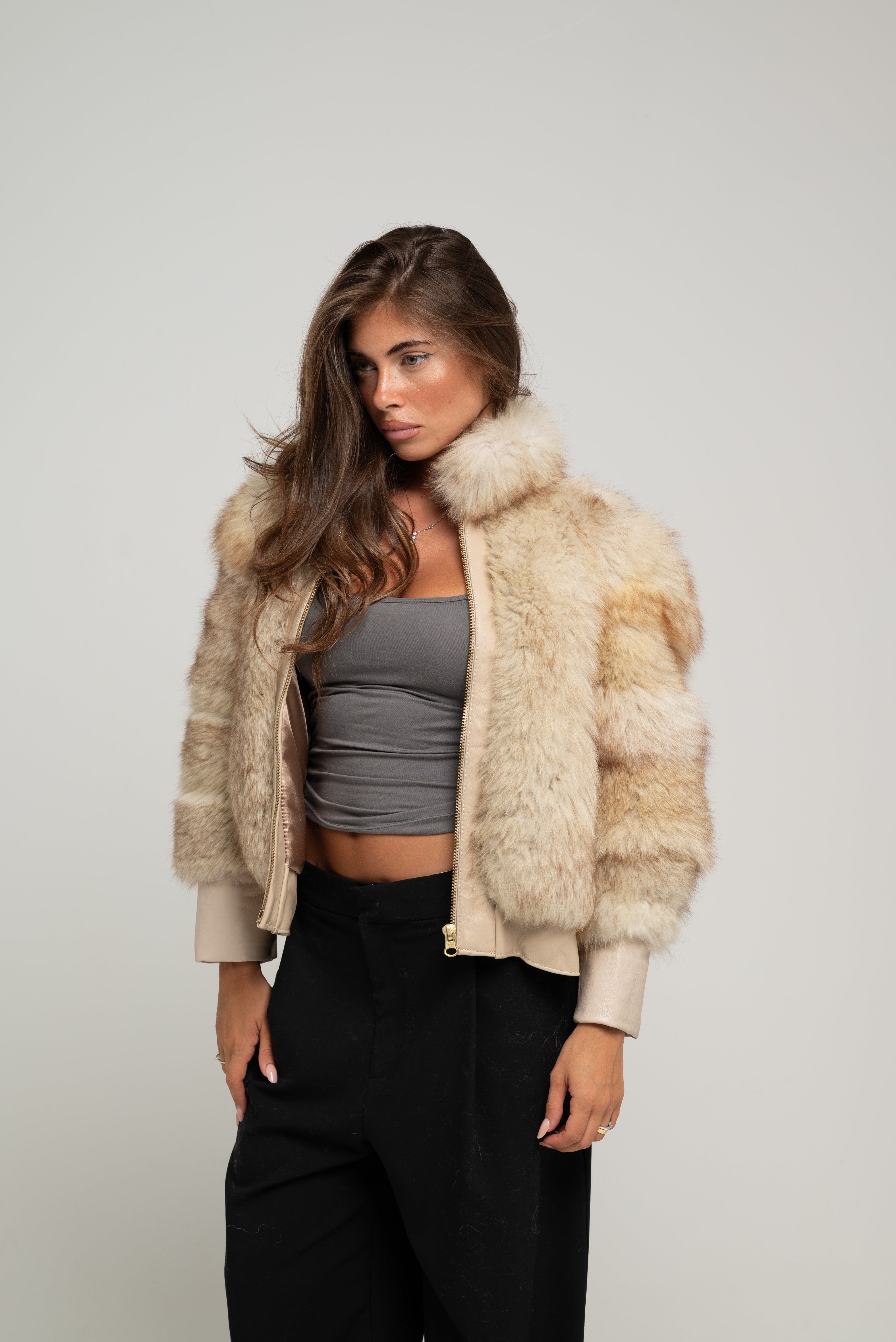 Cette veste courte en fourrure naturelle allie élégance et modernité. Son design bomber, avec sa fermeture éclair sur le devant et ses détails contrastants en cuir beige, est sublimé par la texture douce et volumineuse de la fourrure claire. Son col montant lui confère une touche de caractère, idéale pour des looks contemporains et sophistiqués.