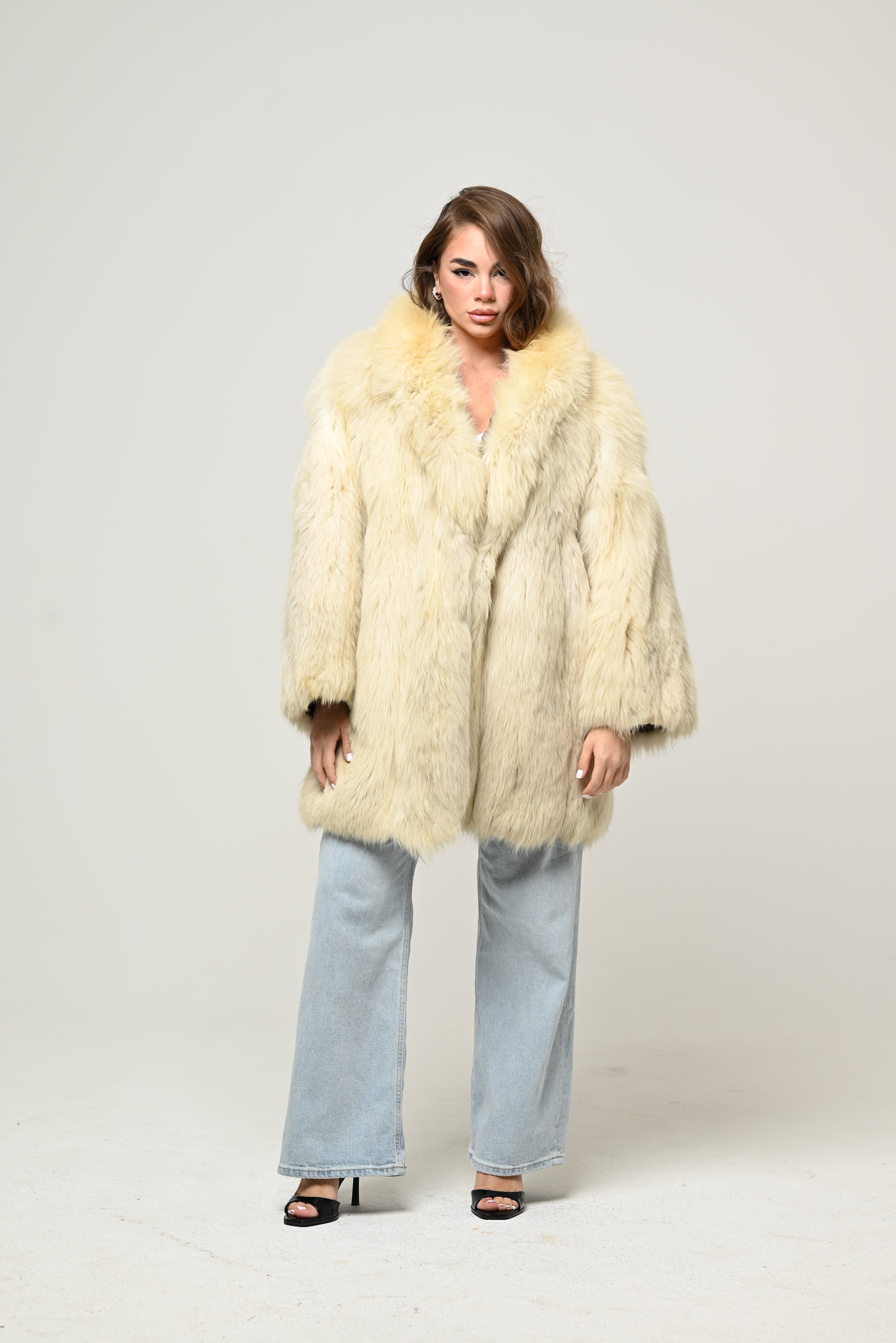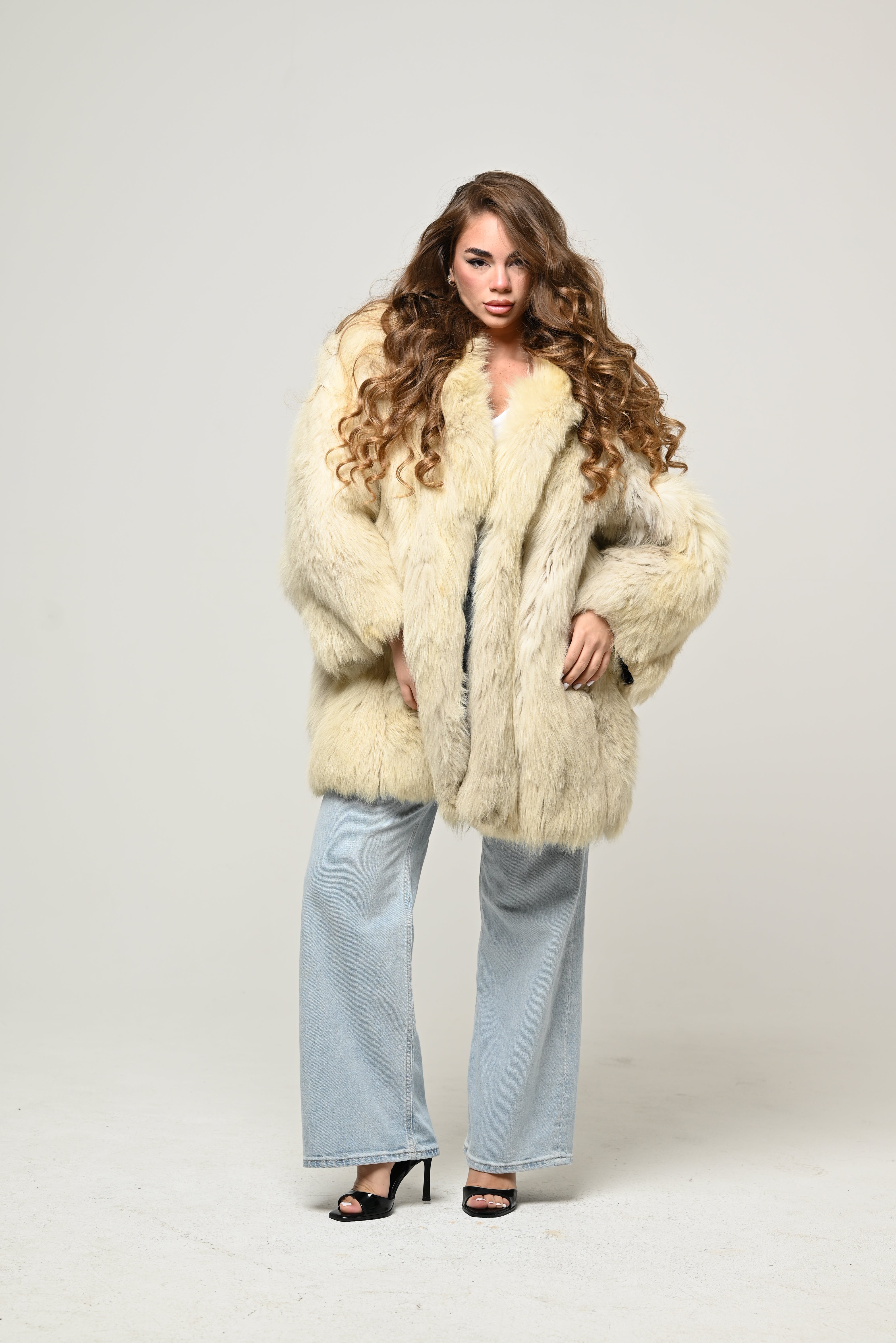 Manteau en fourrure véritable de couleur ivoire clair, avec une coupe douce et volumineuse, parfait pour un look élégant et sophistiqué.