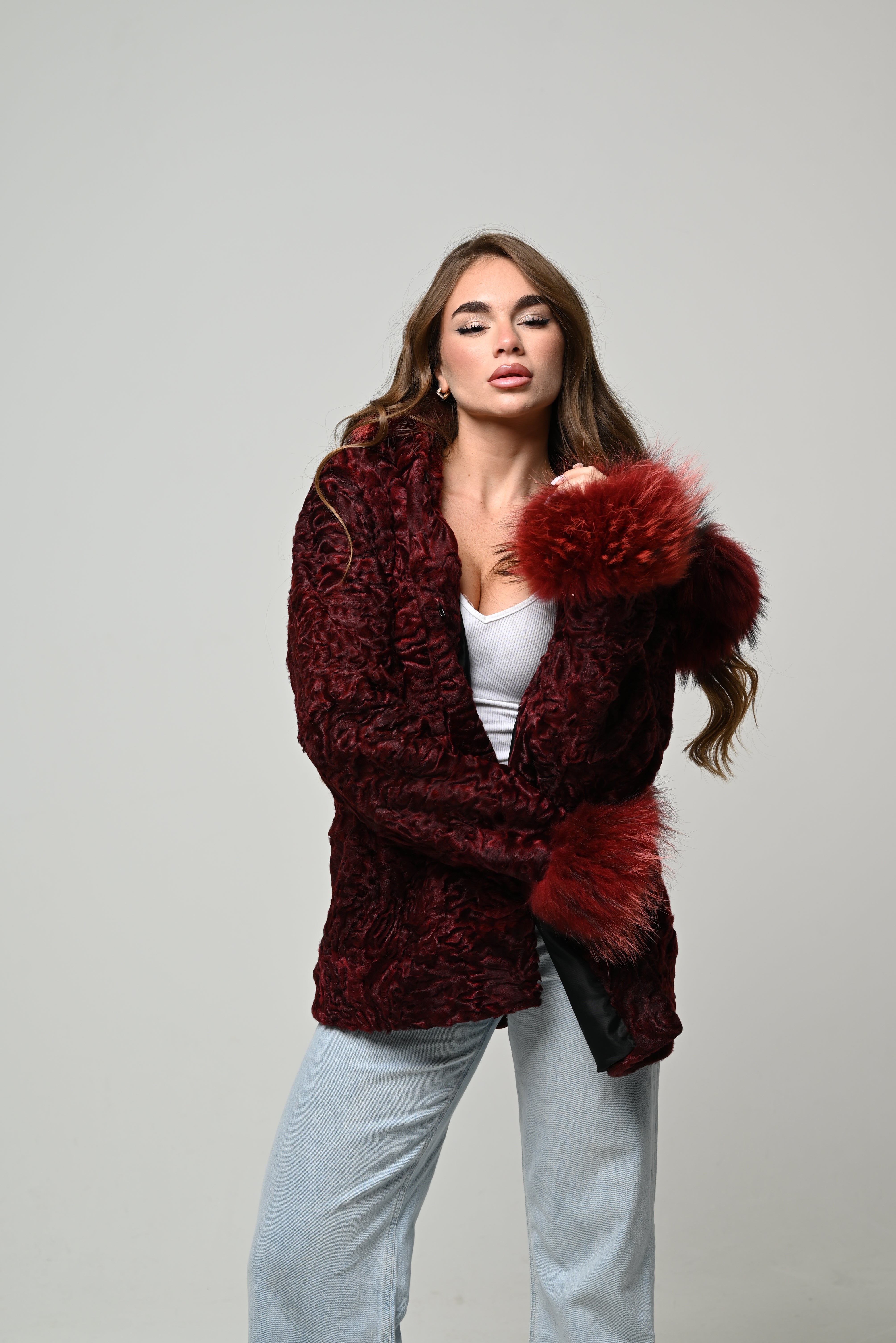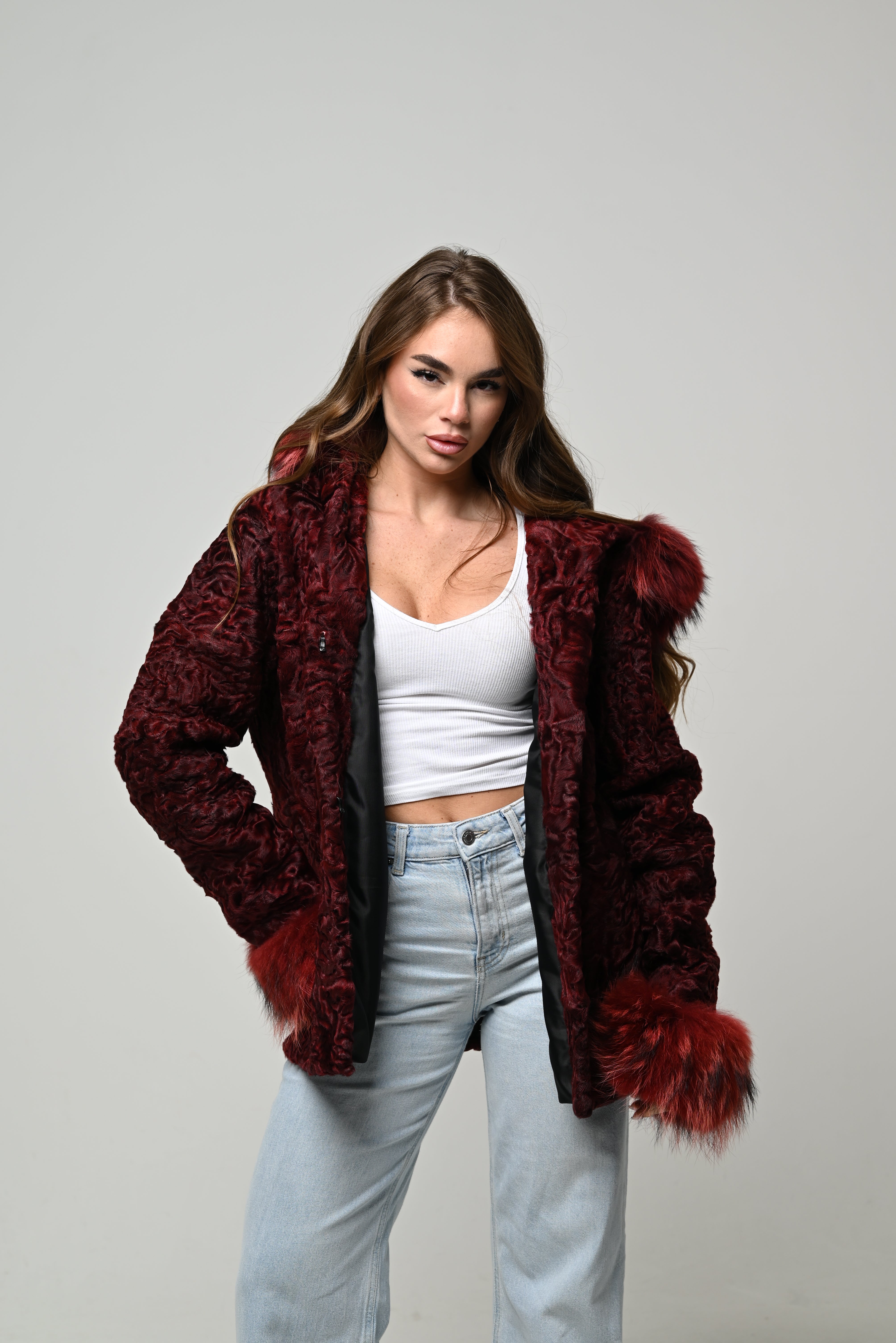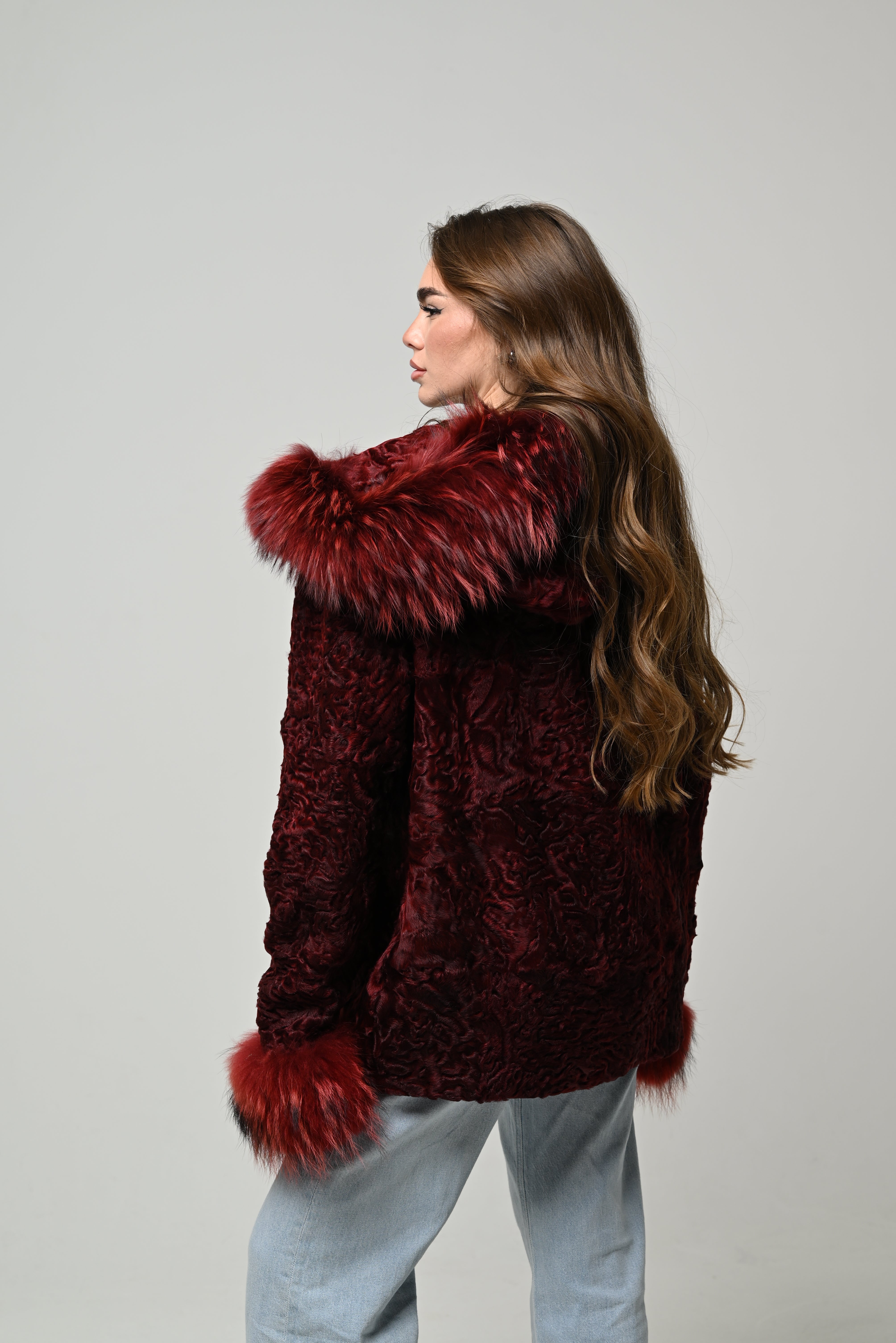 Pelliccia nuova in vera pelliccia naturale di astrakan, modello corto con linea pulita e vestibilità regolare. Pelo riccio, compatto e ultra morbido, in intensa tonalità bordeaux che dona carattere al look e lo rende estremamente elegante. Polsini e cappuccio in vera pelliccia di volpe tono su tono che aggiungono volume e un tocco luxury. Chiusura frontale invisibile e interno foderato per maggiore comfort.
