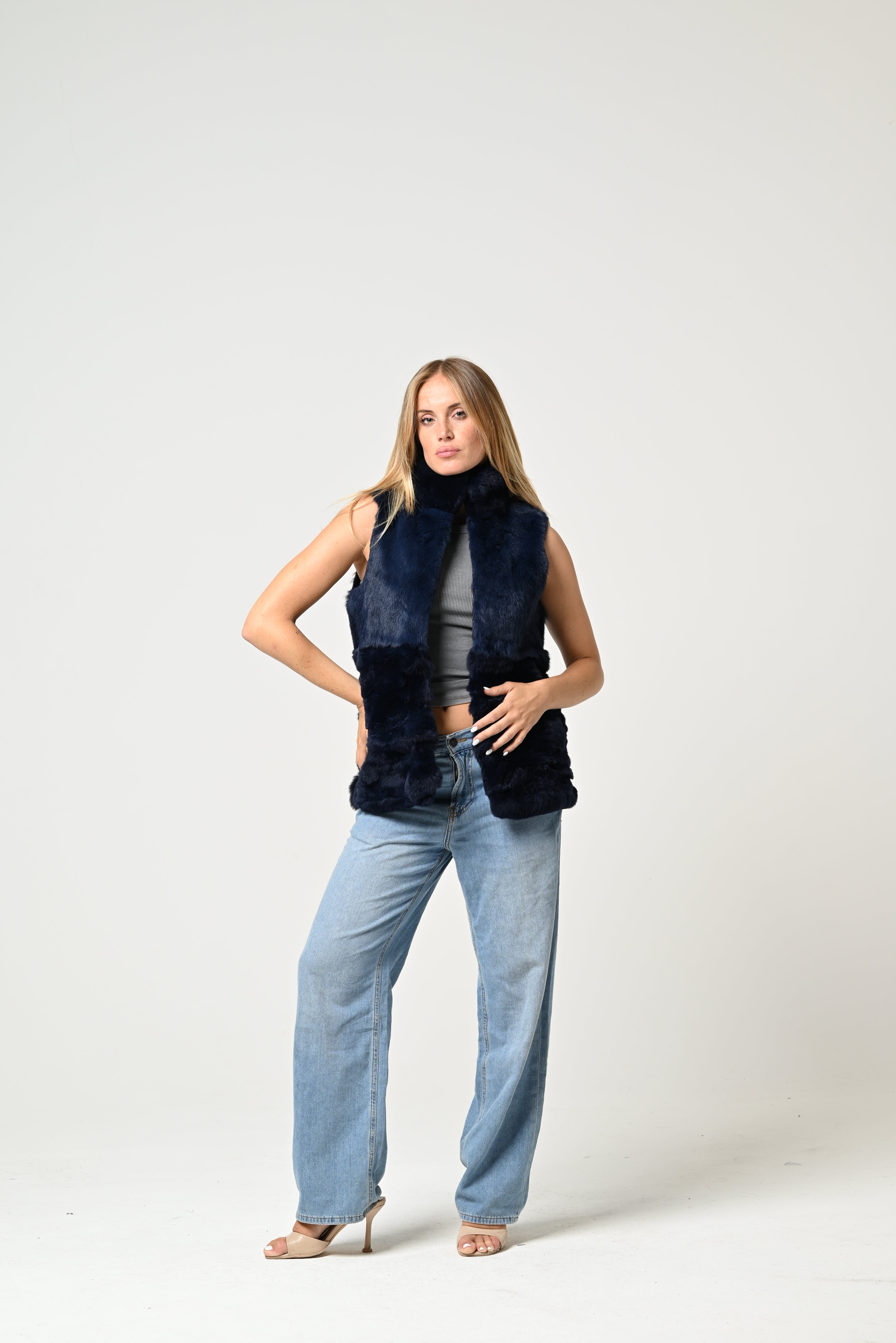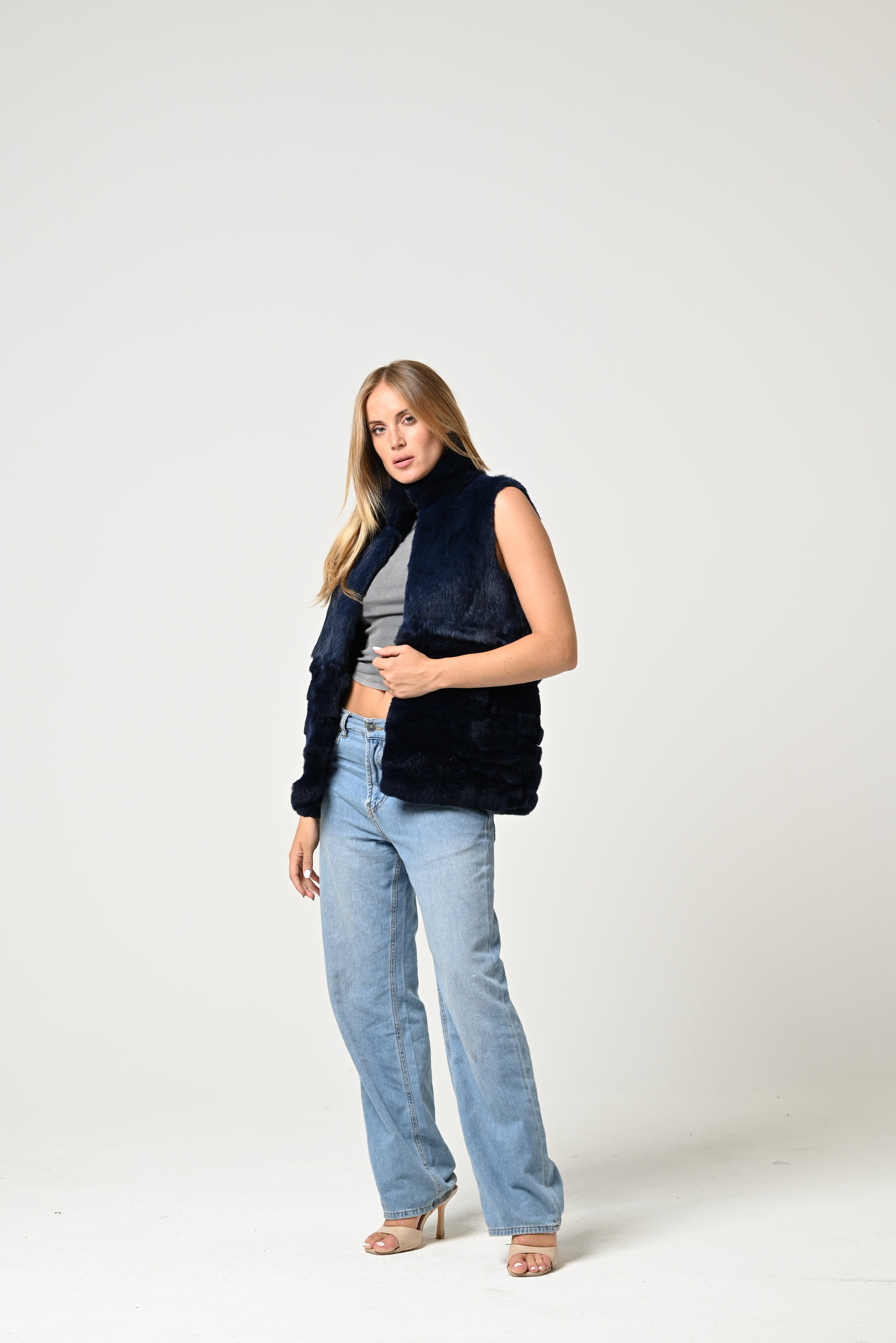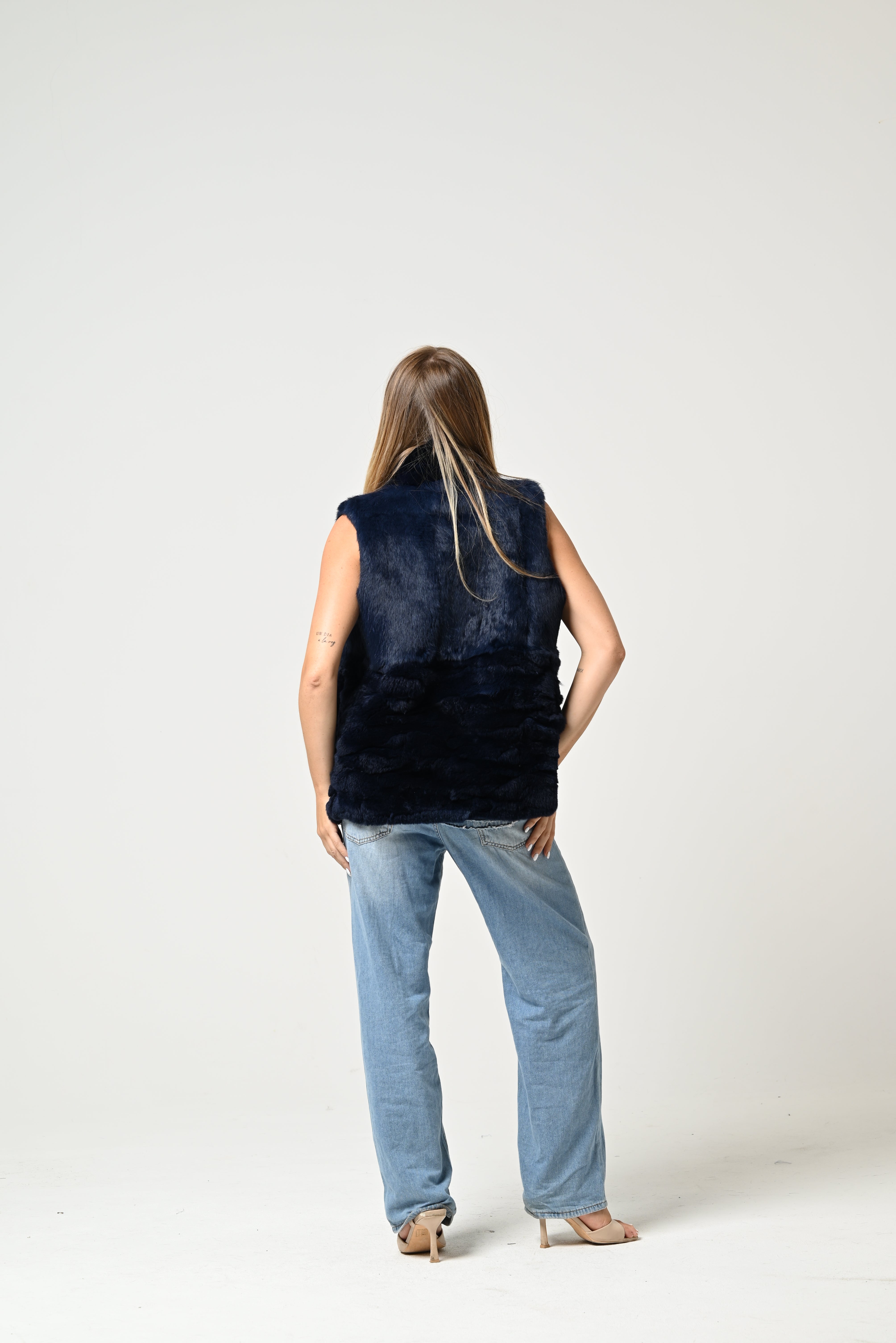 Il s'agit d'un gilet en fourrure bleu foncé, sans manches, à coupe courte, avec un col haut doux qui donne de l'élégance et une touche sophistiquée.