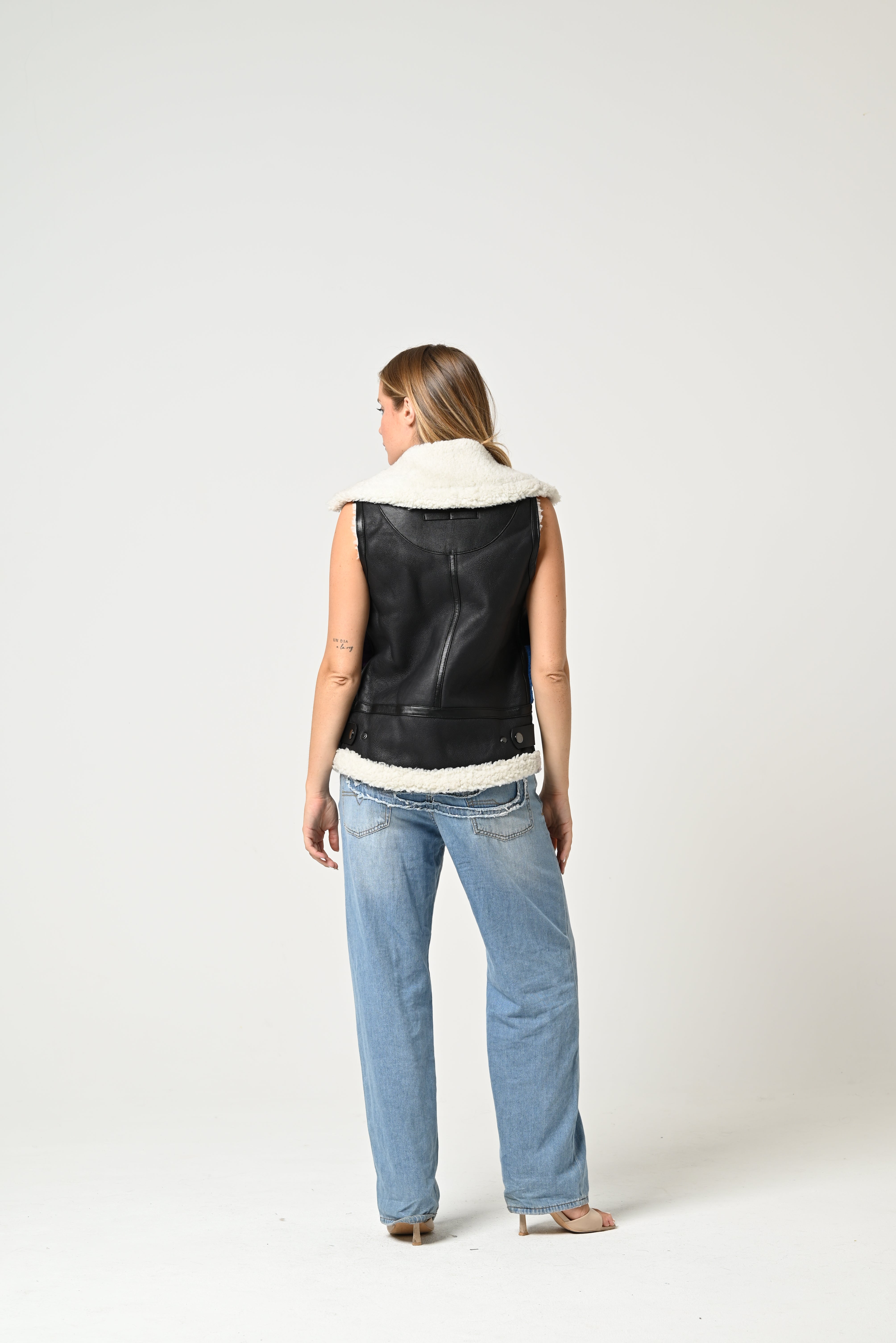La pelliccia è un gilet corto e senza maniche, caratterizzato da un design multicolore a blocchi: nero, bianco, rosso, rosa, viola e blu. Ha una texture soffice e vivace, con dettagli in pelle nera e bordature in pelliccia bianca che ne accentuano lo stile originale e moderno.