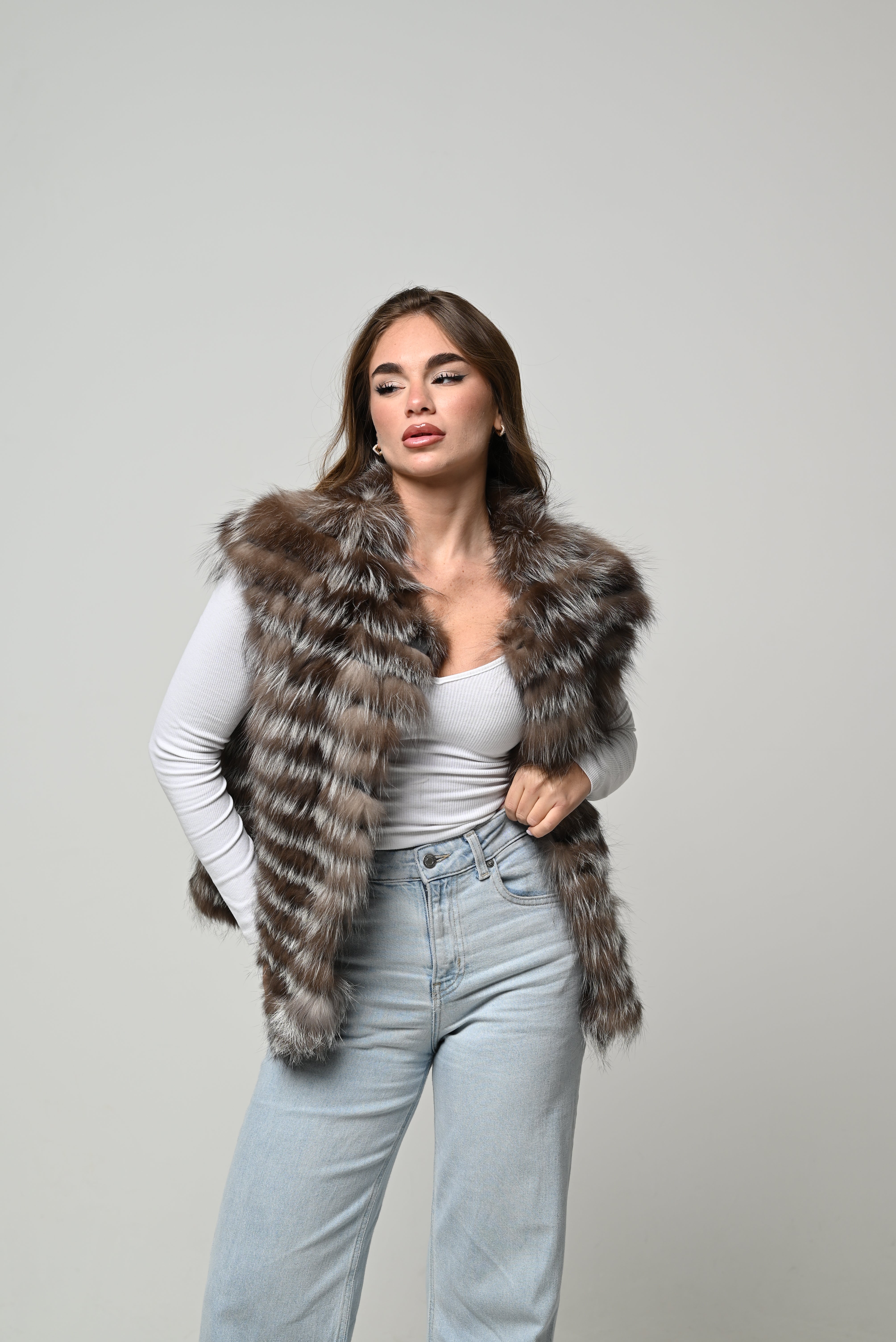 Pelliccia nuova in vera pelliccia naturale di volpe, modello smanicato con linea pulita e vestibilità regolare. Pelo lungo, pieno e ultra soffice, caratterizzato da eleganti sfumature nei toni del marrone, nocciola e grigio che donano profondità e luminosità al capo. Lavorazione a fasce orizzontali per un volume armonioso, spalle morbide e scollo aperto che valorizzano la silhouette in chiave moderna e femminile. Interno foderato per un comfort ottimale.